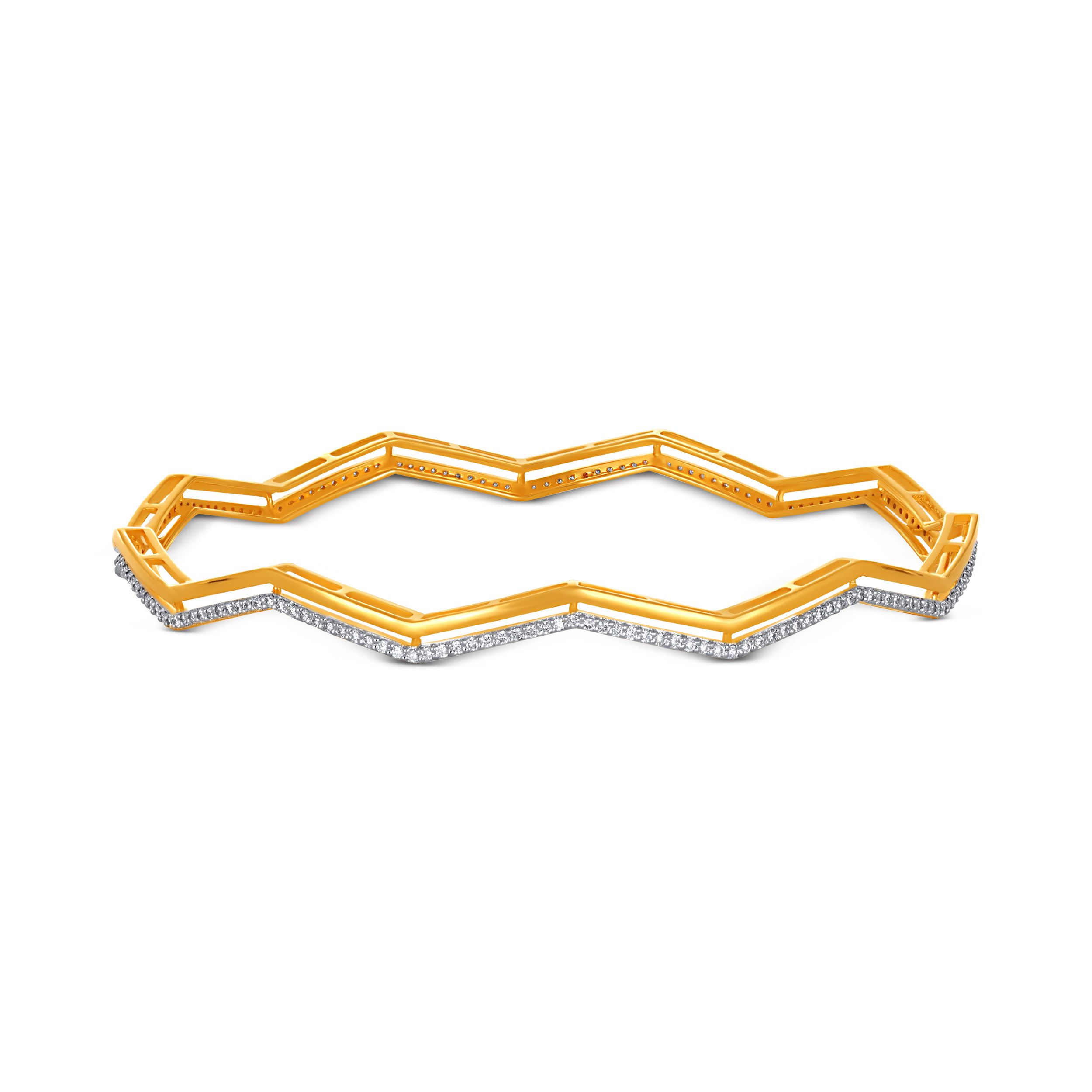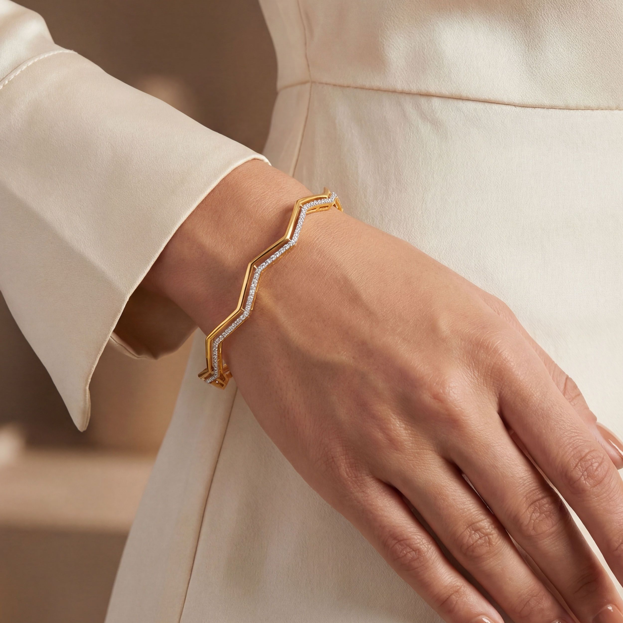 Break away from traditional silhouettes with this striking diamond bangle. Defined by geometric precision, it features a bold, rhythmic angular wave in gold, traced with diamonds for a sharp, modern edge. Structured yet fluid, it brings movement to the wrist with a refined finish. Style it with power tailoring or a silk slip dress for a look that feels confident, contemporary, and elevated.