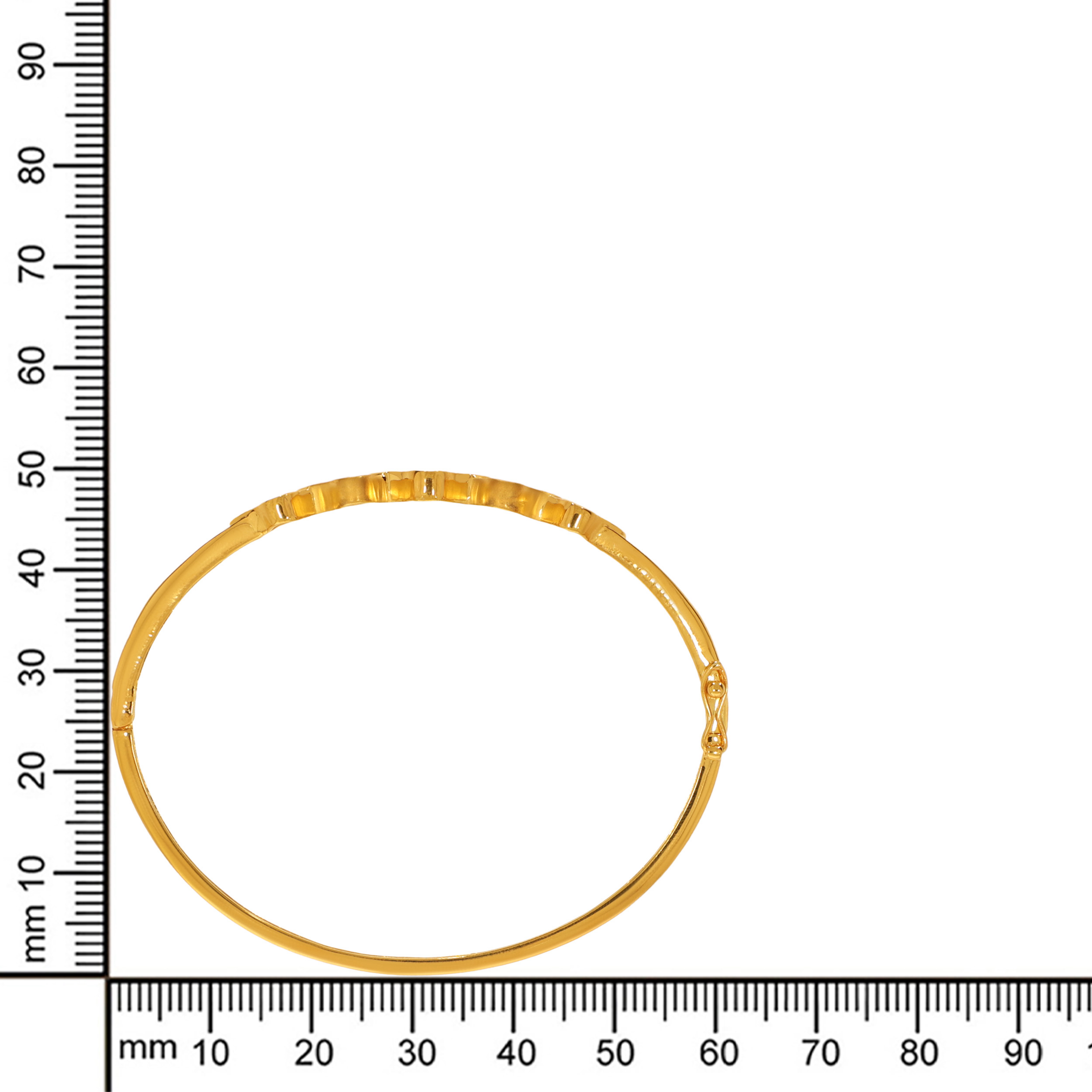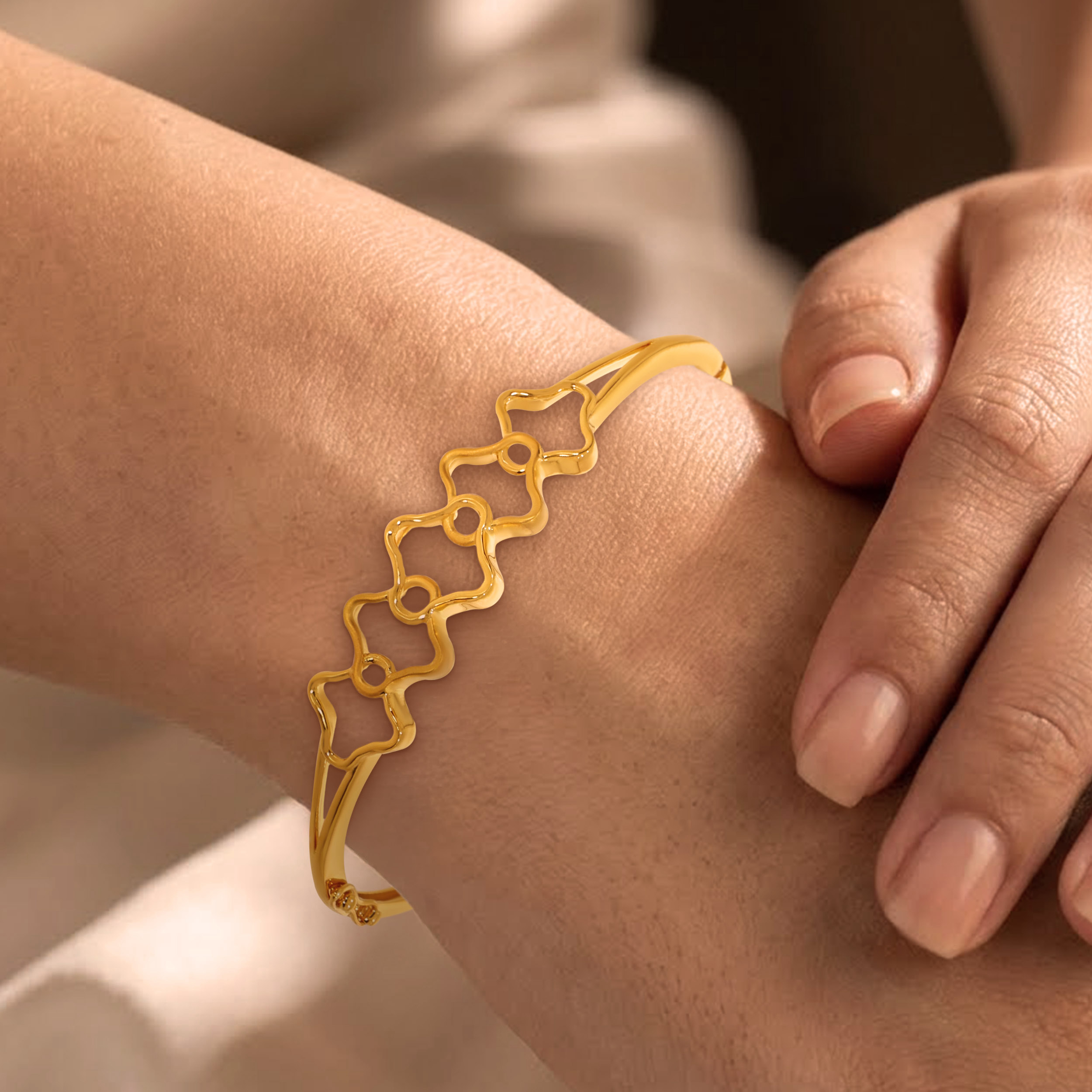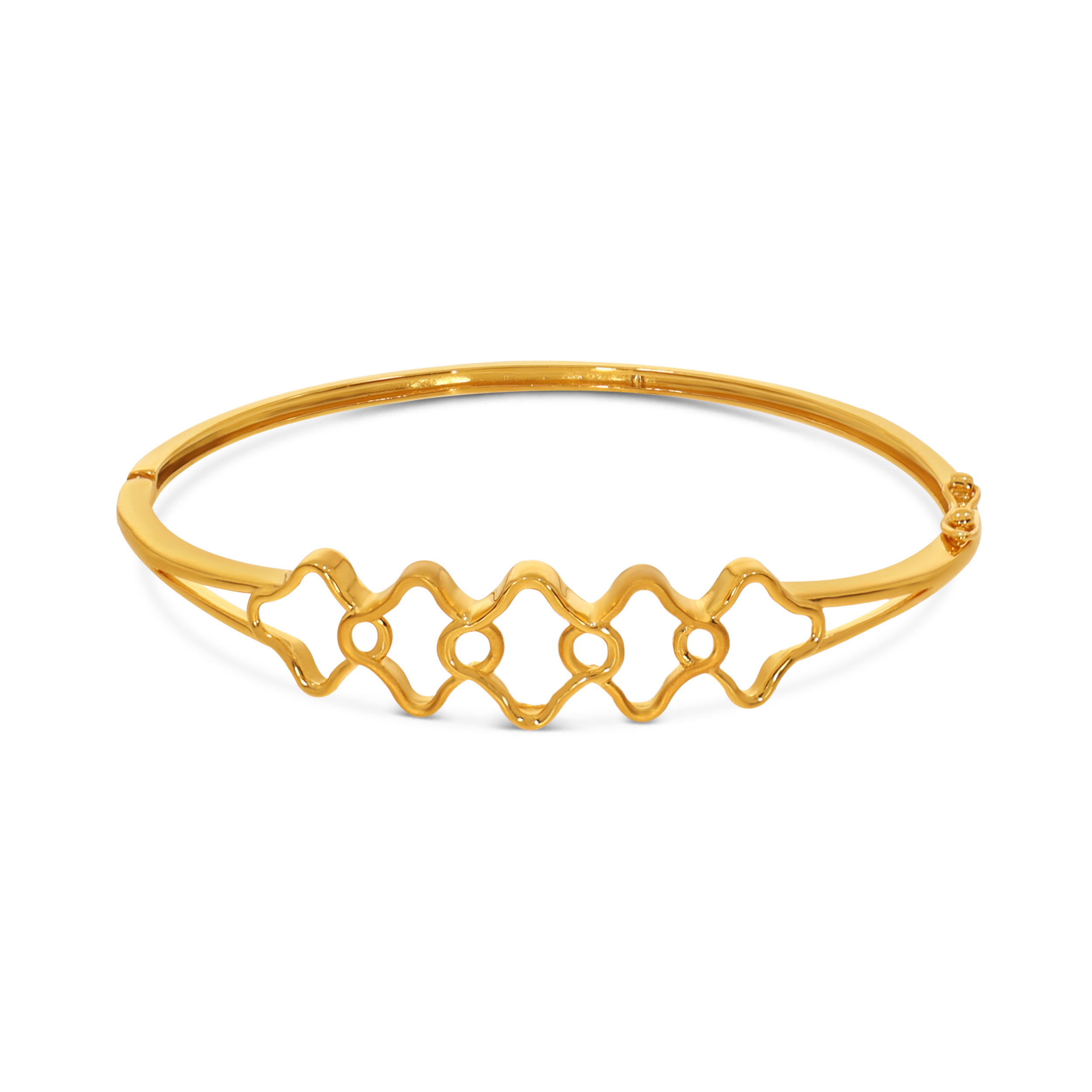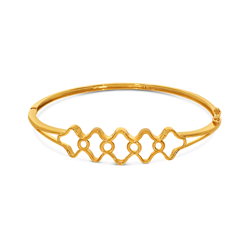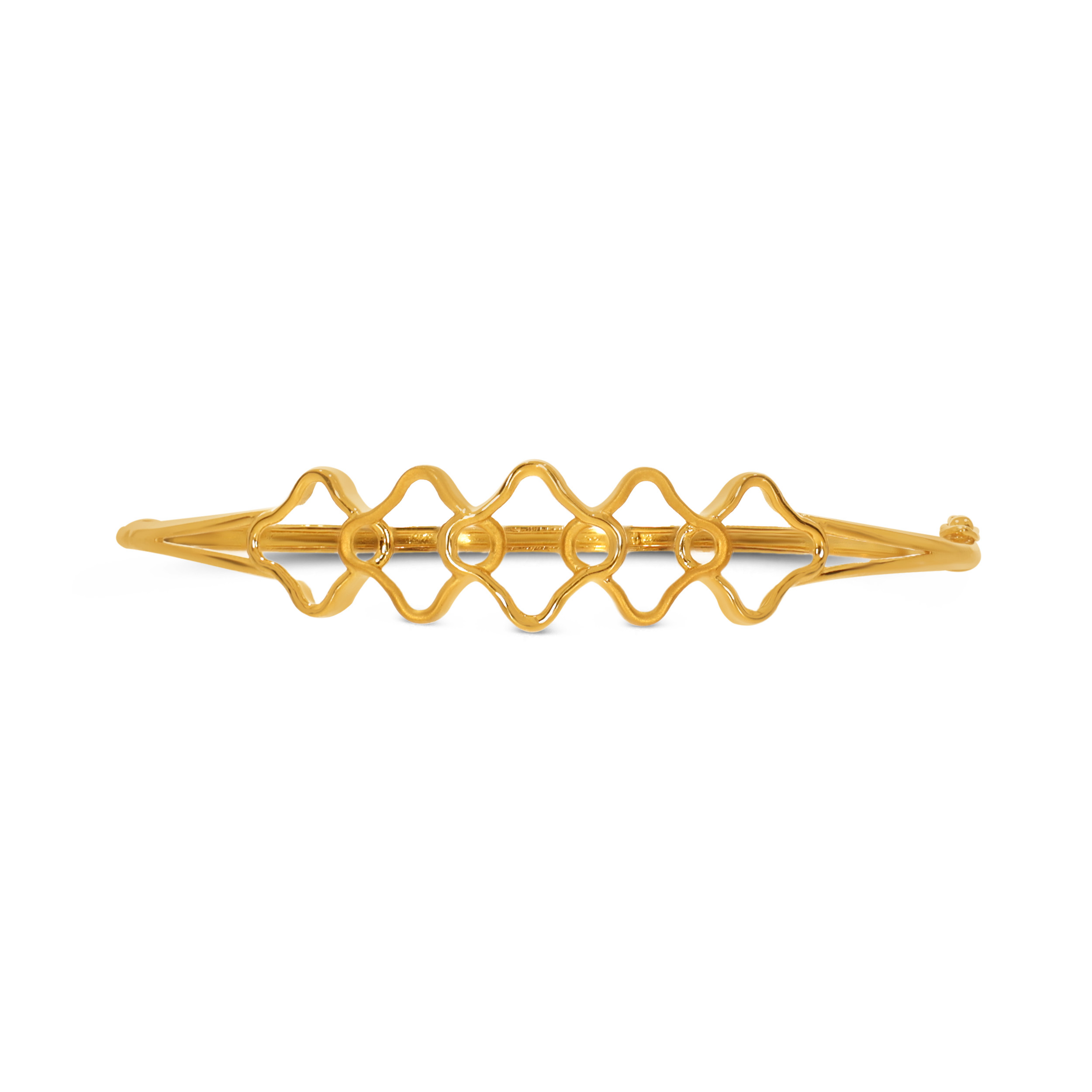 A modern take on minimalism, this lightweight gold chur features a rhythmic series of interlocking quatrefoil motifs. Clean, polished lines create a subtle play of light and shadow. Balanced between classic charm and contemporary style, it moves effortlessly from workday wear to celebratory evenings.