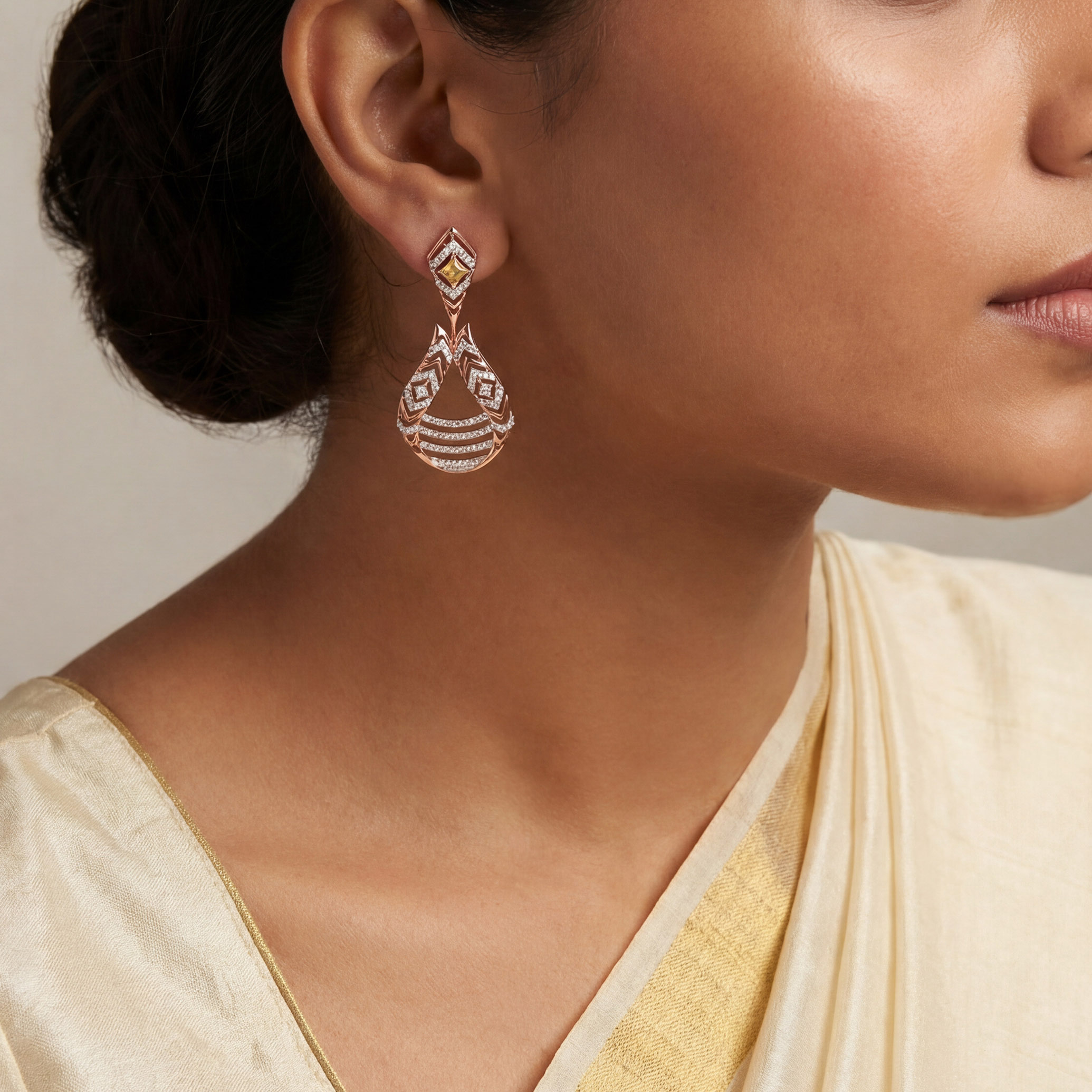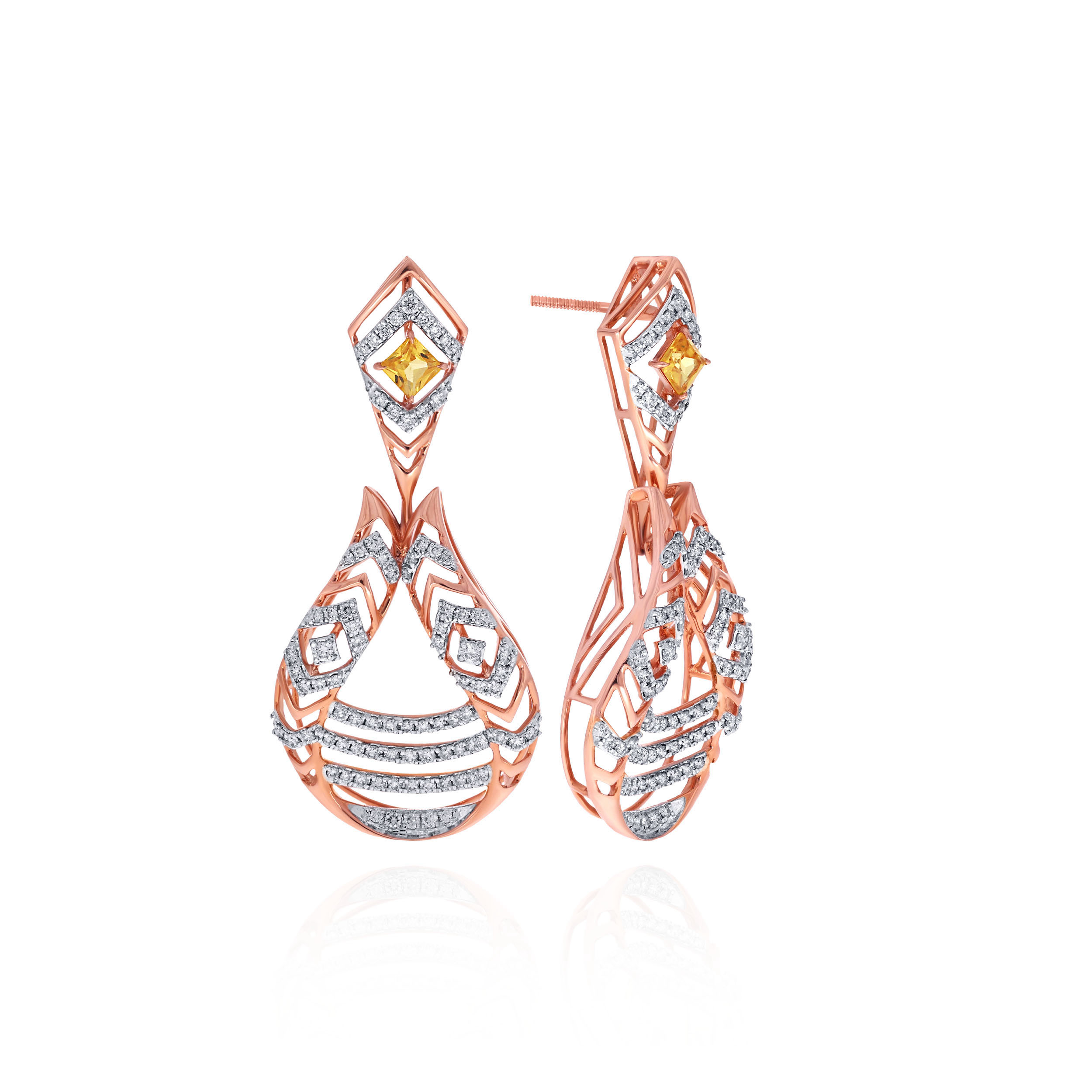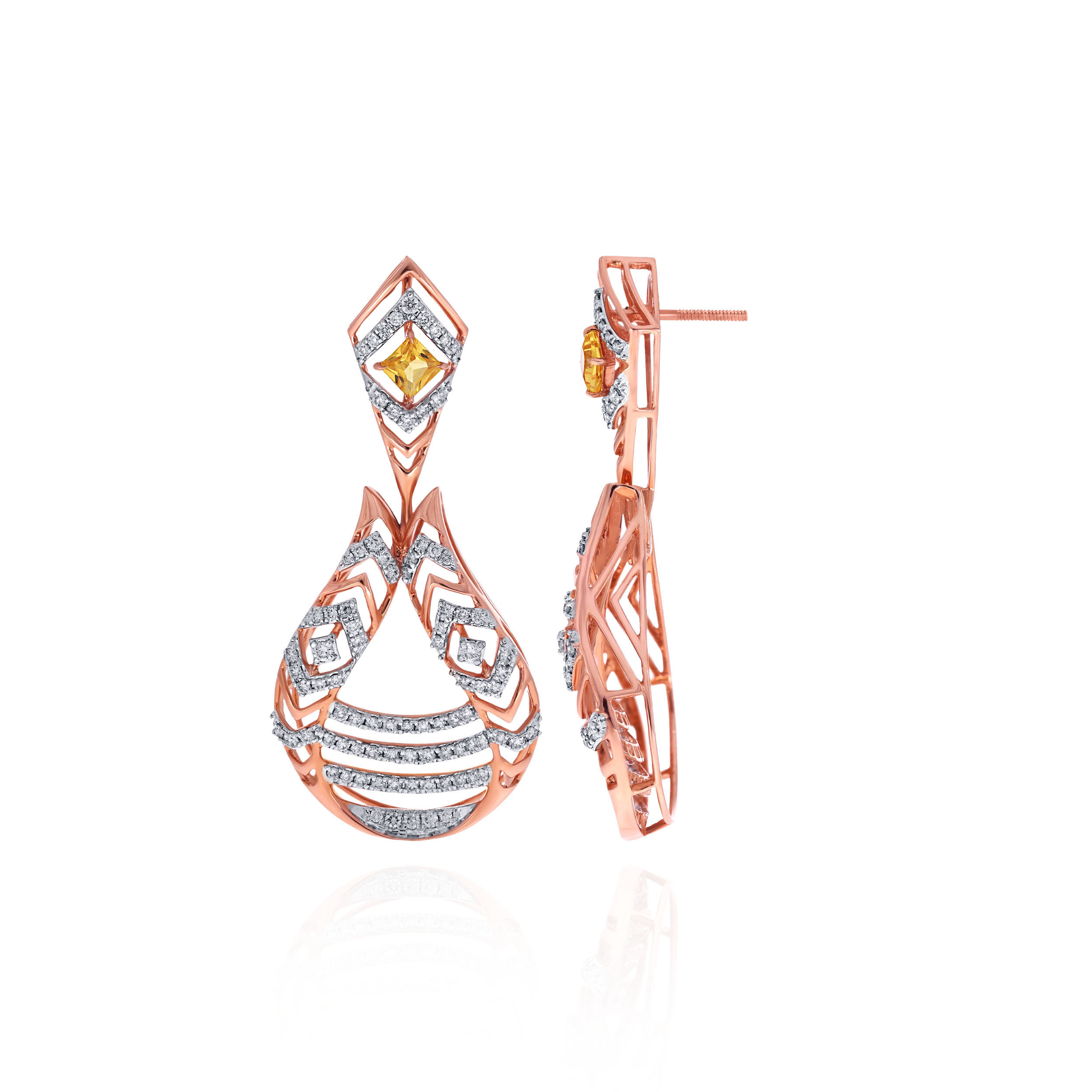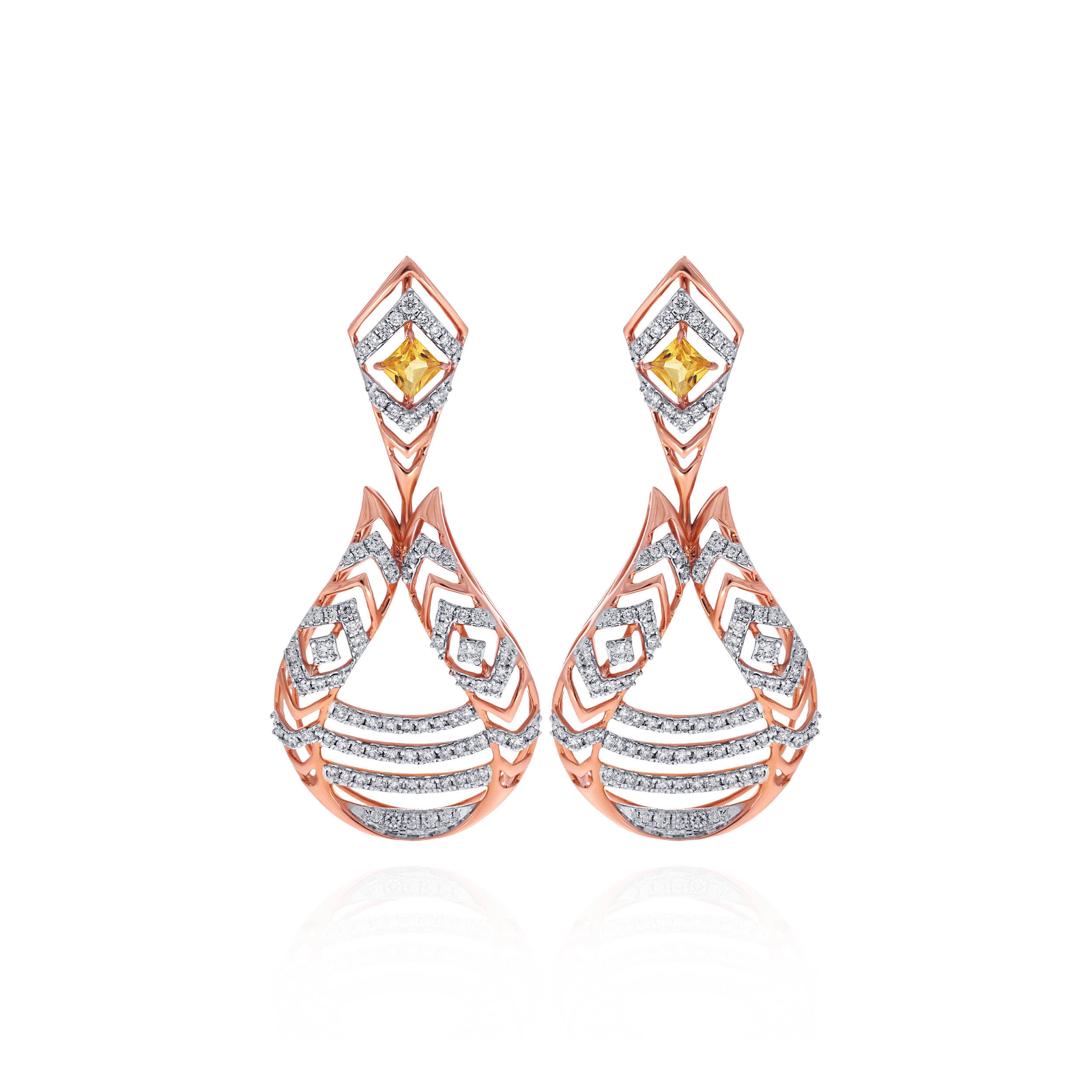 Captivate every gaze with these intricately crafted diamond drop earrings, showcasing a flowing cascade of chevron patterns set with shimmering diamonds. Accented by striking yellow gemstones, the architectural silhouette offers radiant sparkle and refined elegance, ideal for soirées and elevated evening wear.