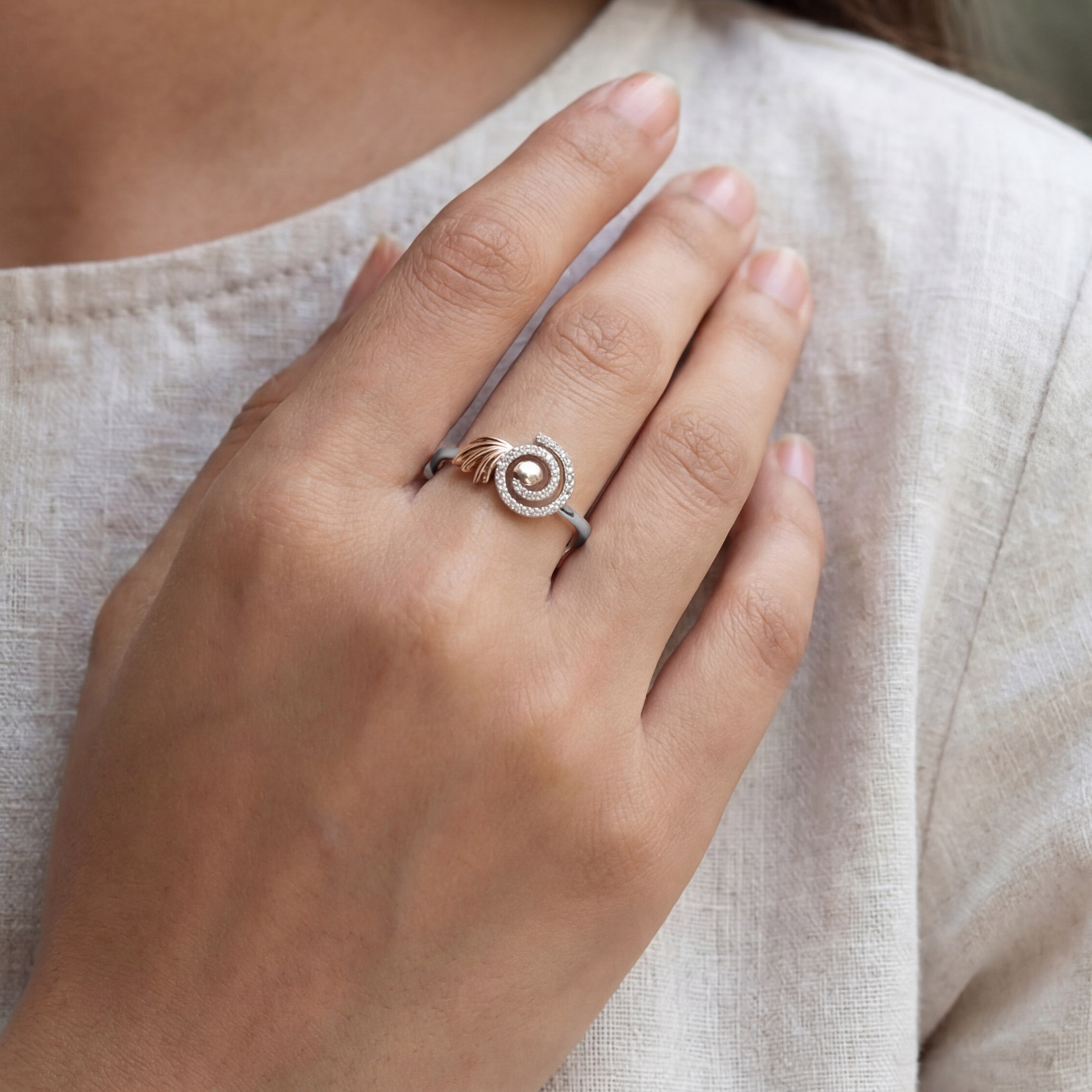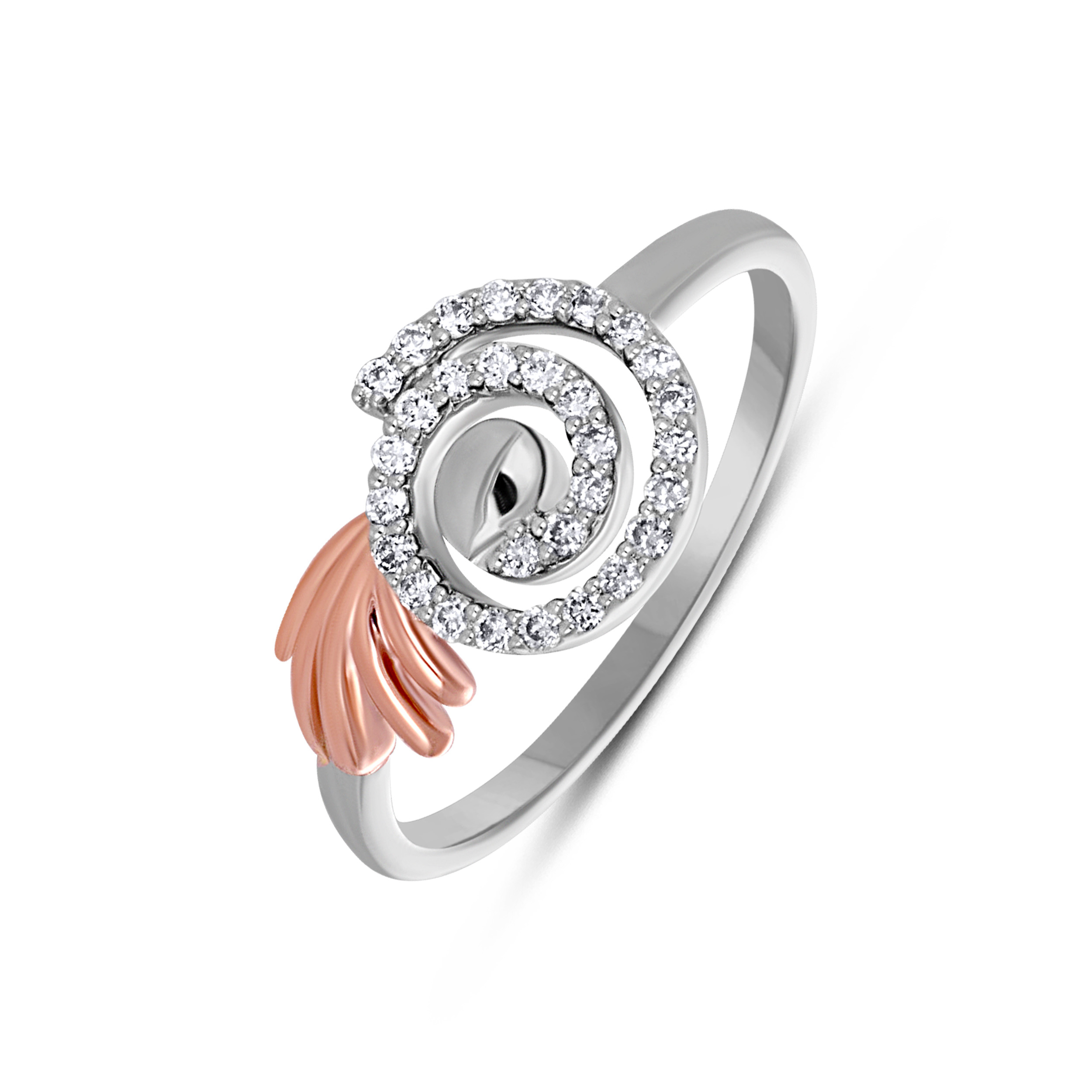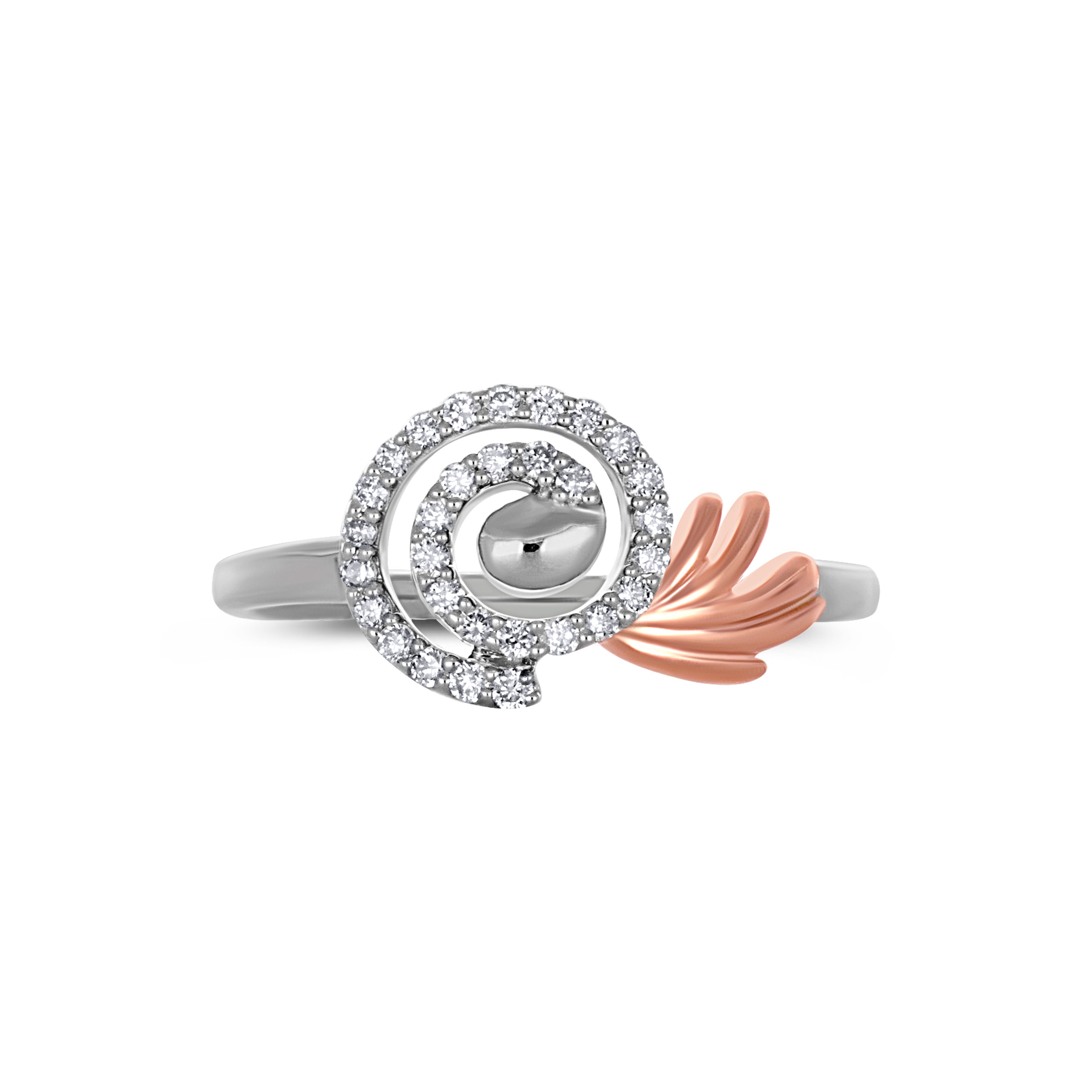 Step into a world of fluid elegance with this artistic platinum diamond ring. Crafted in a graceful spiral motif and encrusted with shimmering diamonds, the design is complemented by a beautifully sculpted blush-toned accent, reminiscent of a delicate wing in motion. Expressive yet refined, this piece is made to elevate occasion wear and shine with effortless sophistication.