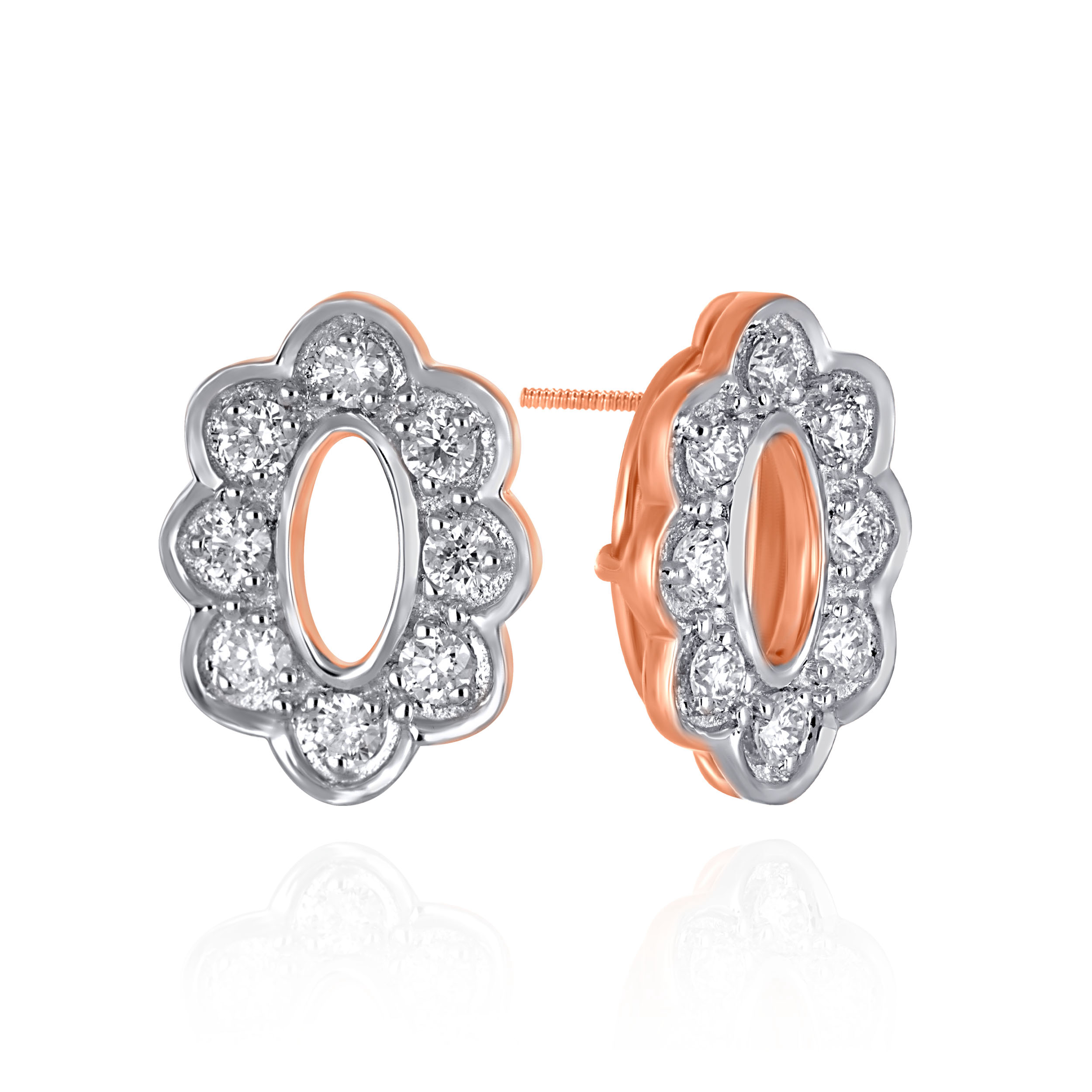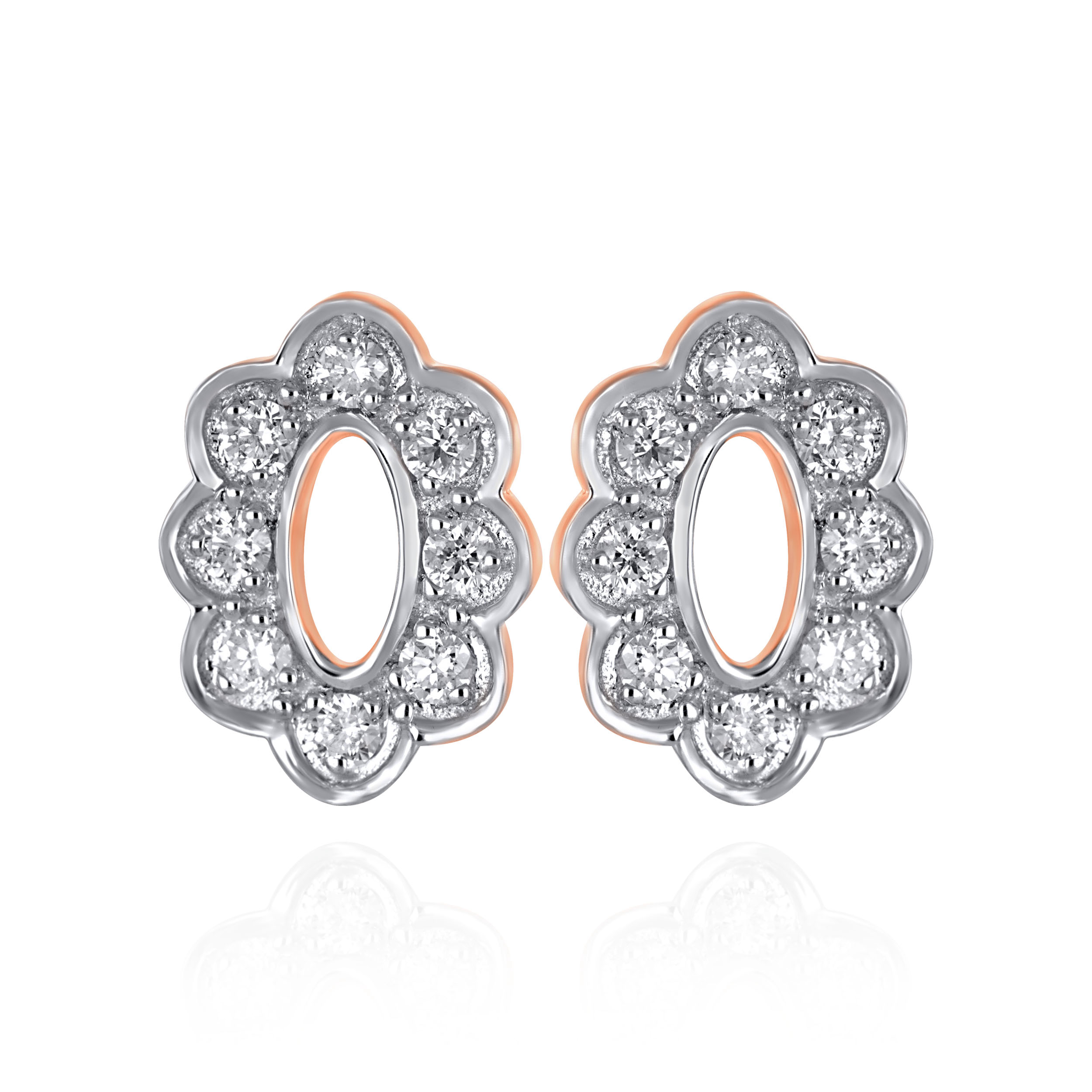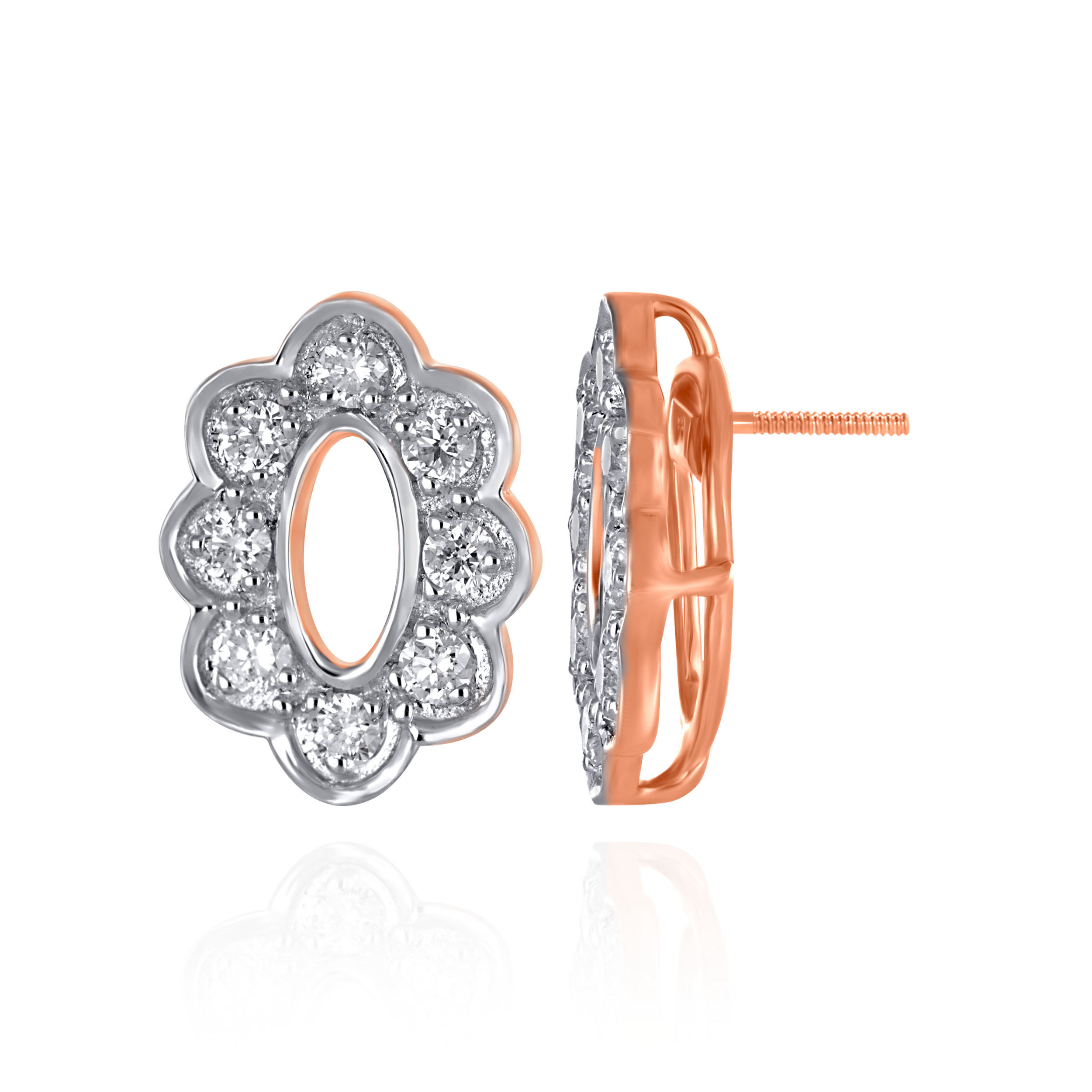 Embrace timeless femininity with these stunning diamond studs crafted in gold. Showcasing an elegant oval silhouette framed by a shimmering floral halo, the design balances classic luxury with modern sophistication. Style them with a silk saree, pastel fits, or a tailored evening dress for a touch of refined sparkle.