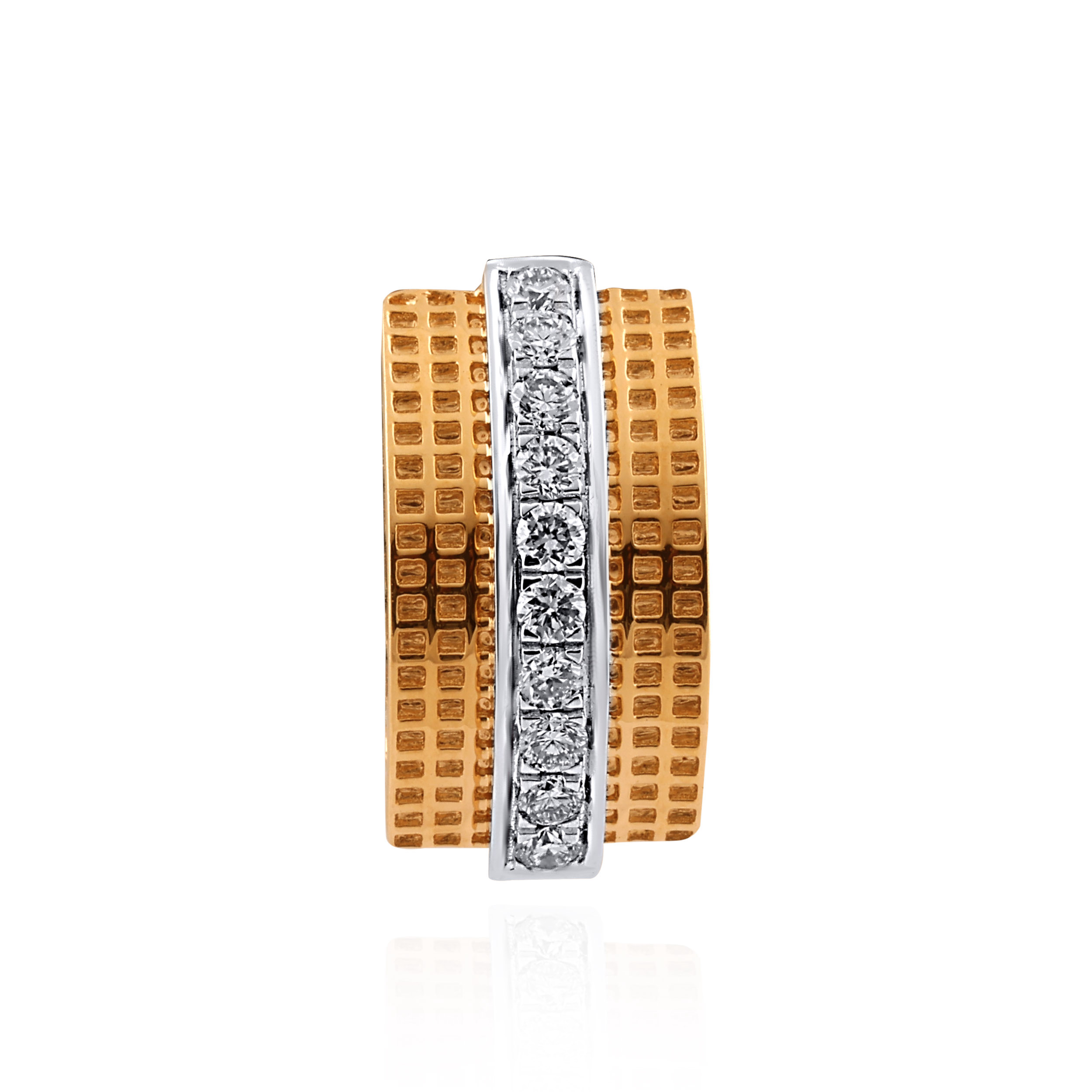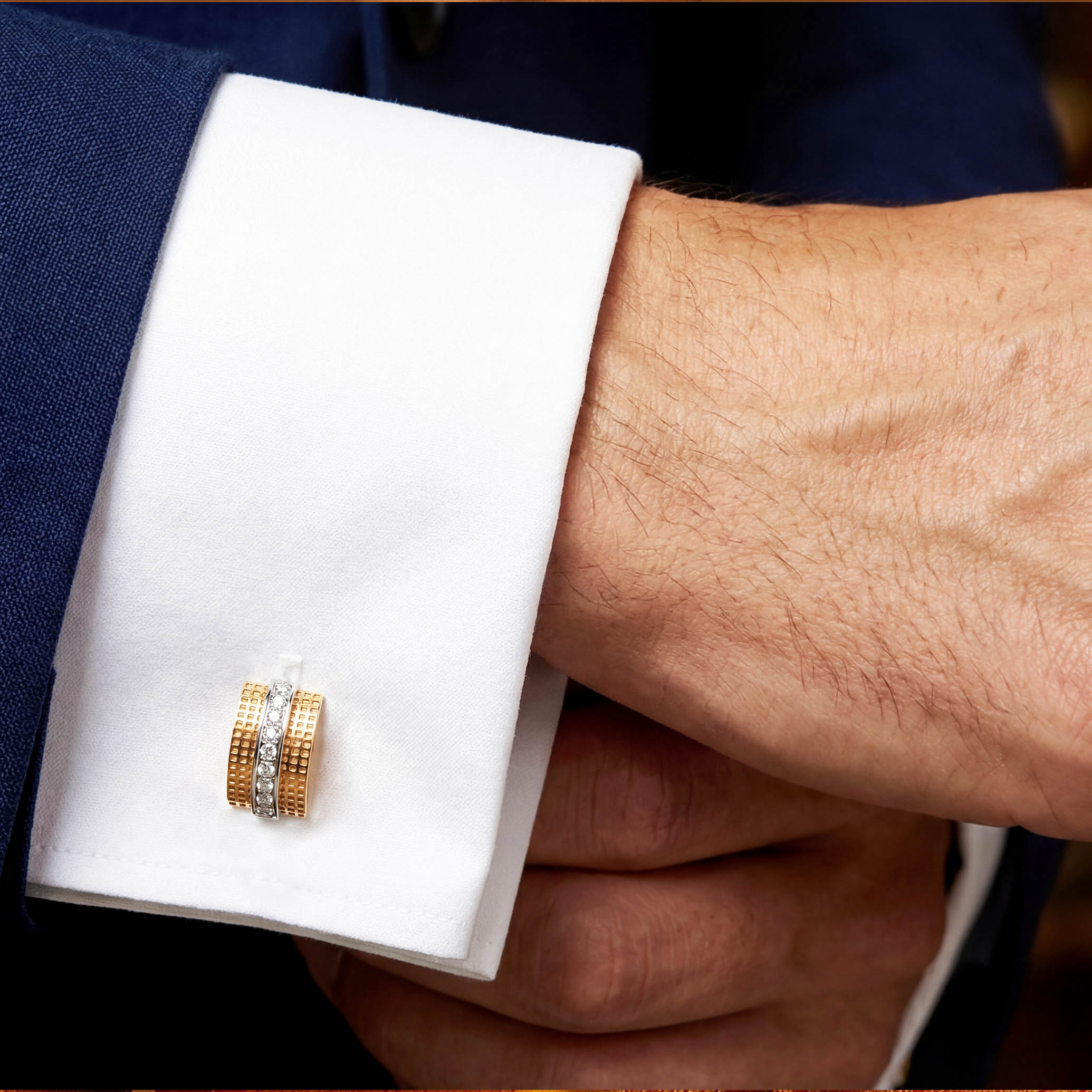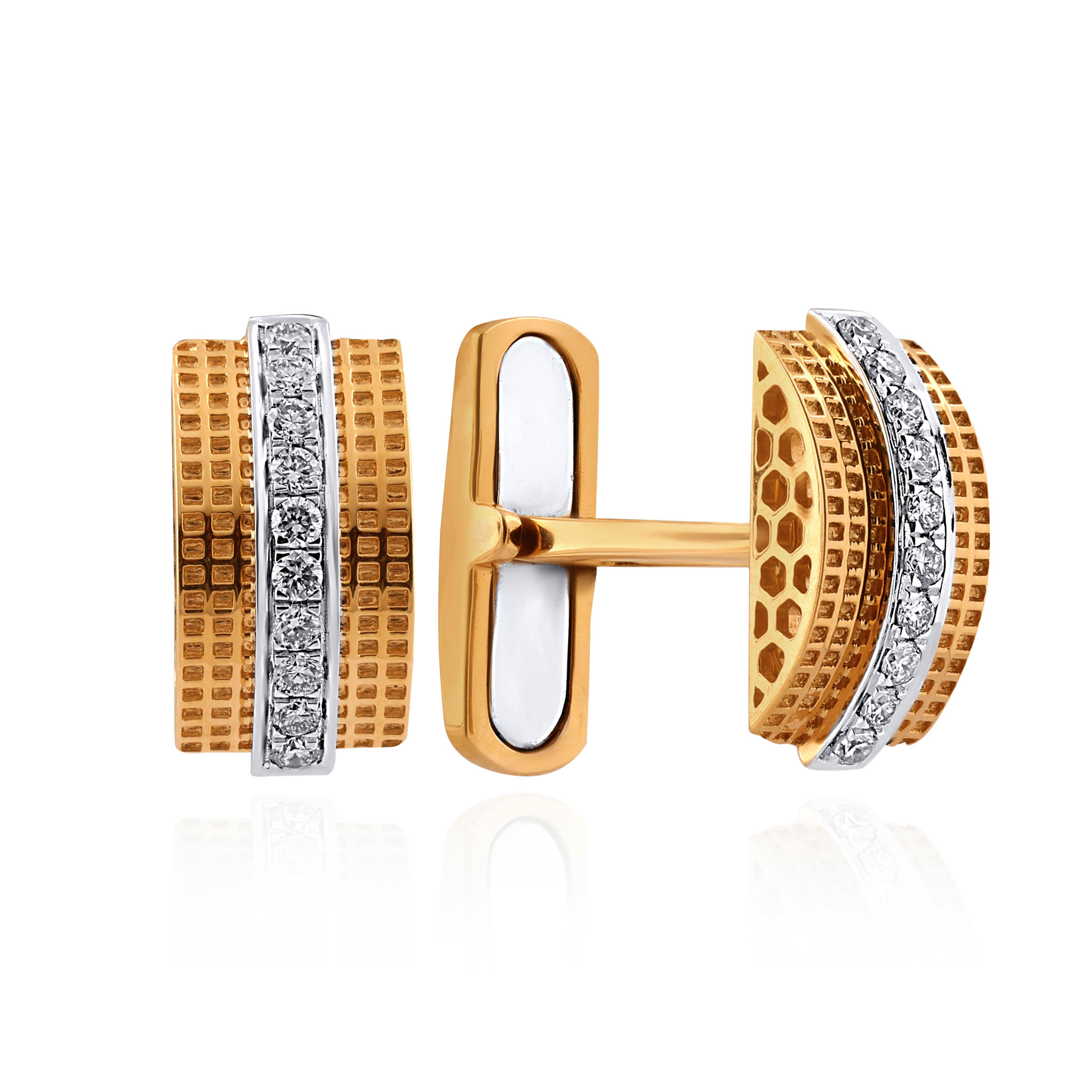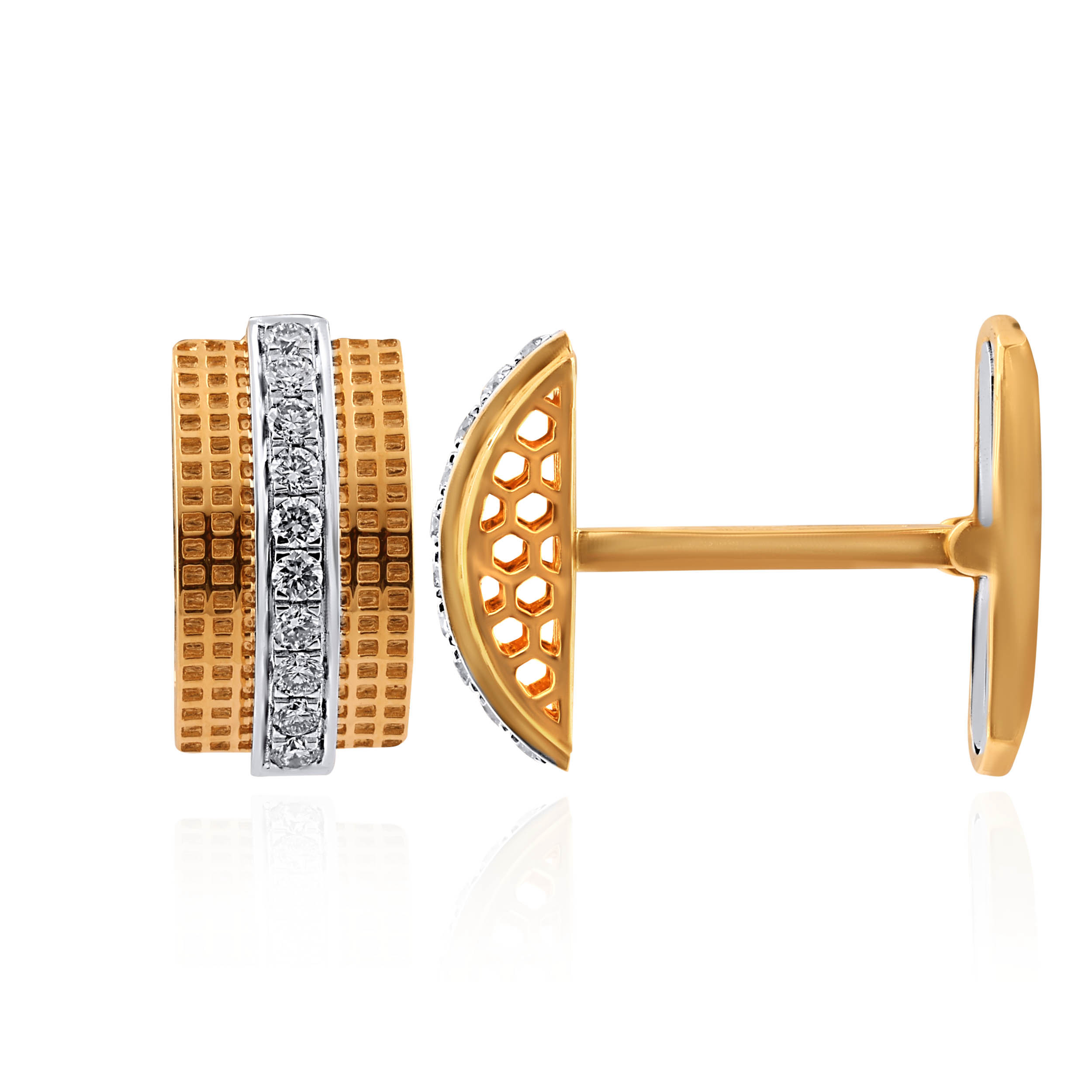 A statement of quiet power and refined taste, these diamond cufflinks are crafted for the modern gentleman. Designed in rich gold, they feature a meticulously textured grid pattern, contrasted with a sleek vertical line of diamonds set in rhodium polish. Perfect for boardroom elegance, formal evenings, and timeless gifting.