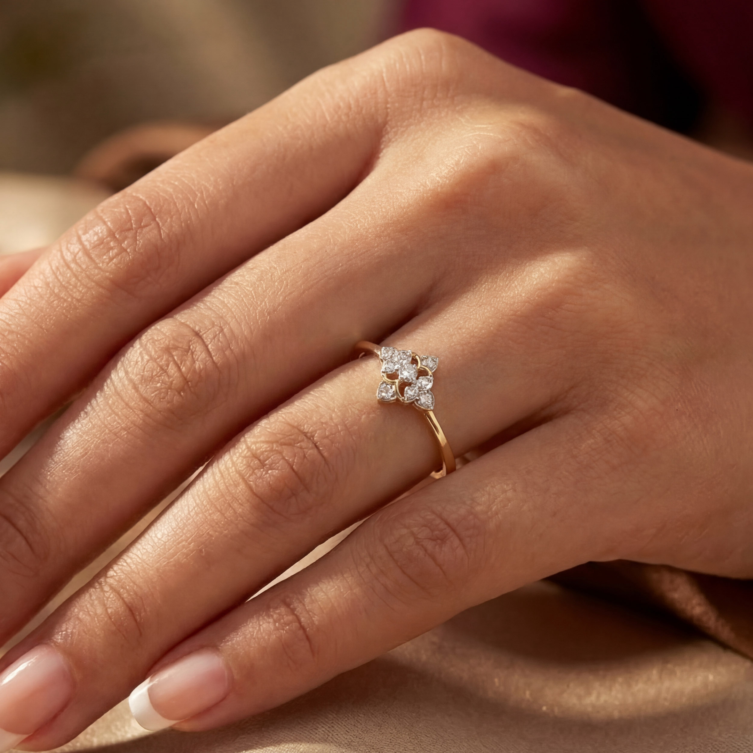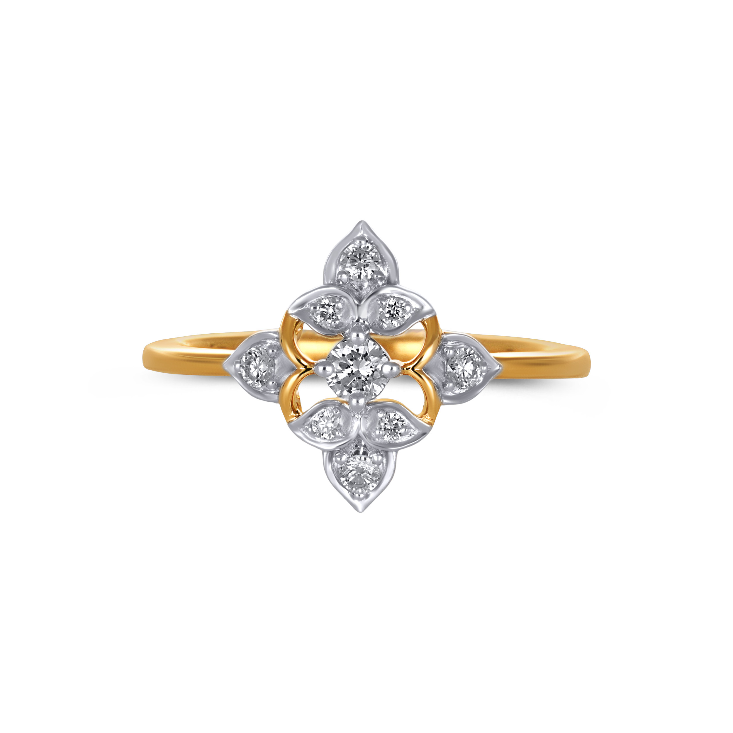 Blending nostalgic charm with sophisticated sparkle, this diamond ring set in radiant gold celebrates the timeless allure of the past. Intricate petal accents lend a romantic, heirloom-inspired touch. Pair it with soft pastels, vintage-inspired prints, or classic saris for a refined, feminine look.