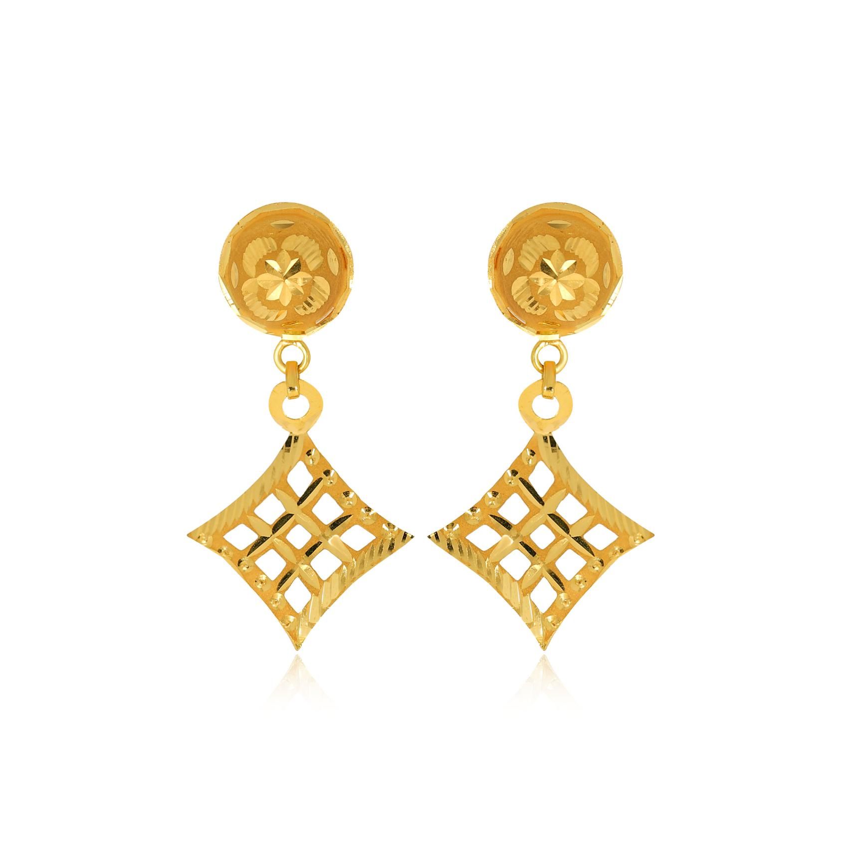 Crafted to be classic and trendy, these 22K gold drop earrings are designed with a rhombus motif adorned with chillai work in a lattice pattern. The floral motif in the upper part adds to its feminine charm
