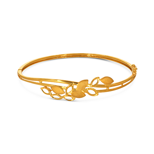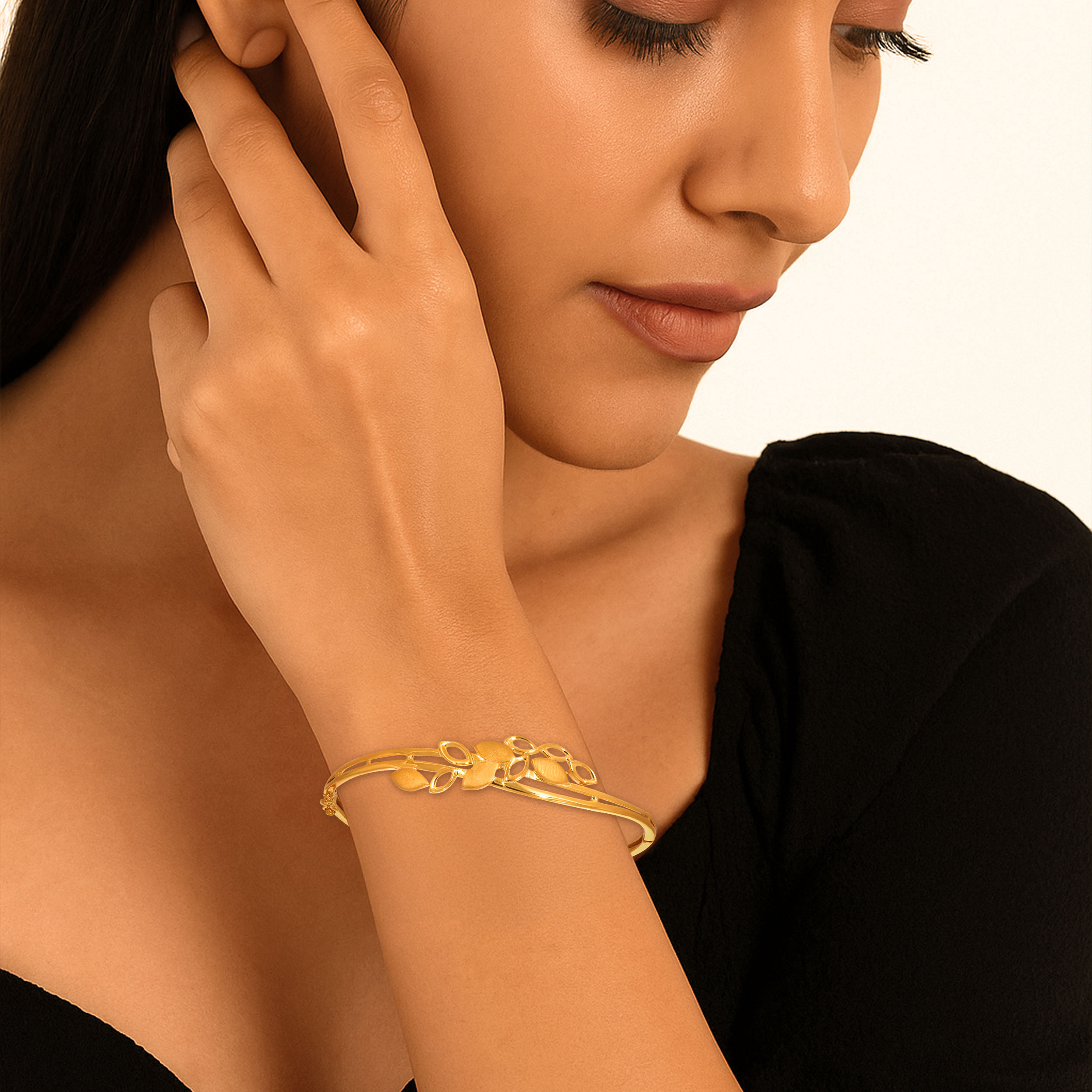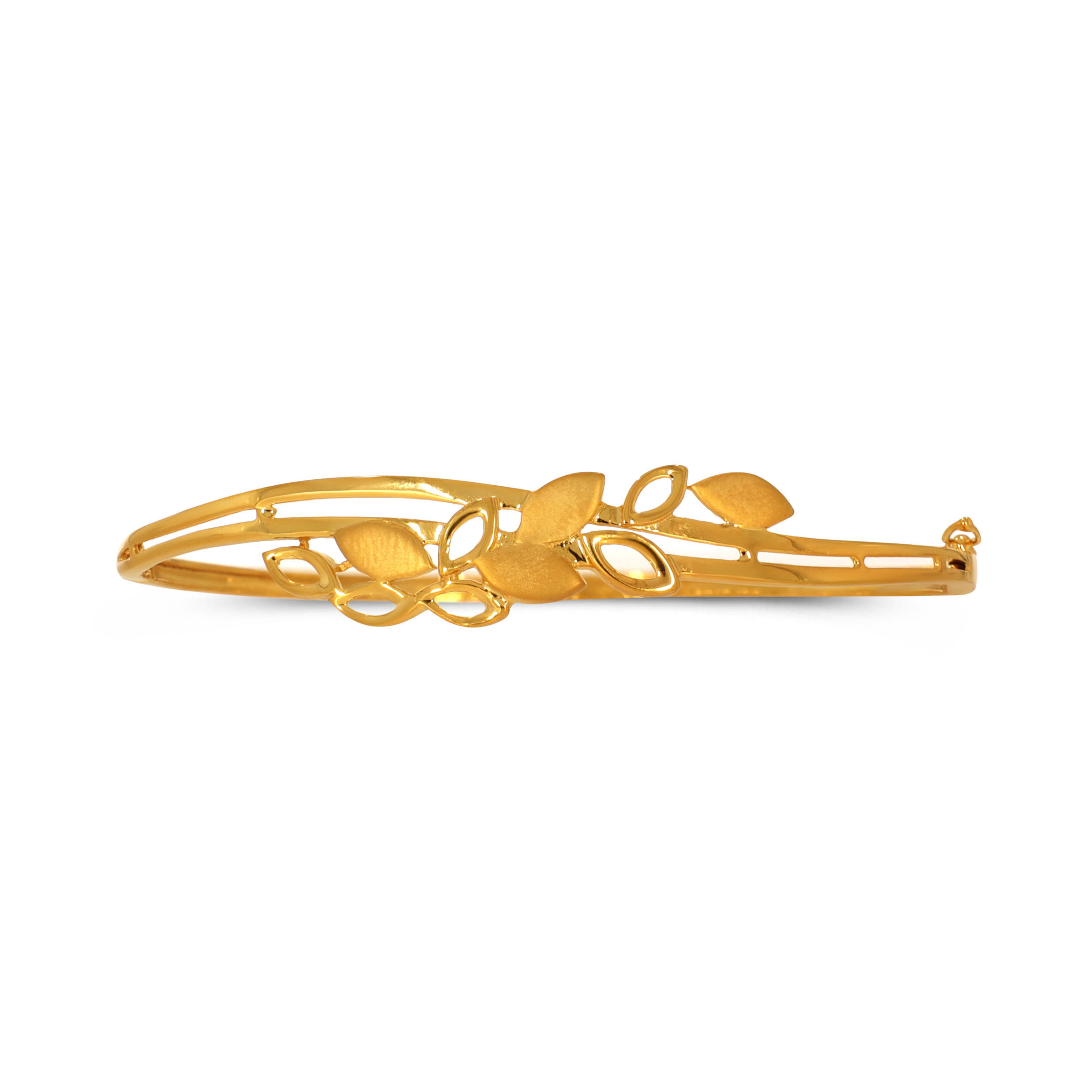 Elevate your everyday fit with a piece that mimics the rhythmic beauty of nature. Fluid, nature-inspired curvature with leaf accents, this chur bangle delivers impeccable artistry with its light, contemporary design. It seamlessly blends into your wardrobe, bringing organic elegance to your attire.