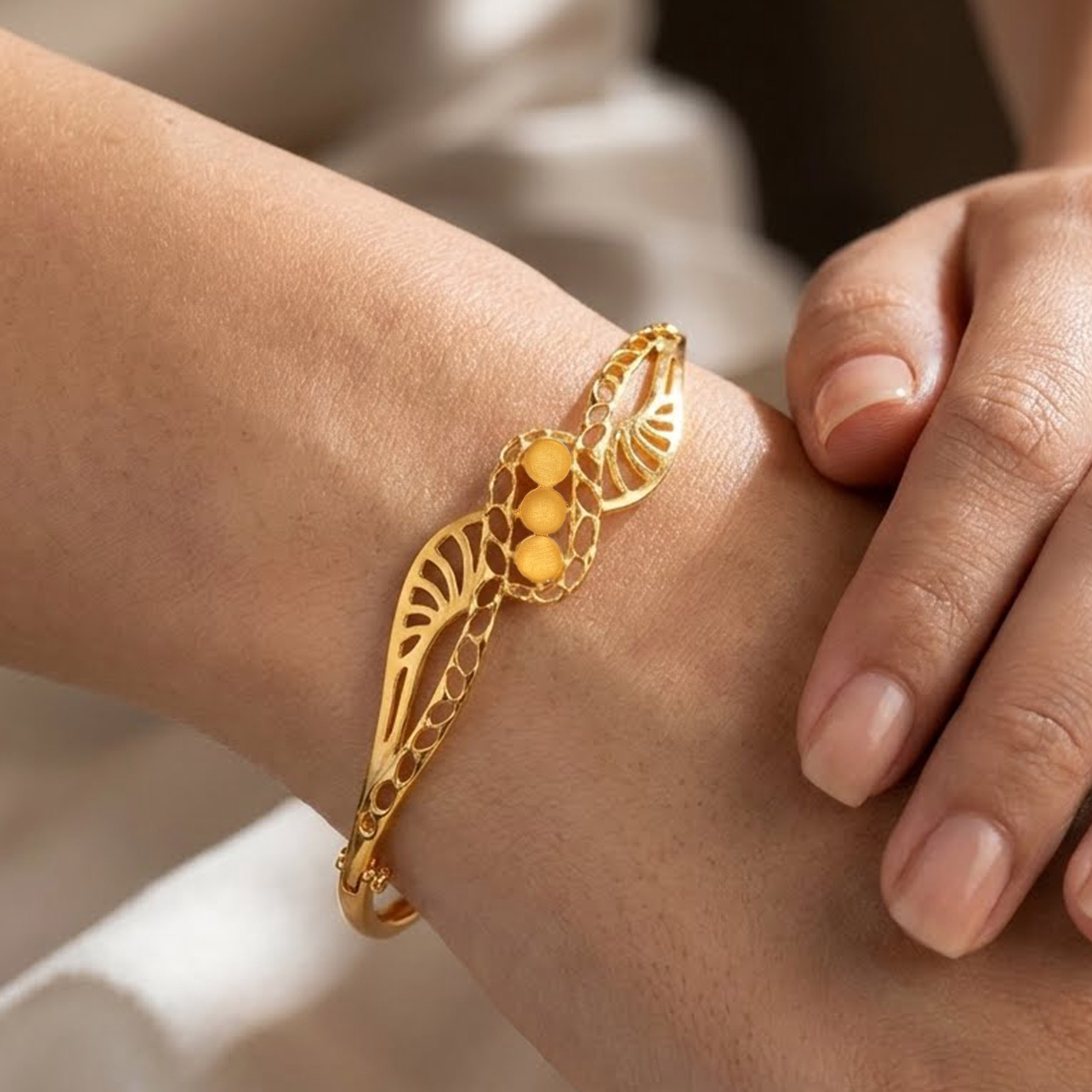 Define your style with this unique gold churi bangle, designed with a confident balance of form and finesse, set against an artistic backdrop of delicate patterns and refined textures. It complements everything from everyday classics to thoughtfully styled festive looks.