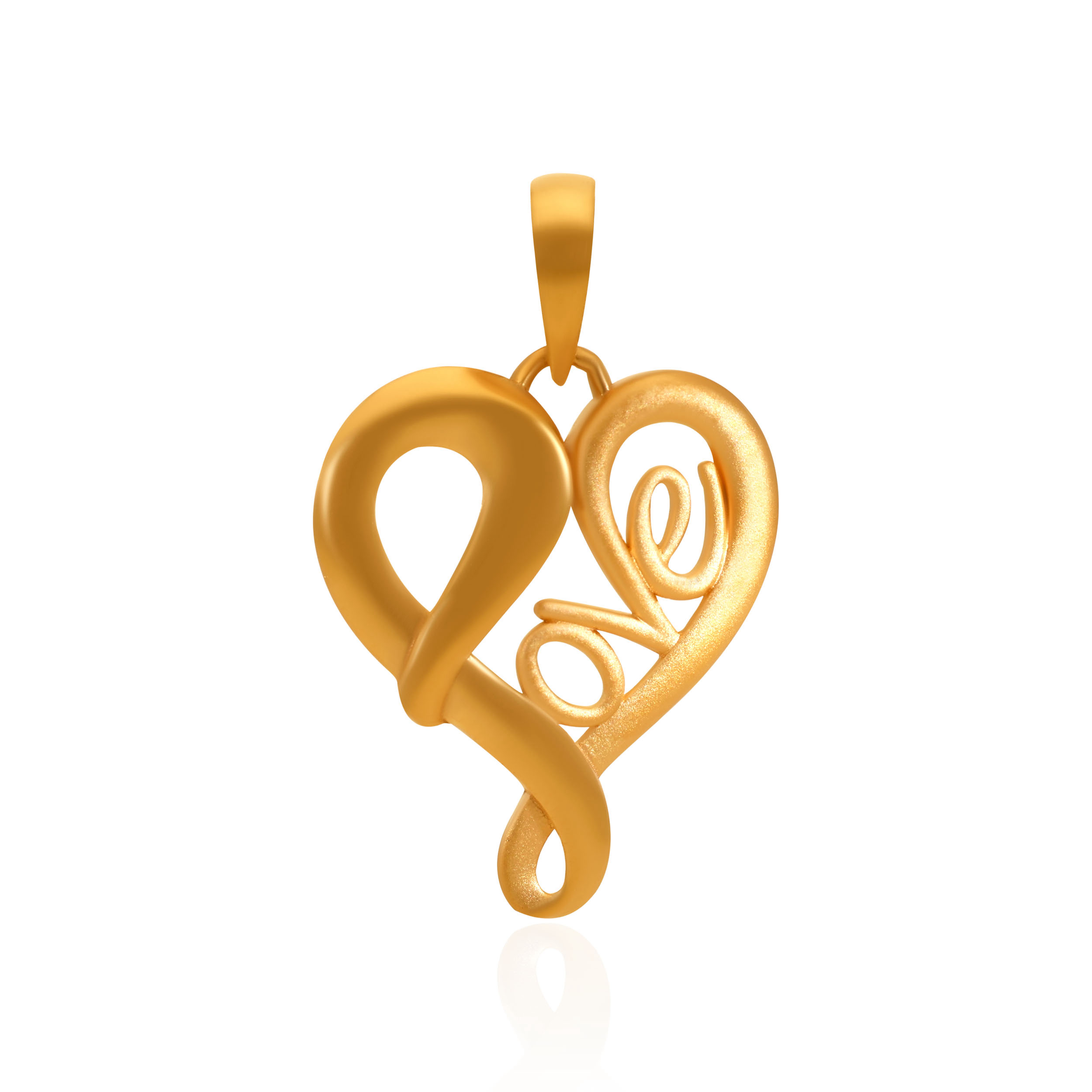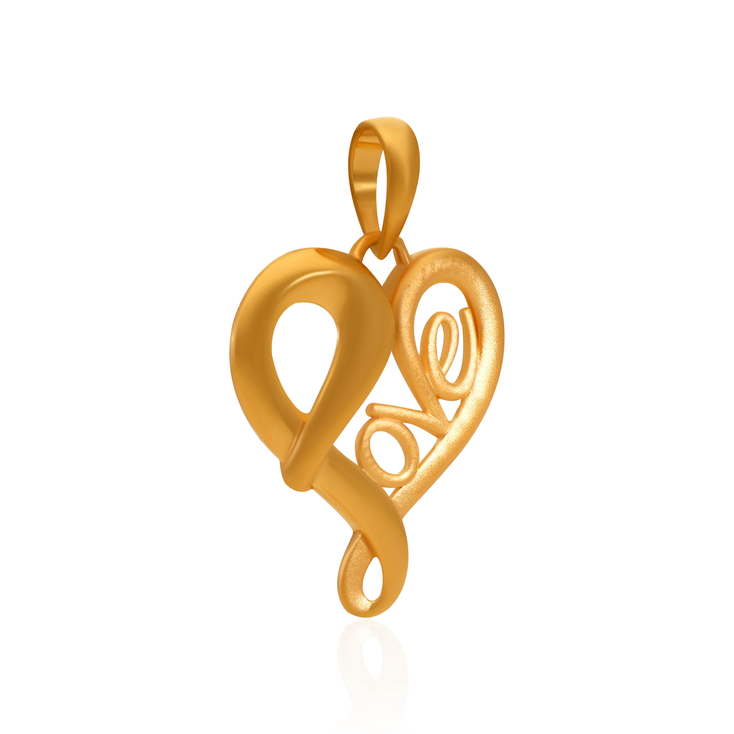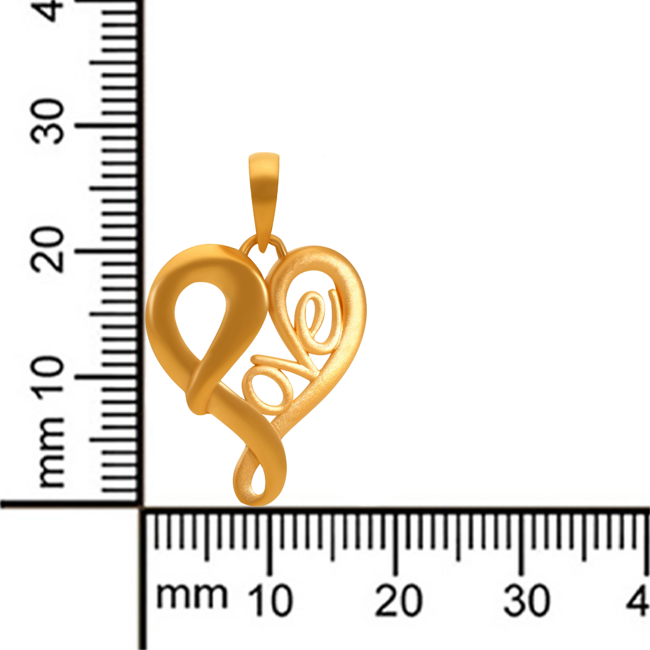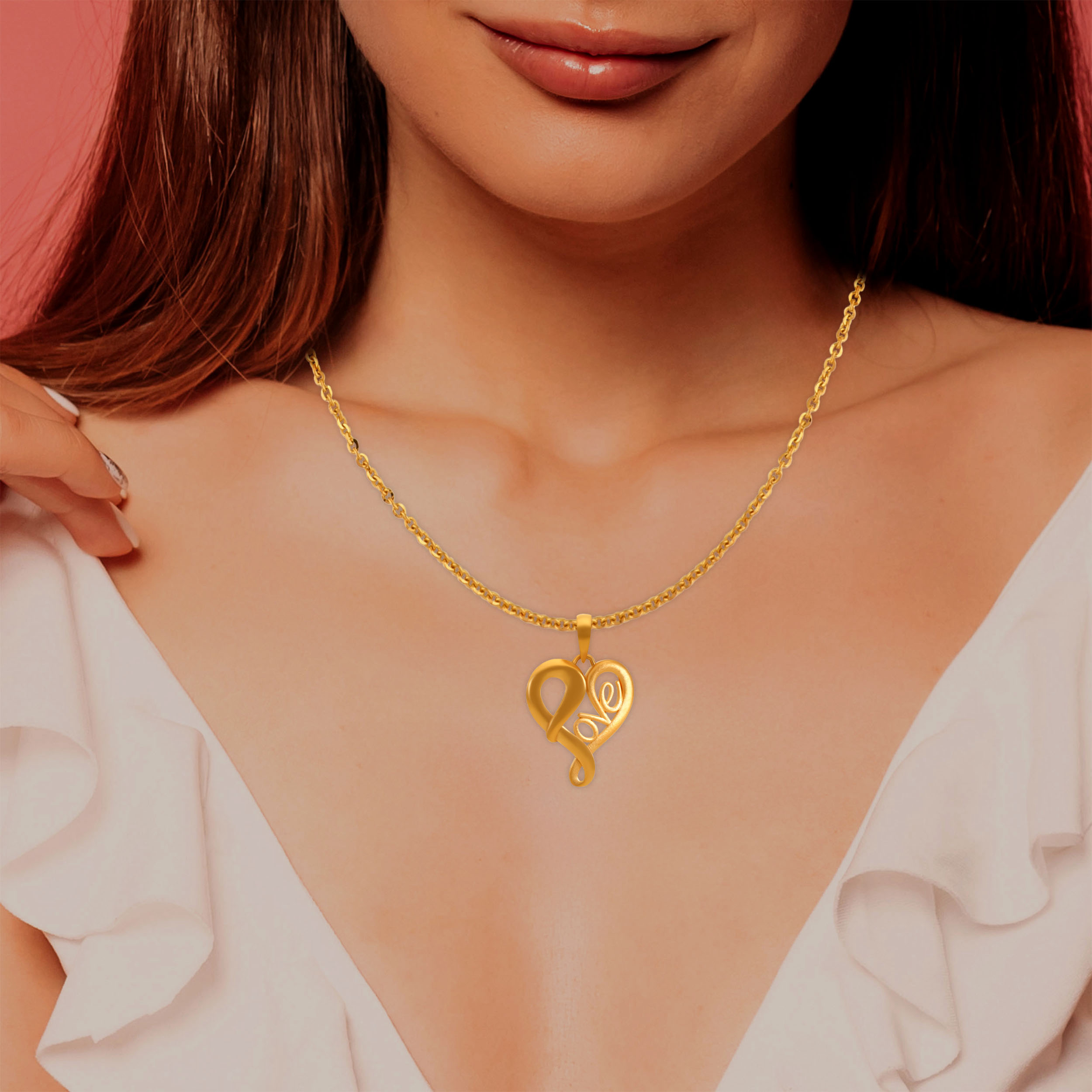 This contemporary gold pendant reinterprets the heart as fluid typography, shaping the word love through sculptural form. A matte-textured “L” flows into a high-polish “ove,” creating contrast and movement through dual finishes. Designed as a refined statement, it speaks to those who appreciate emotion expressed through modern design.