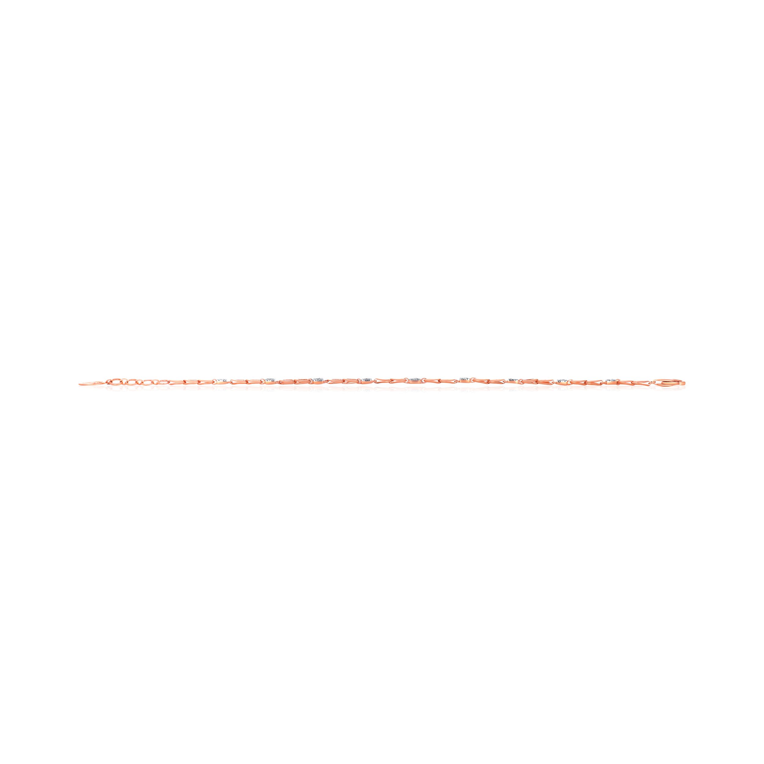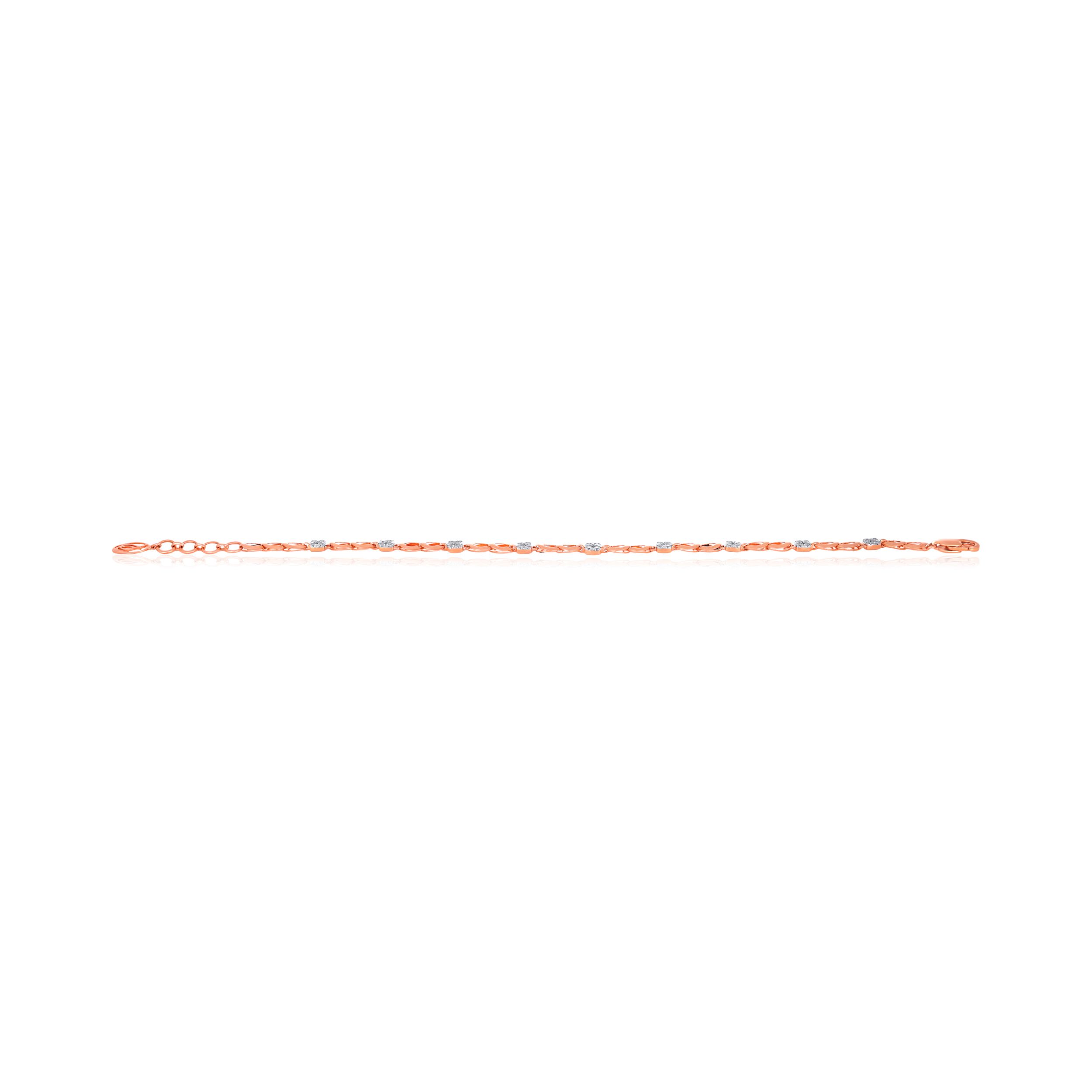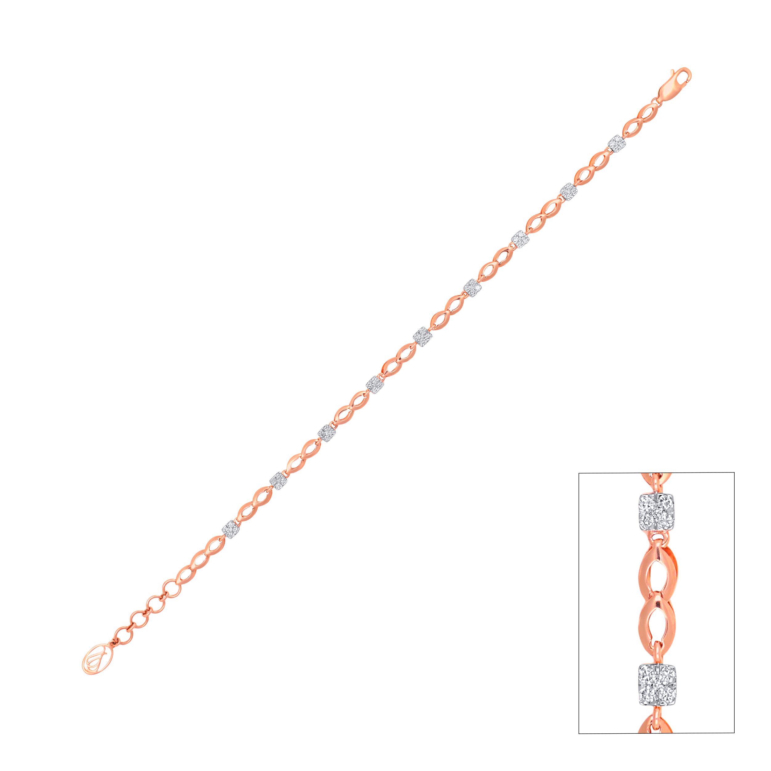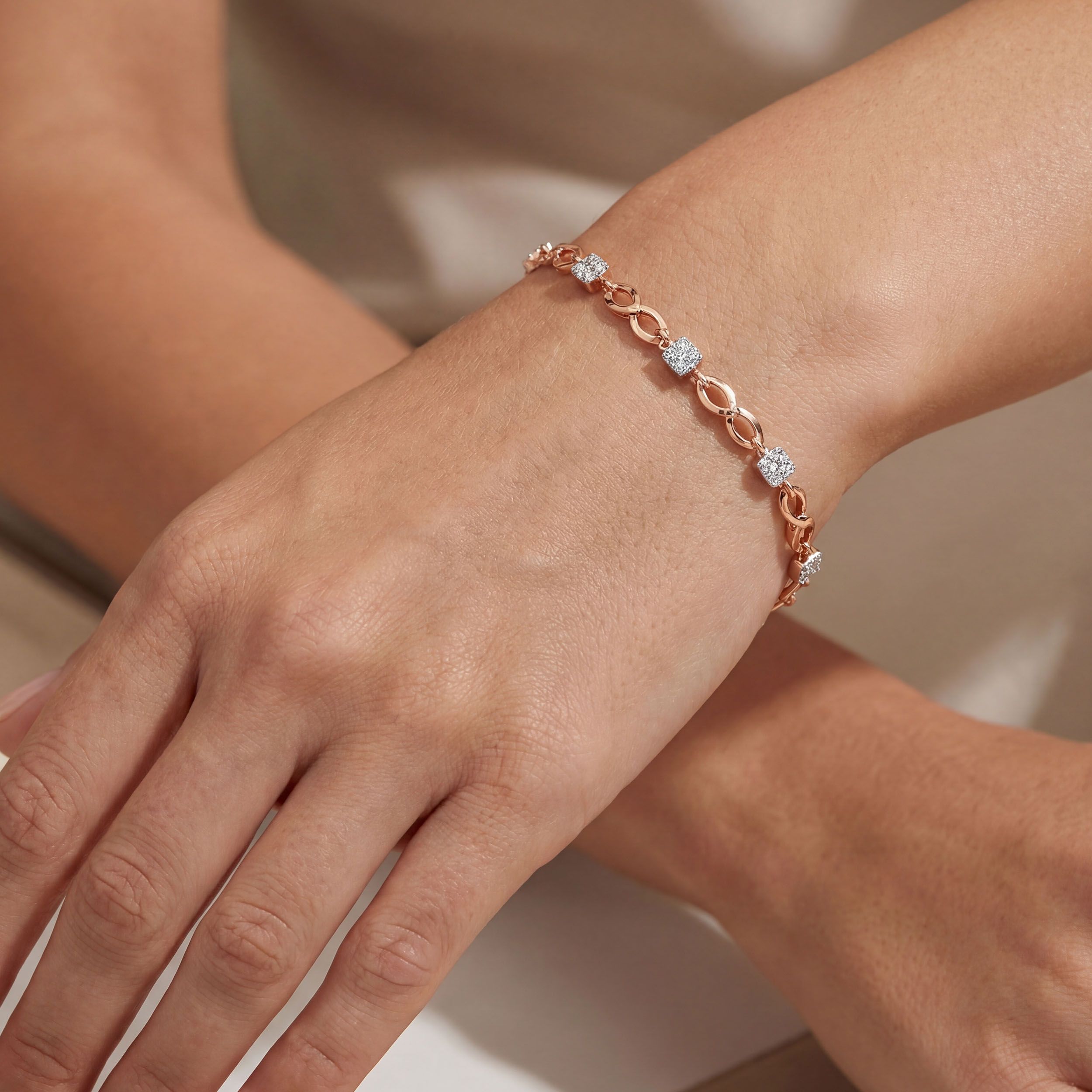 This diamond bracelet features alternating open-infinity links and diamond-encrusted squares. Its slender profile and warm hue make it ideal for a barely-there luxury aesthetic. Style it solo with a warm-toned shirt or a neutral co-ord to let its subtle elegance stand out.
