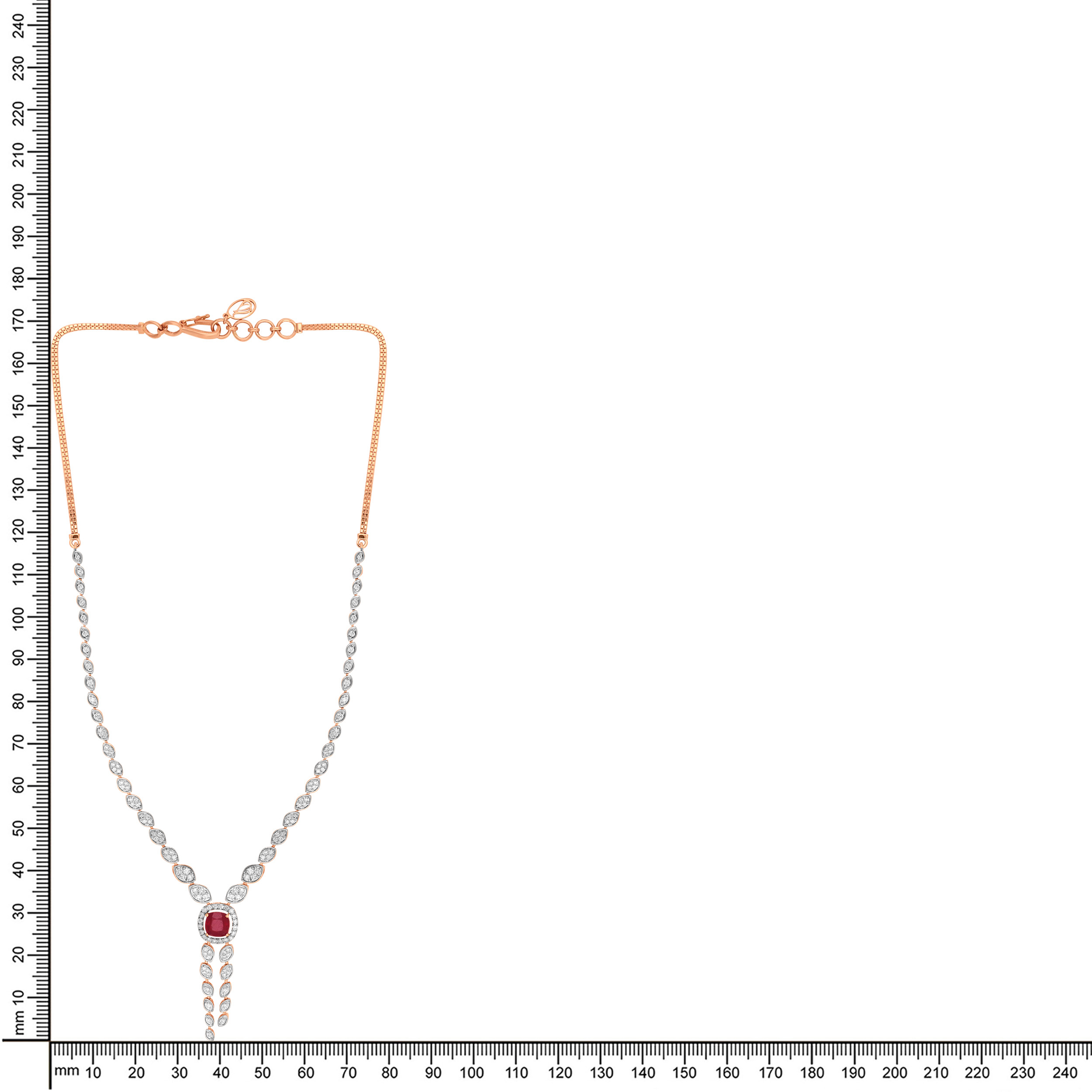Radiance unfolds beautifully in this diamond necklace, where a vivid red centrepiece is framed by a prismatic halo and finished with a graceful diamond-encrusted drop. The interplay of gold, diamond, and gemstone brings regal richness to evening lehengas, embroidered ensembles, and classic gowns, a luxe creation crafted for your most special moments. PLEASE NOTE:- The dimensions of the actual product might vary.
