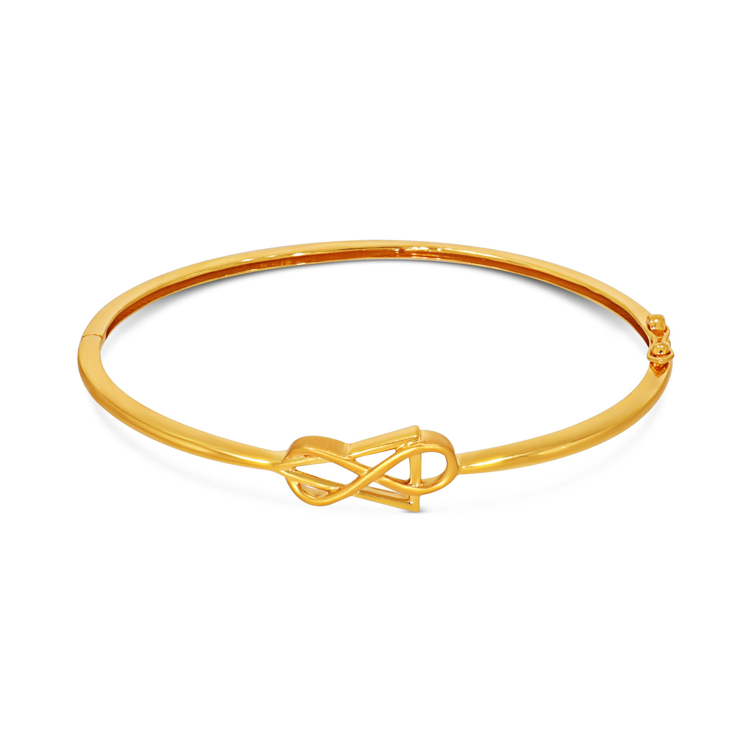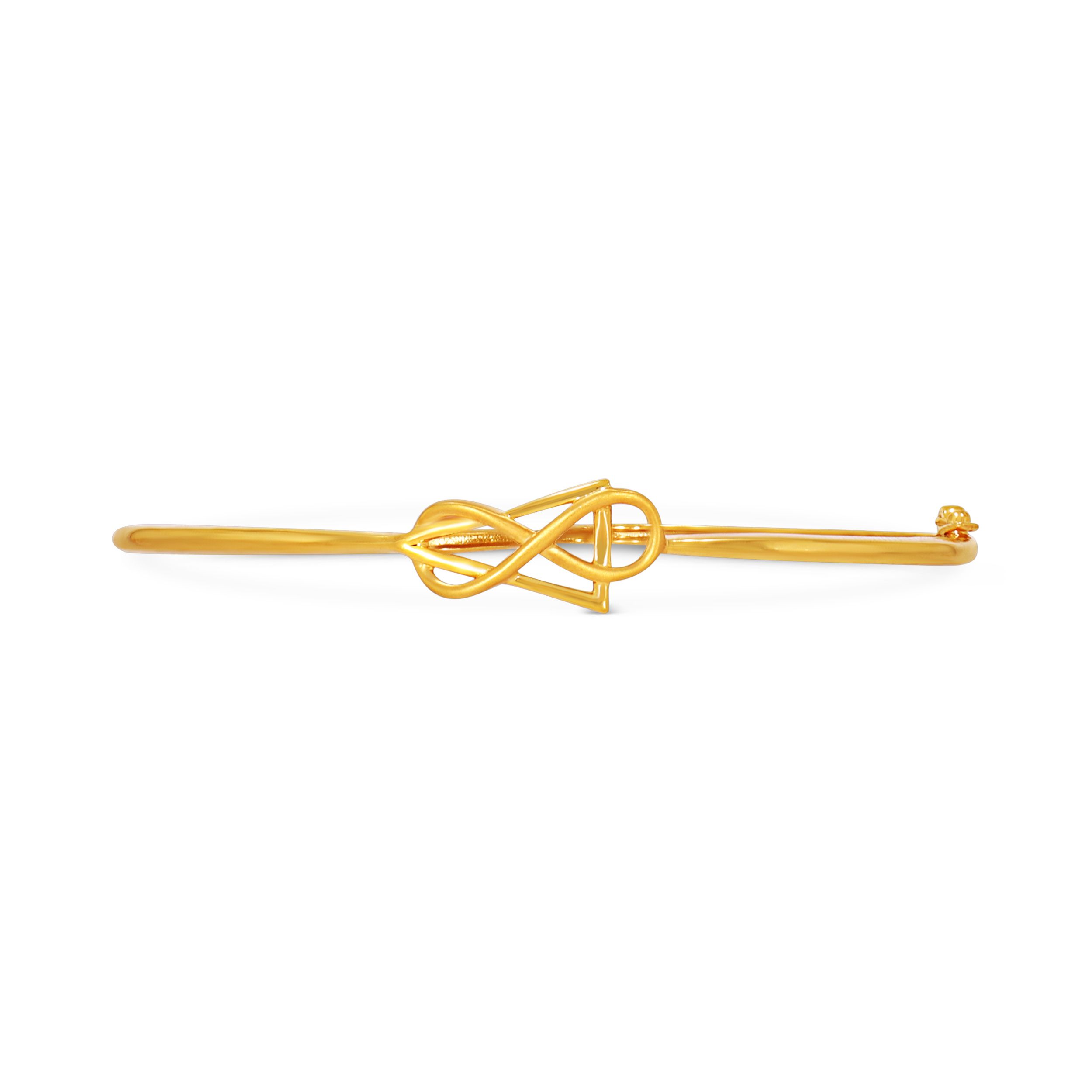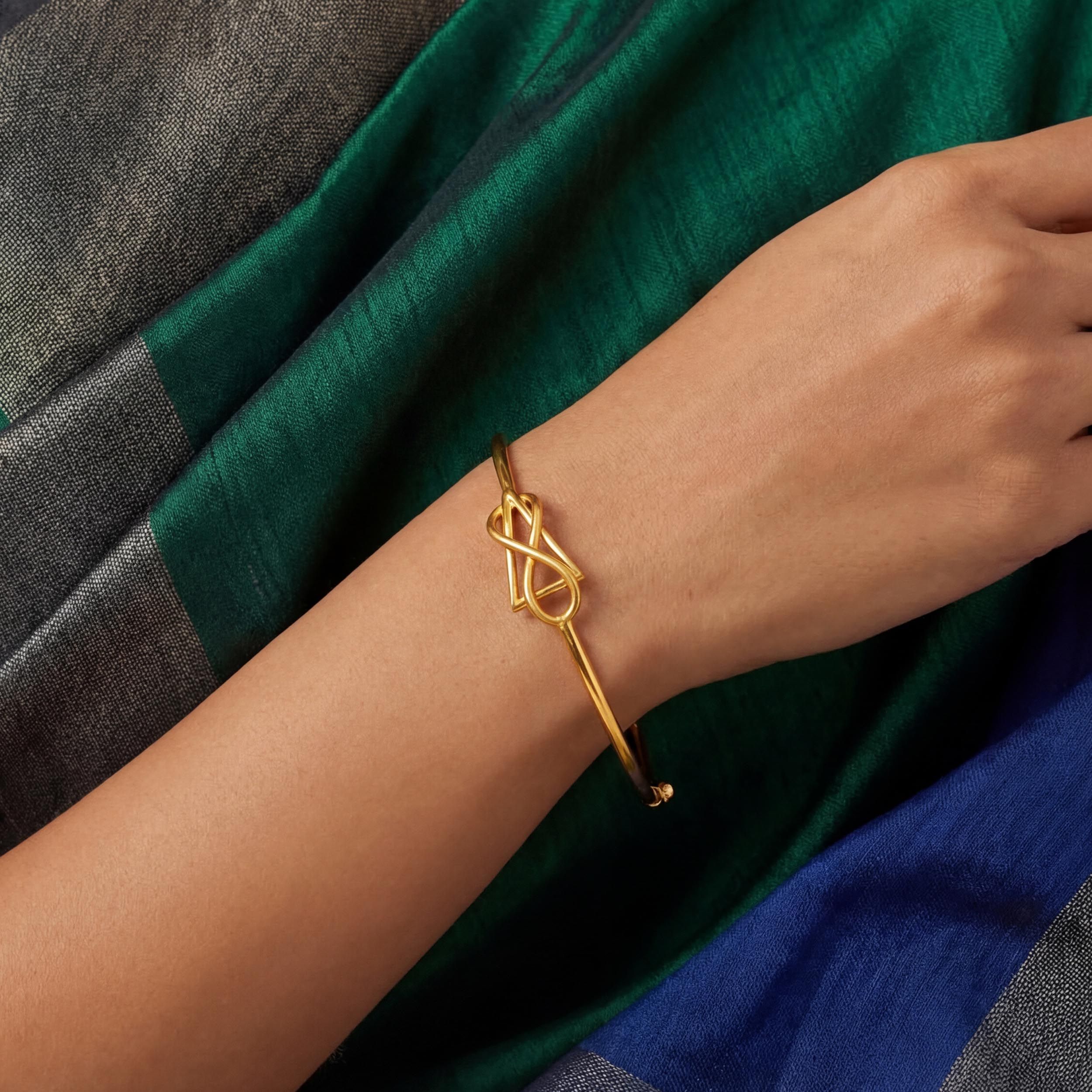 Infuse your outfit with quiet elegance through this refined gold chur, defined by a fluid infinity-inspired loop at its centre. The intertwined detail adds gentle movement, while the slender form keeps the look clean and effortless. From pre-wedding functions to casual evening dinners, it transitions seamlessly across occasions.