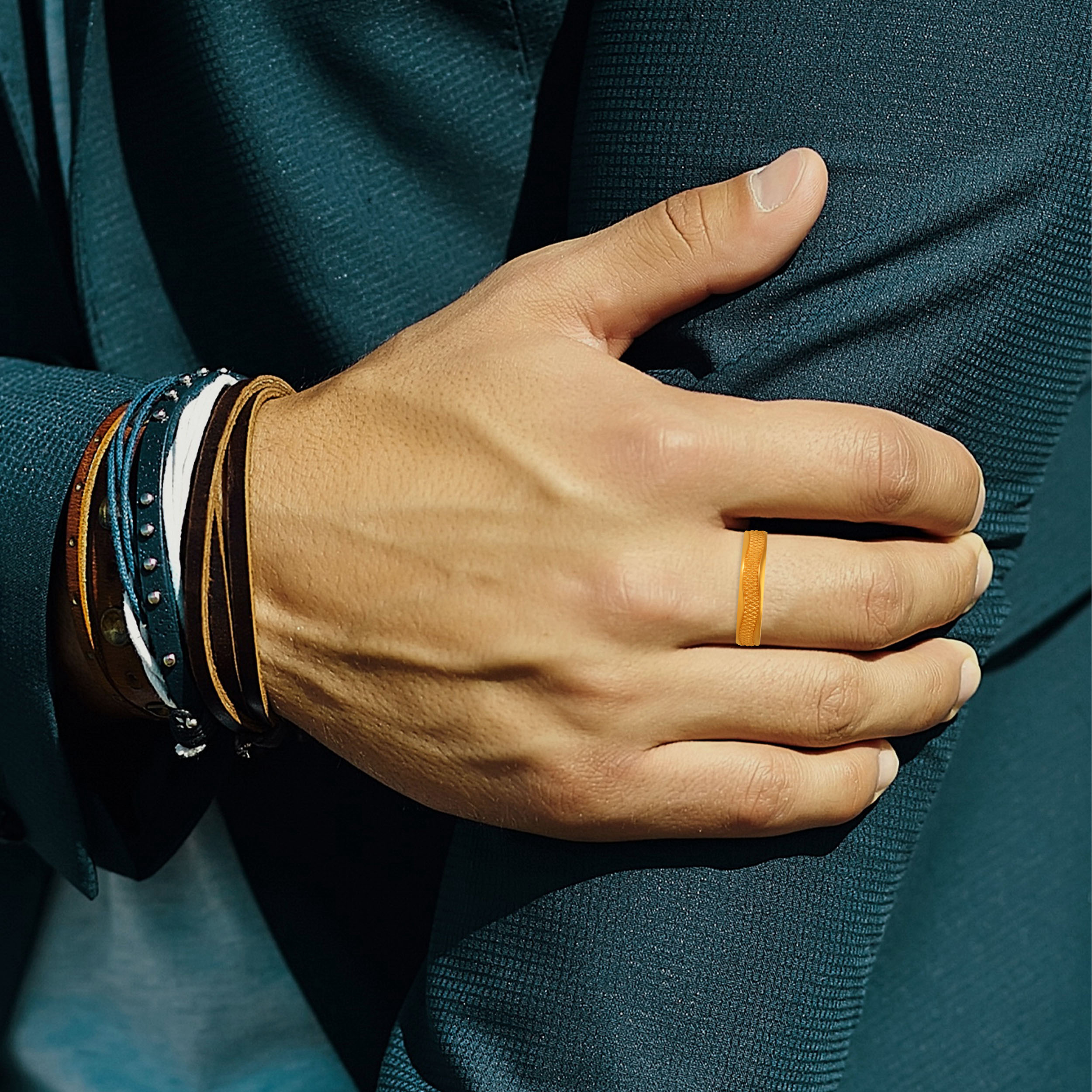 Clean, disciplined, and enduring, this gold band is defined by precision and purpose. Fine ridged detailing introduces quiet character while preserving a streamlined silhouette. Designed to be worn daily, it carries a sense of restraint and confidence that never feels overstated. Style it with casual jackets, knitwear, or layered winter ensembles for effortless polish.