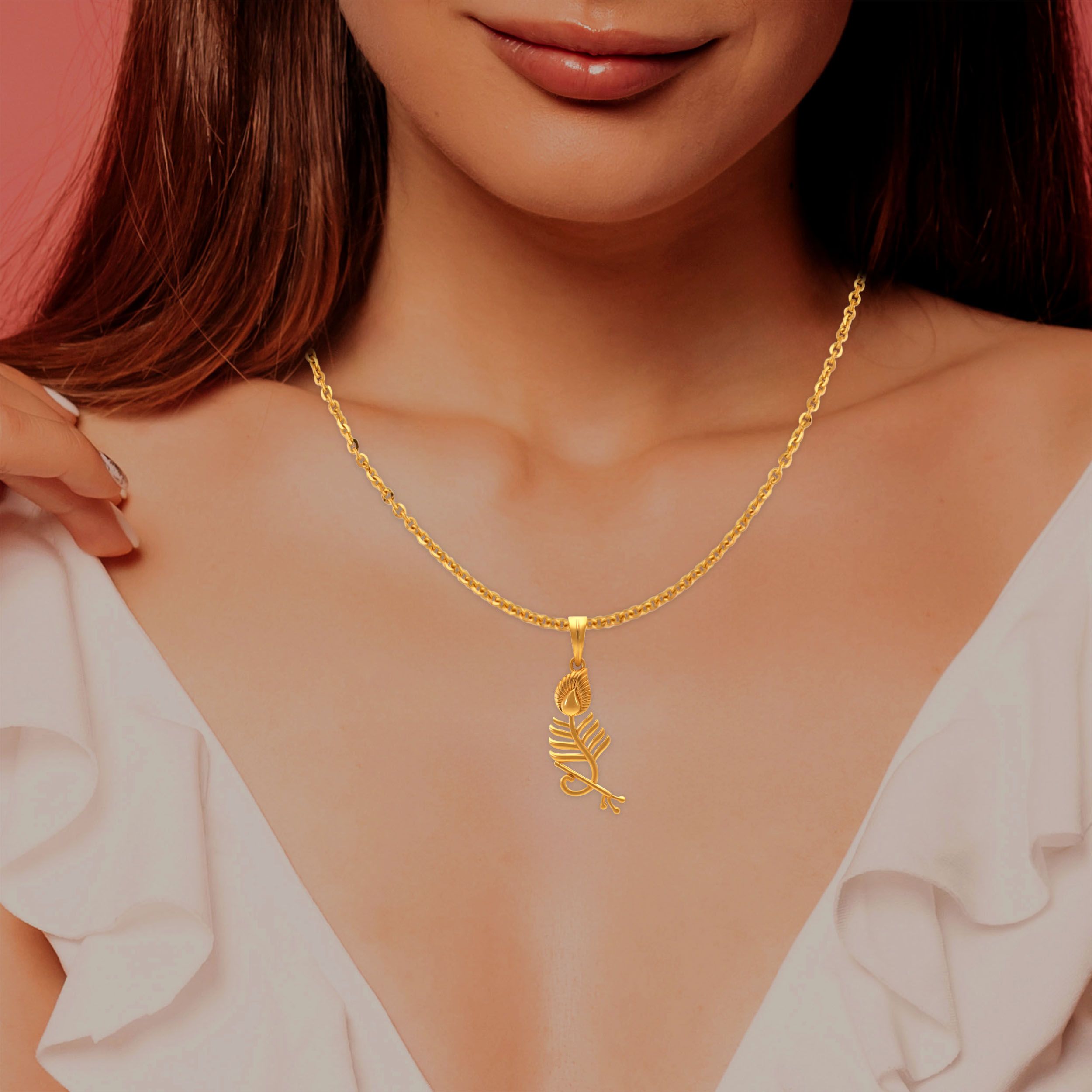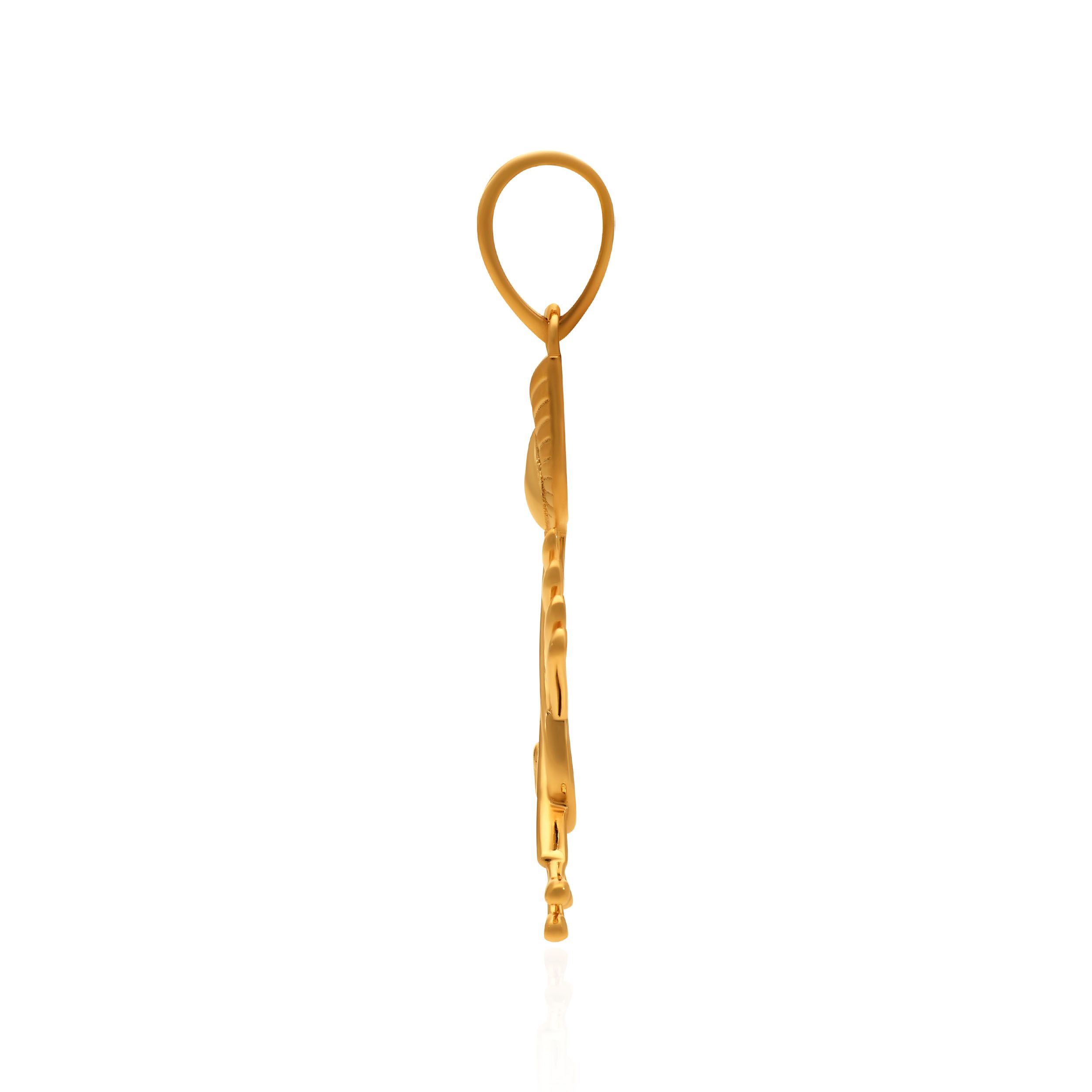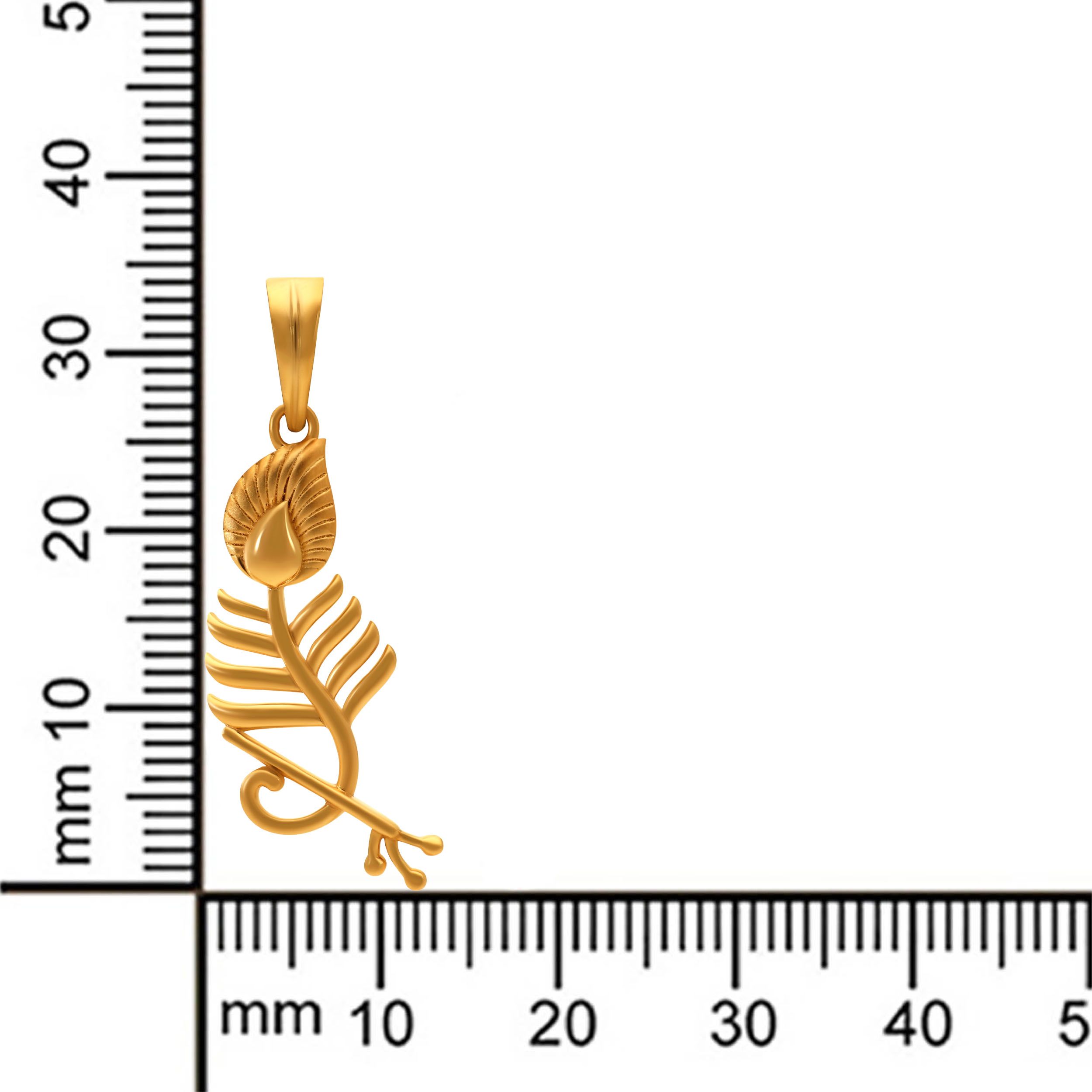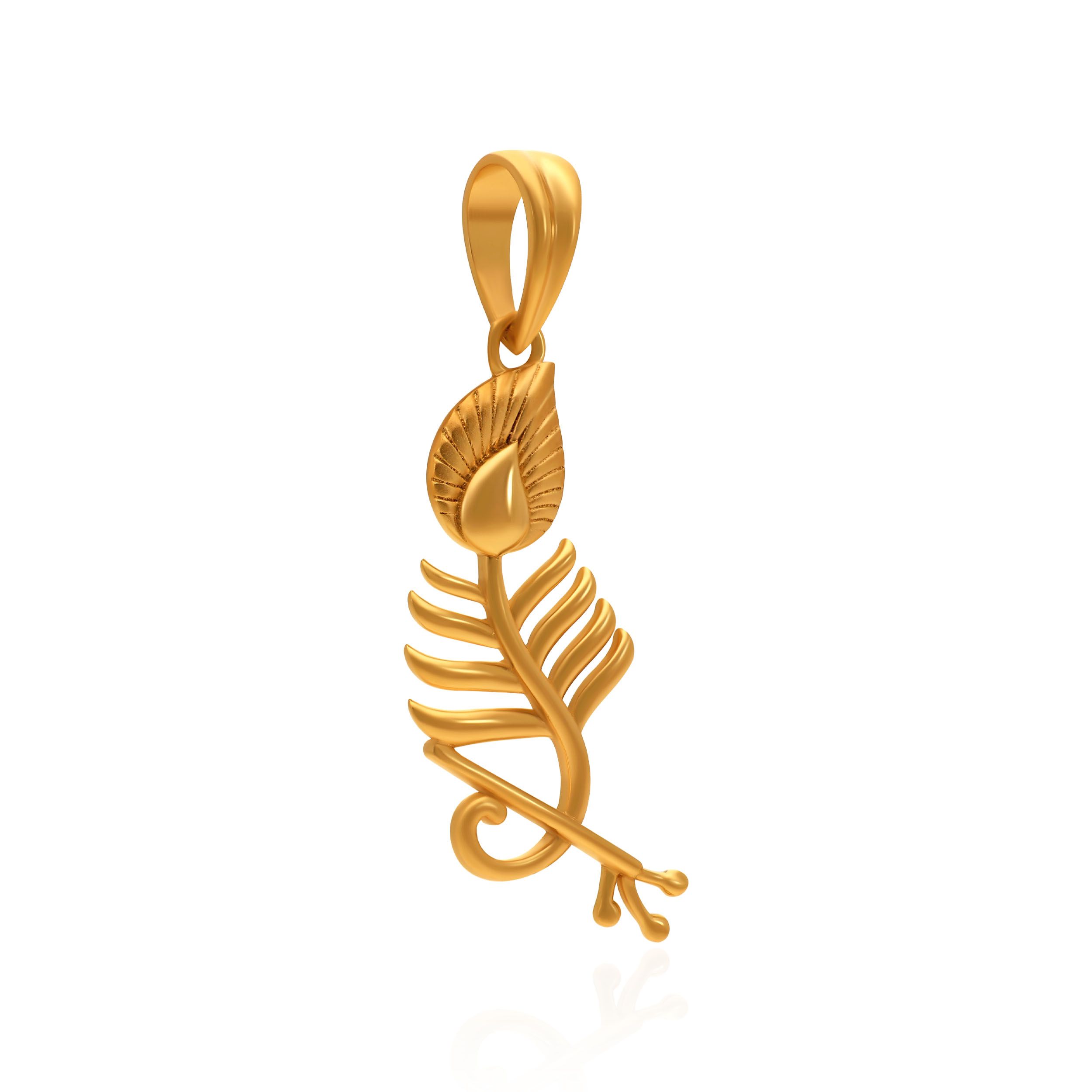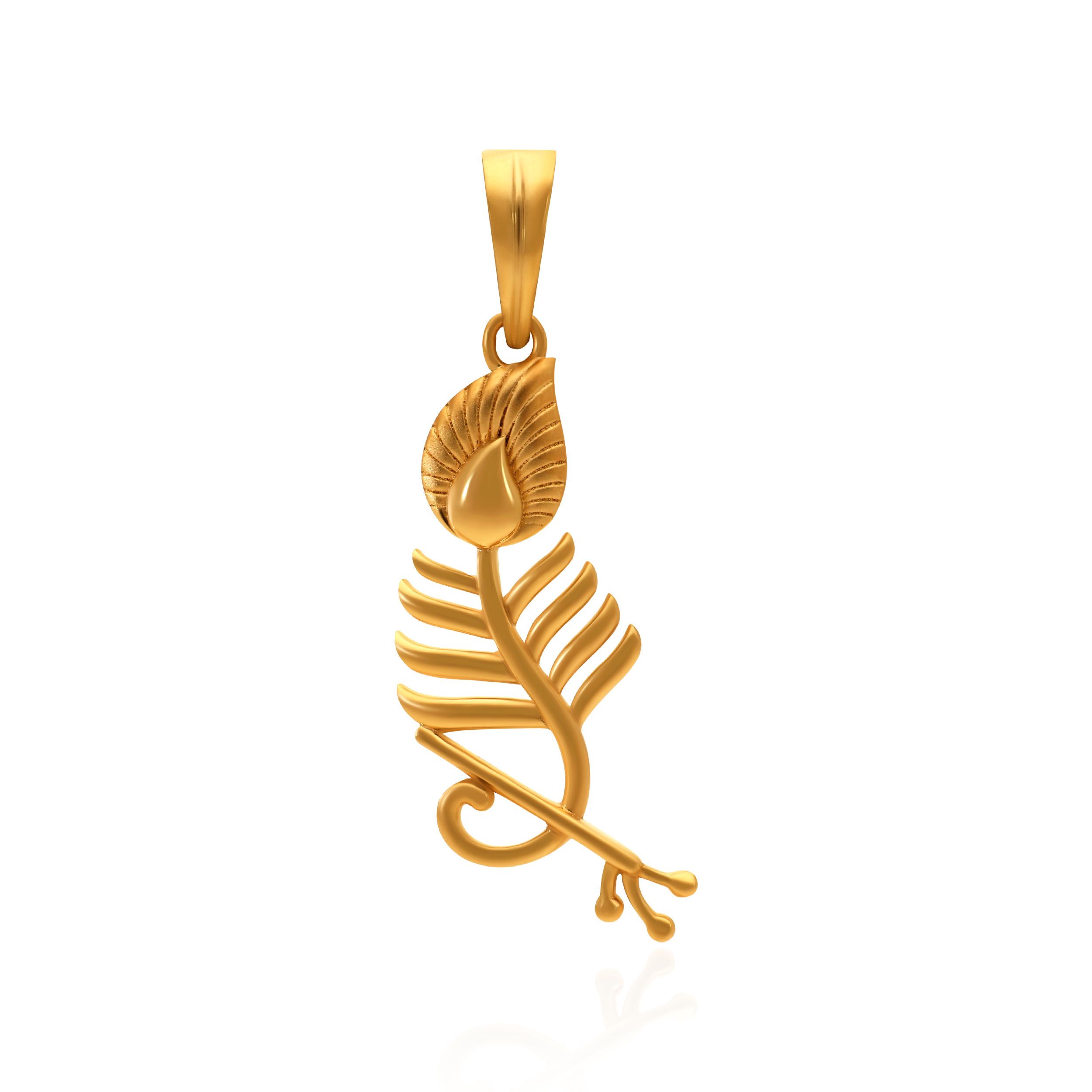 Inspired by the enchanting symbolism of Shri Krishna’s flute, this gold pendant captures a graceful harmony of devotion and artistry. The slender flute flows across a delicate vine-like form, crowned with a softly sculpted leaf motif that evokes nature’s quiet beauty. Pair it with a simple gold chain and a traditional kurta, saree, or festive ethnic ensemble for a graceful spiritual touch.