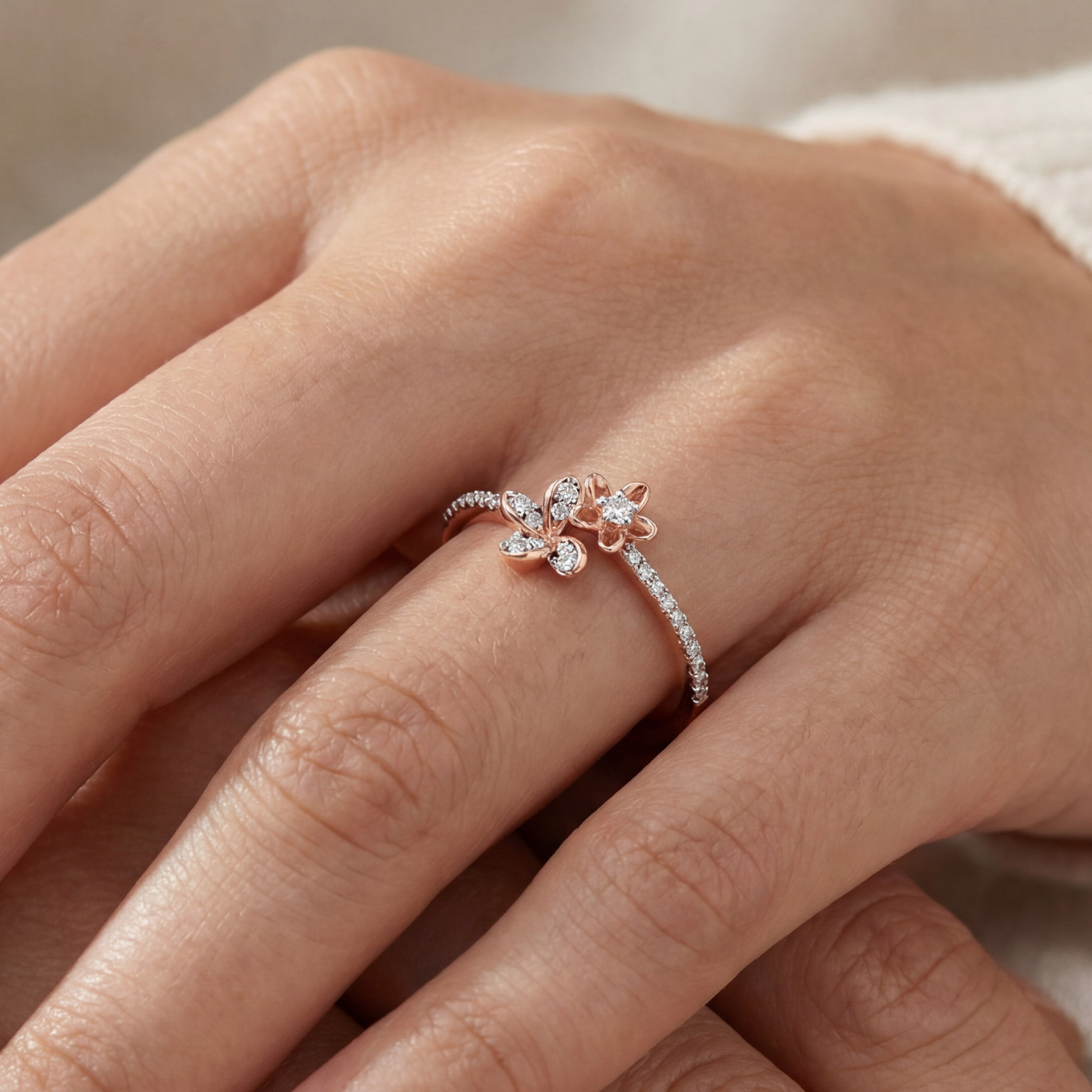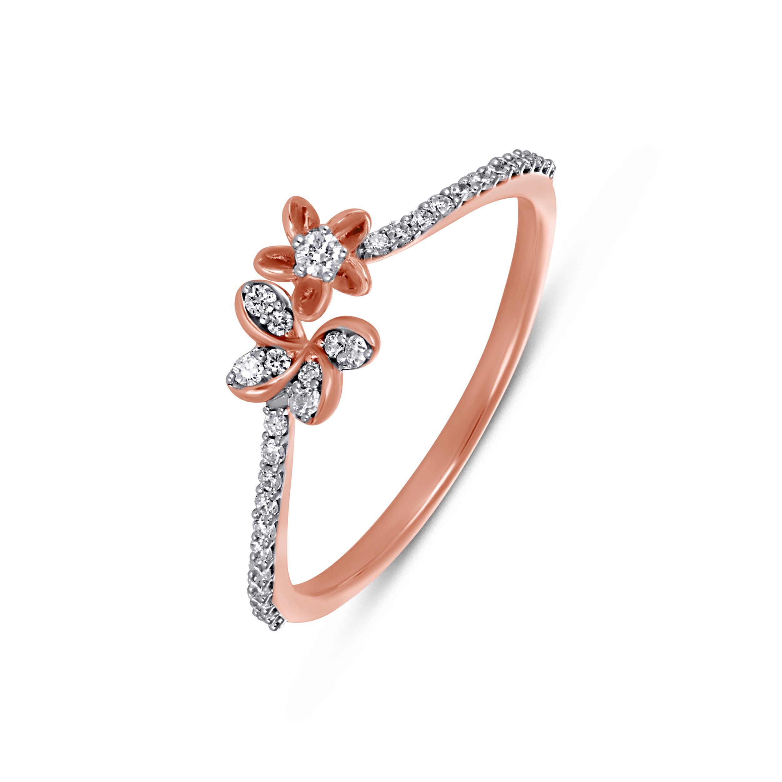 Elevate your style with a silhouette that blends sharp contemporary lines with a subtle touch of nature. This diamond ring showcases two delicately sculpted floral motifs, accented with shimmering diamond details, offering a refined interpretation of floral elegance. Designed for the woman with discerning taste, it makes a graceful yet distinctly modern statement.