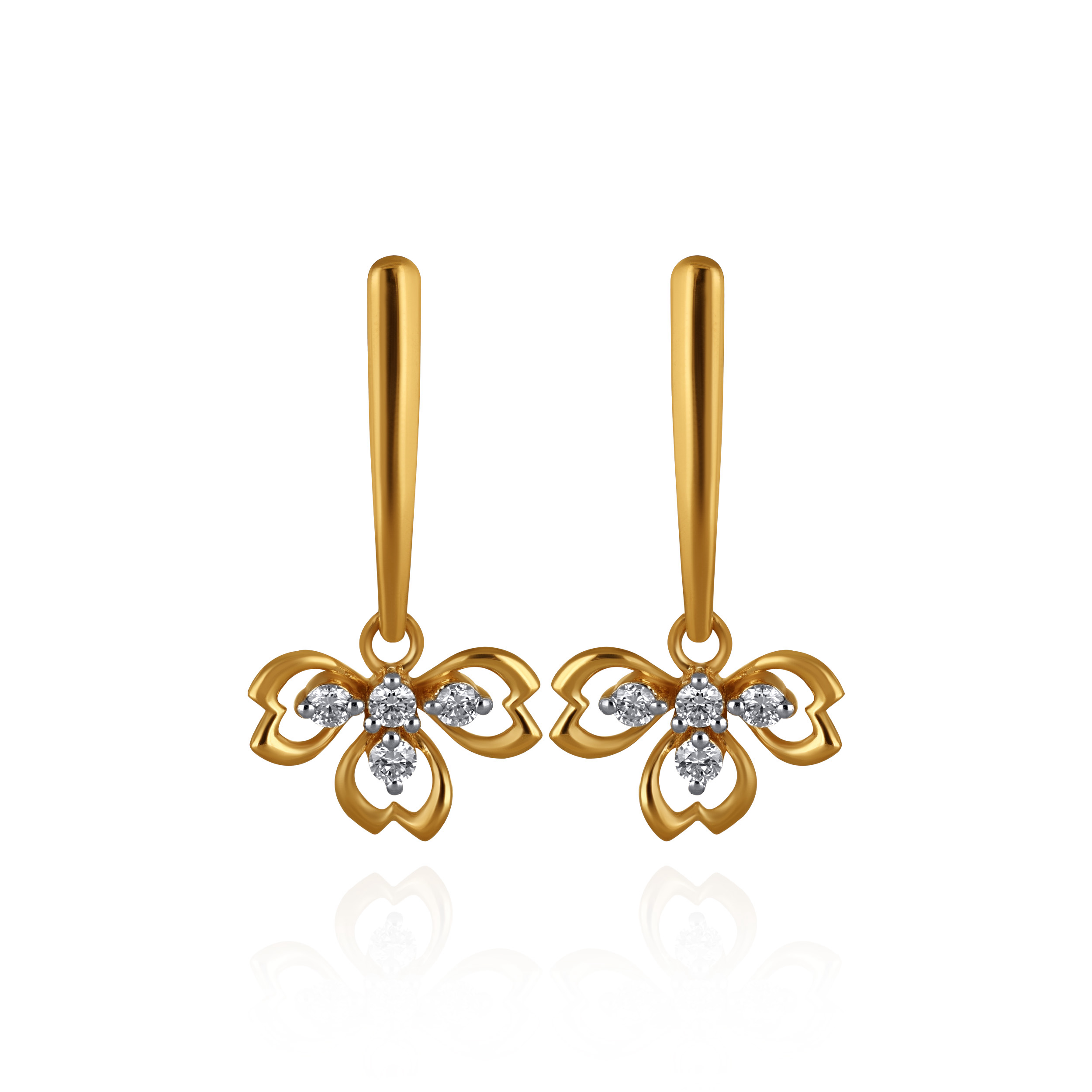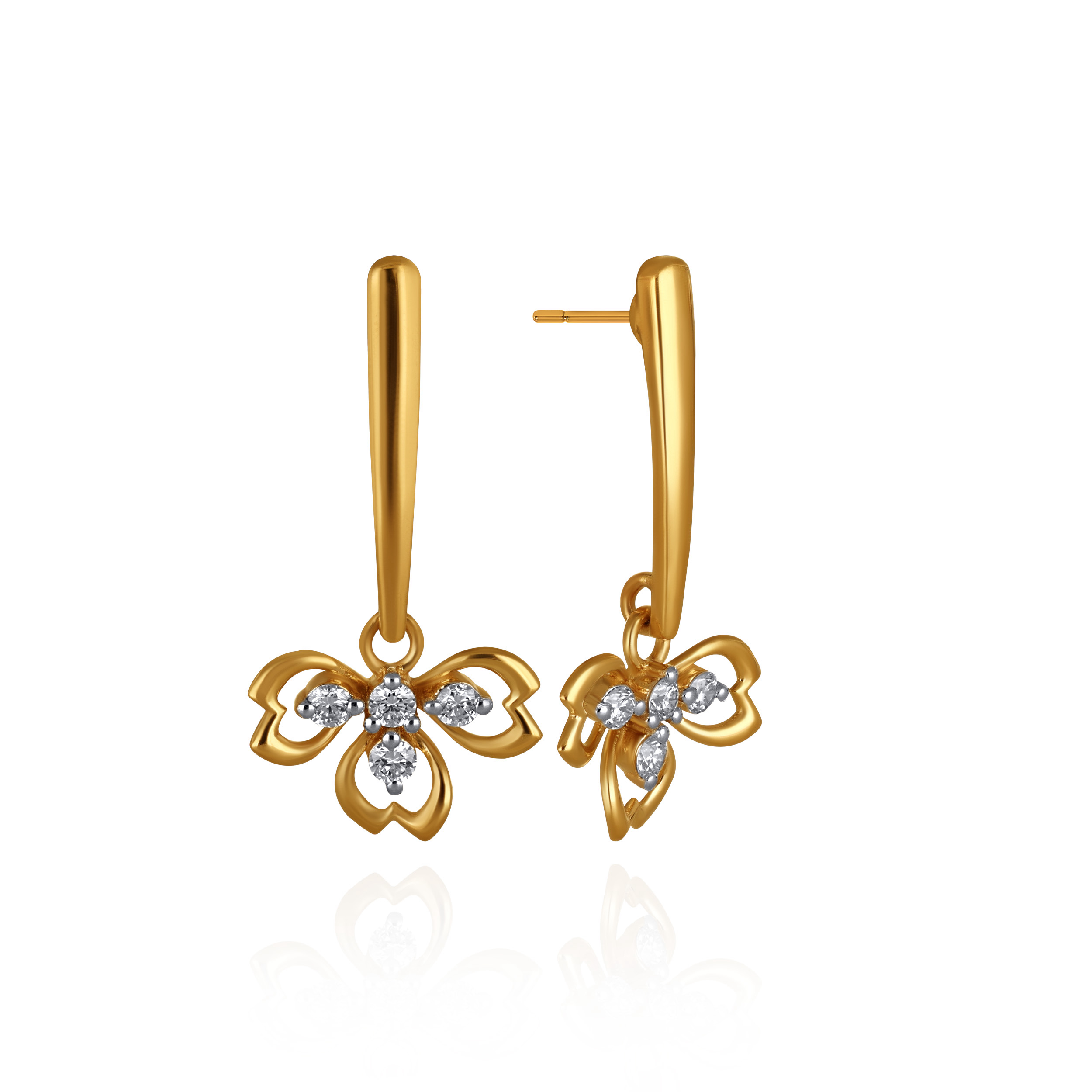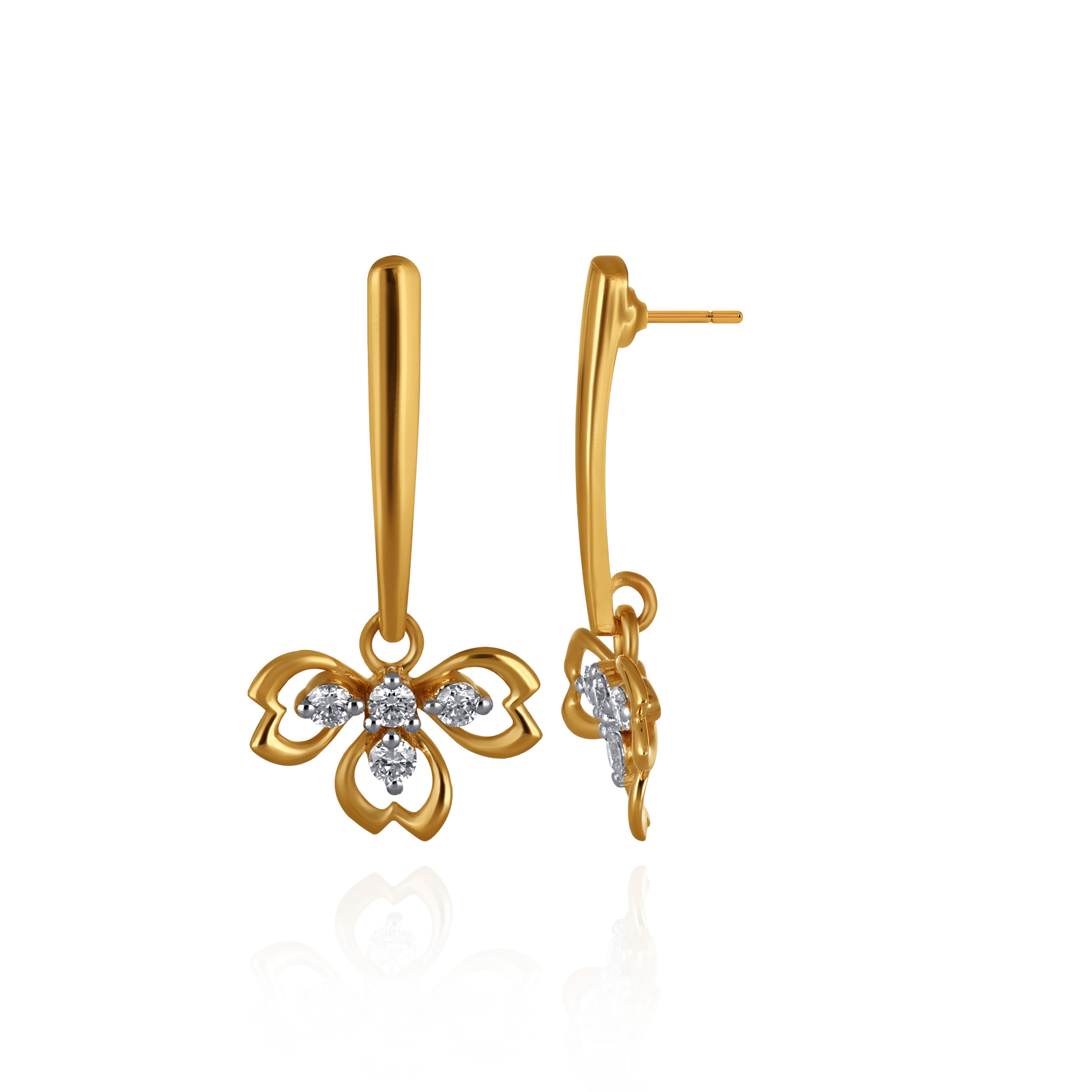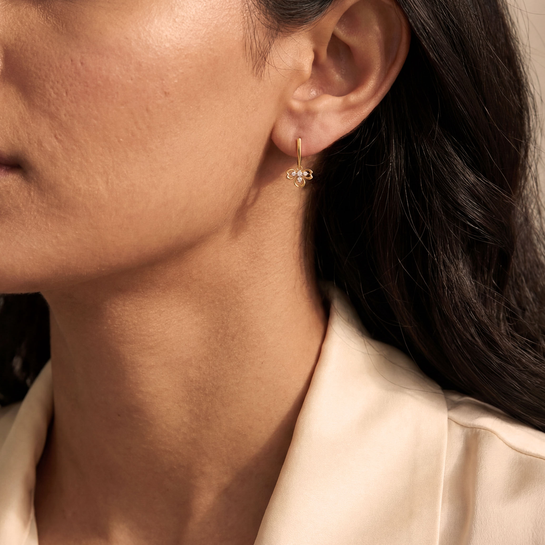 These diamond drop earrings present a sleek, elongated silhouette that reflects modern sophistication. A polished gold stem flows into a stylised four-petal bloom, centred with radiant accents that catch the light beautifully. Defined by clean lines and just the right touch of sparkle, they bring effortless versatility to your jewellery wardrobe, seamlessly transitioning from polished daytime looks to luminous evening moments.