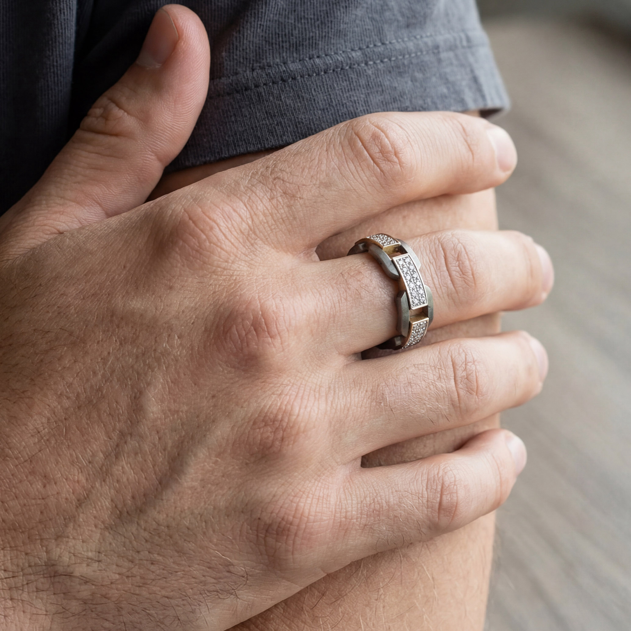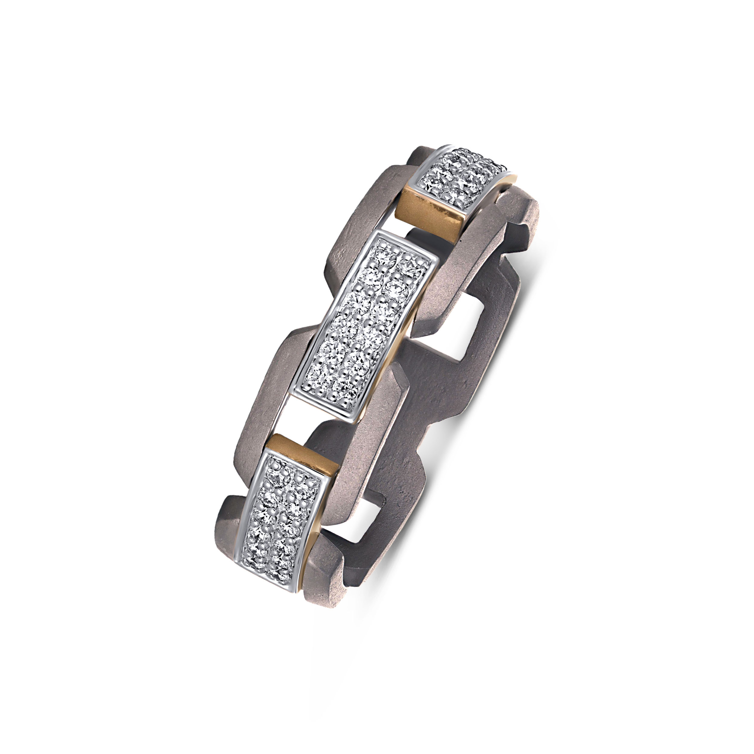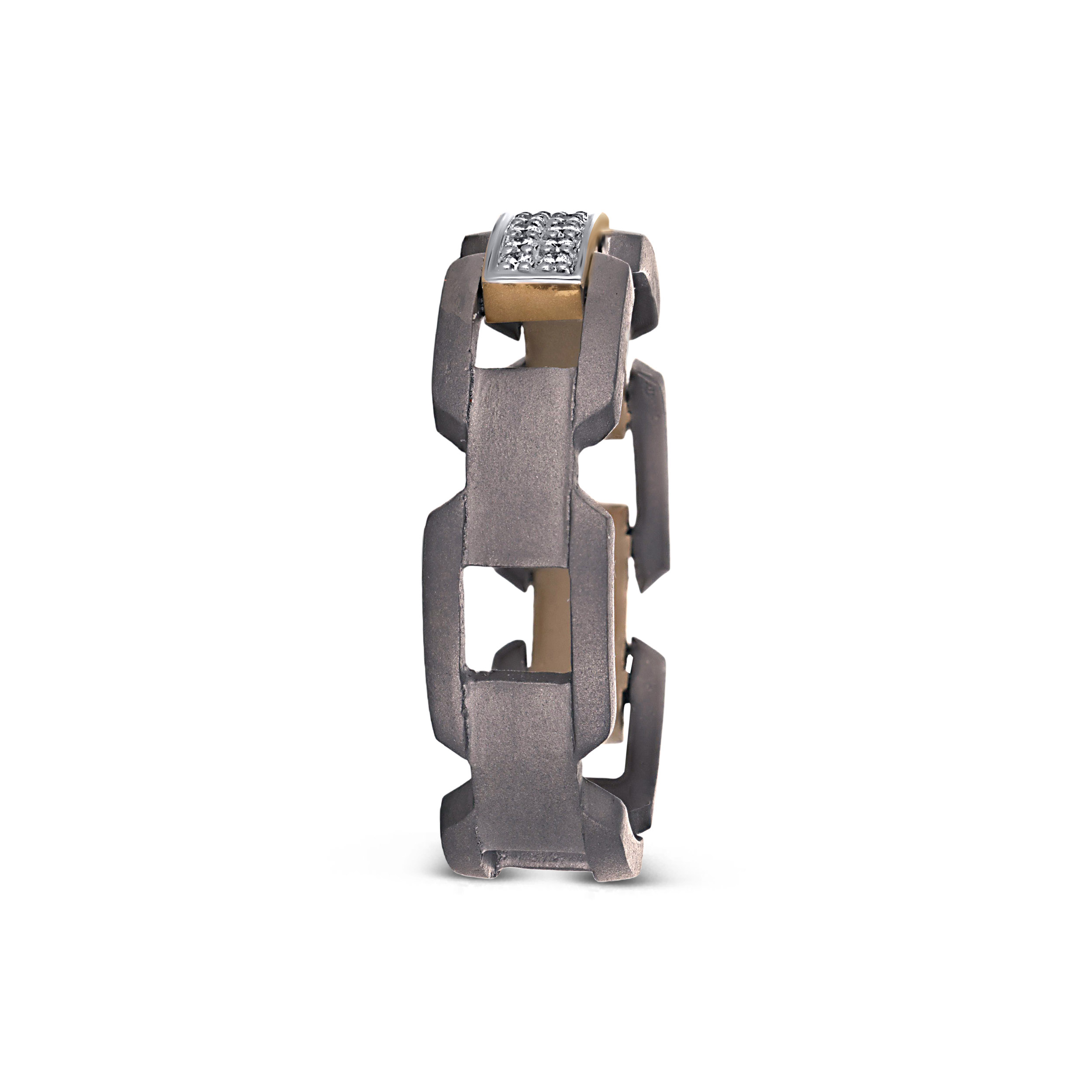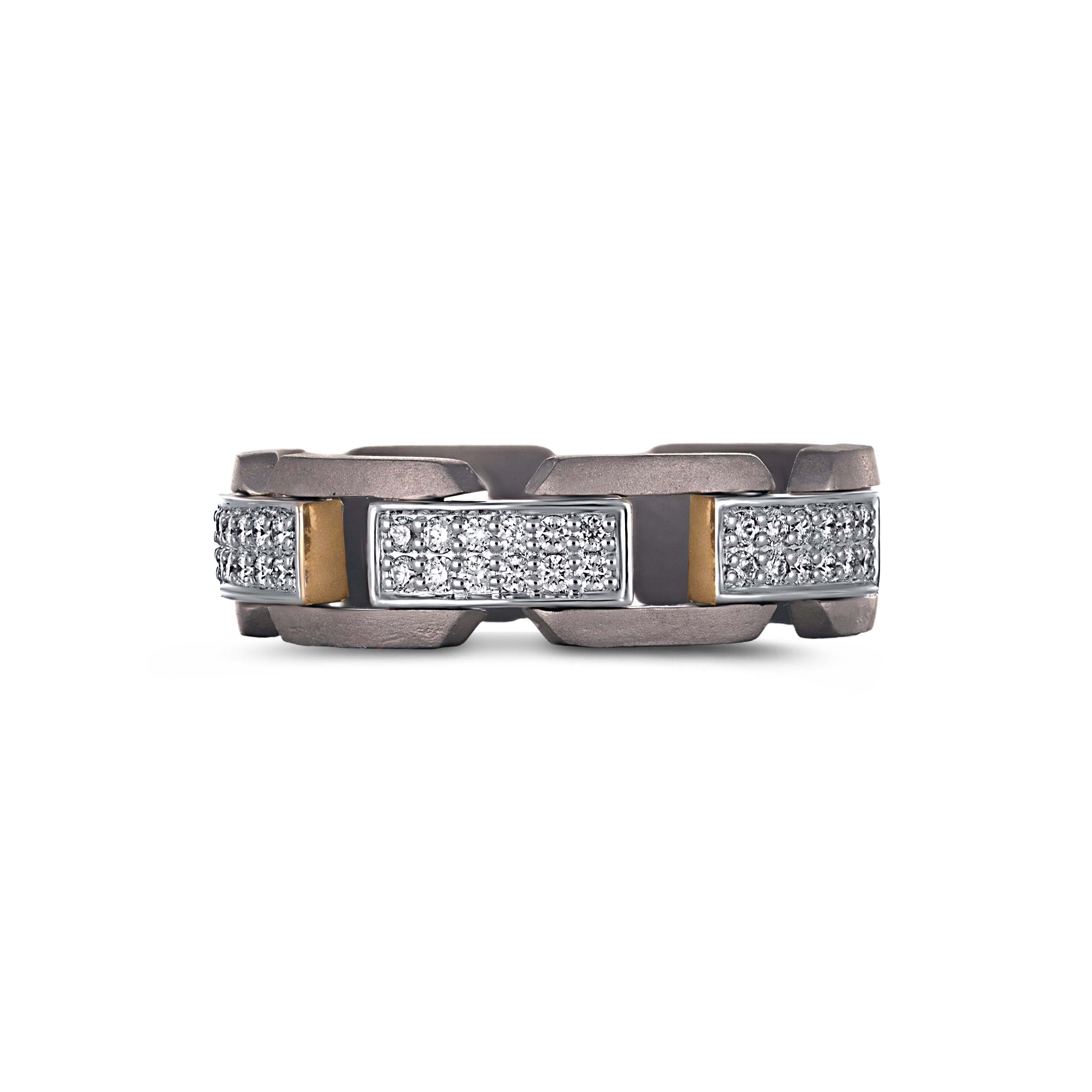 Upgrade your signature look with a design that feels powerful yet effortless. Crafted in matte-finished titanium, this chain-inspired ring features precision-set diamond panels framed with warm gold accents. Rugged texture meets clean geometry for a confident, modern presence, substantial on the hand, refined in impact.