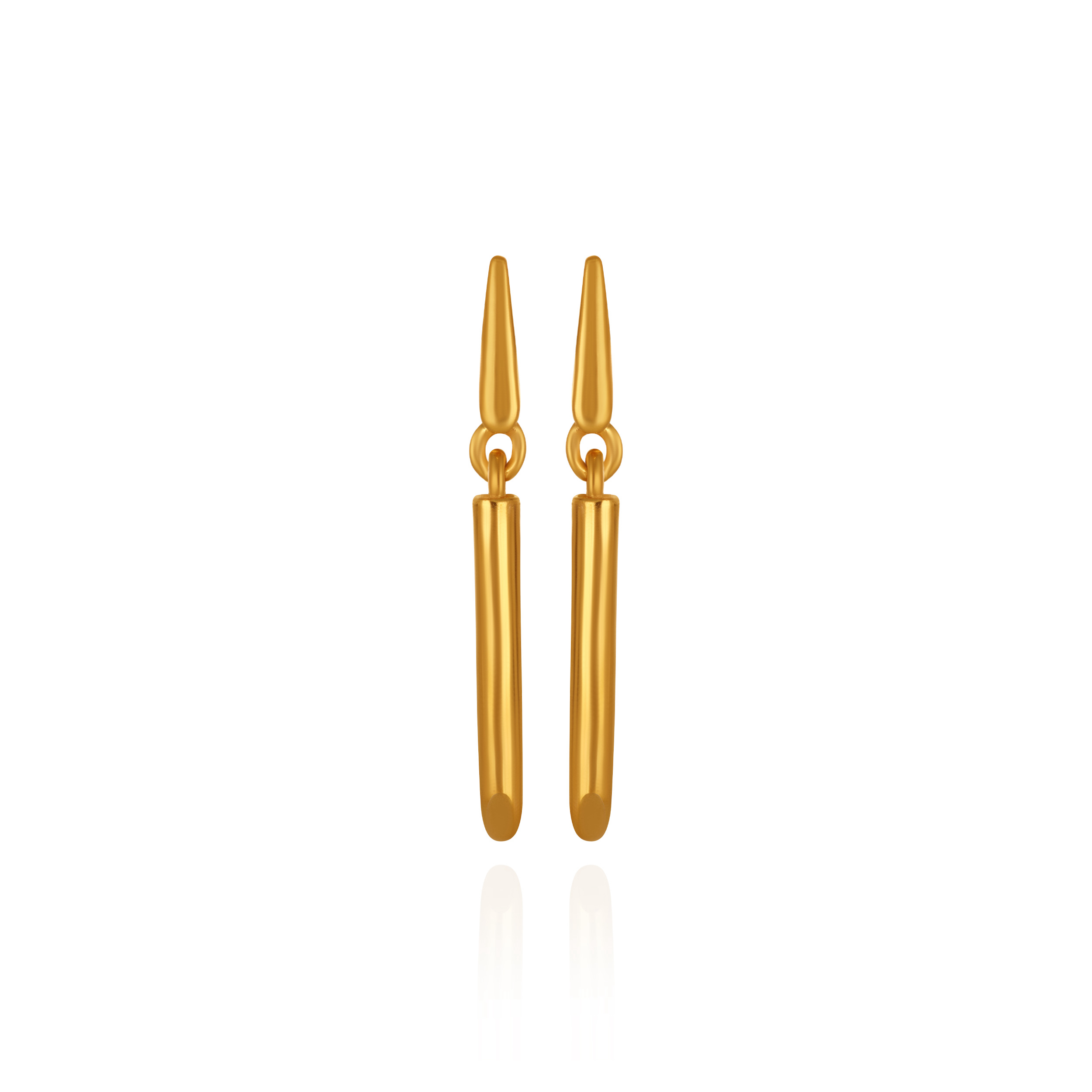 Modern minimalism meets refined sophistication in these striking gold drop earrings. Defined by a clean, linear silhouette, a polished tapered post flows seamlessly into a sleek cylindrical drop. Bold enough to elevate evening looks yet lightweight for all-day ease, this pair is a versatile staple for contemporary styling.