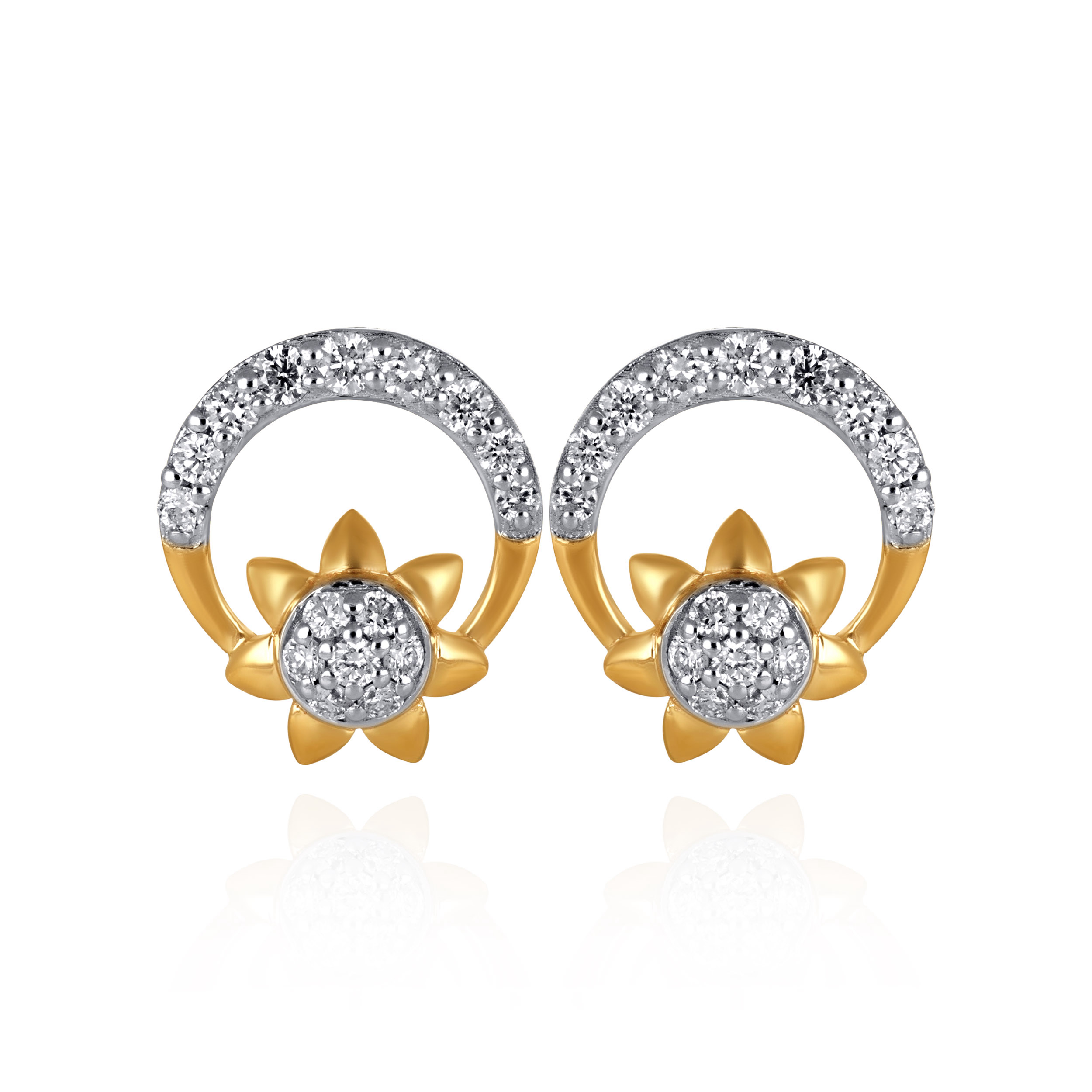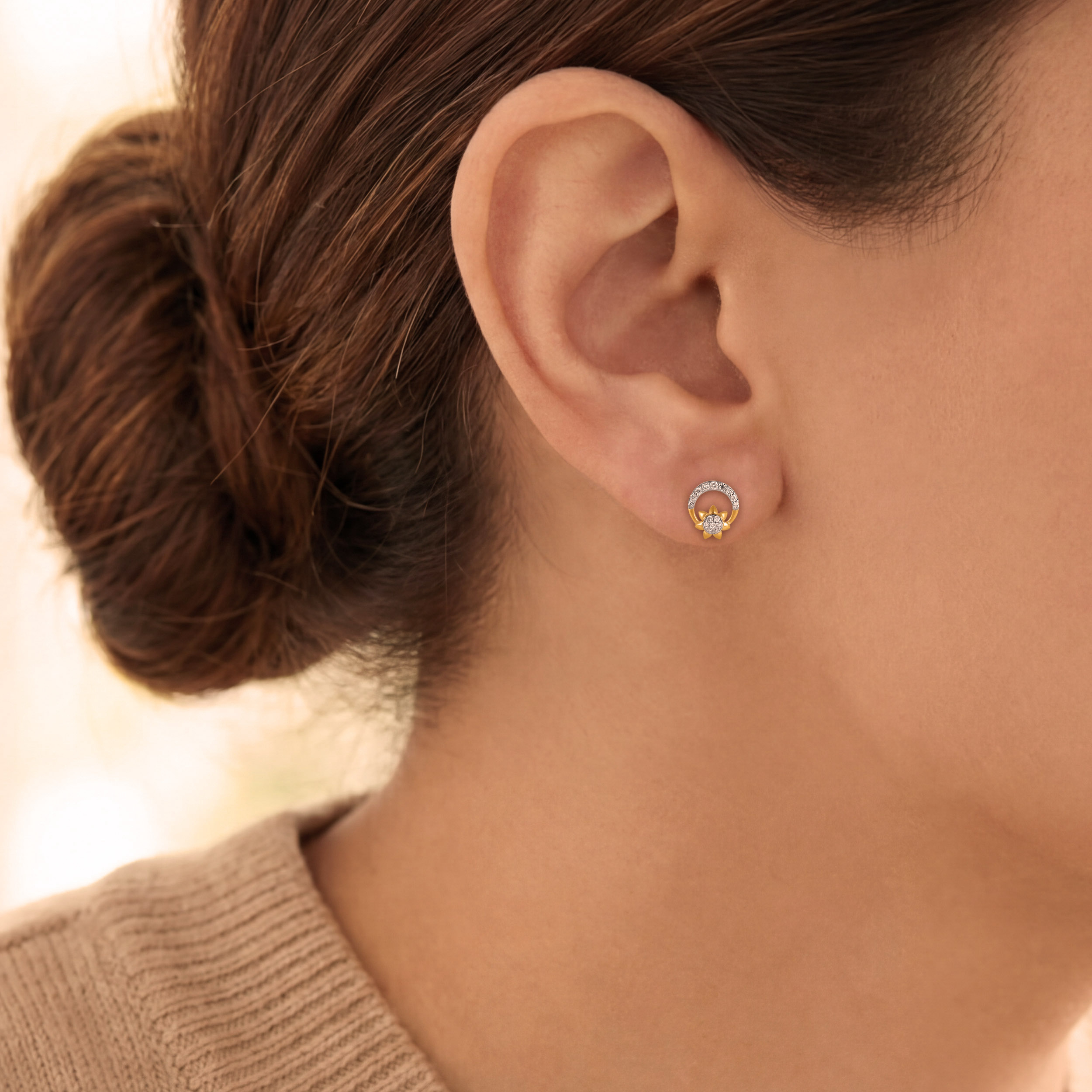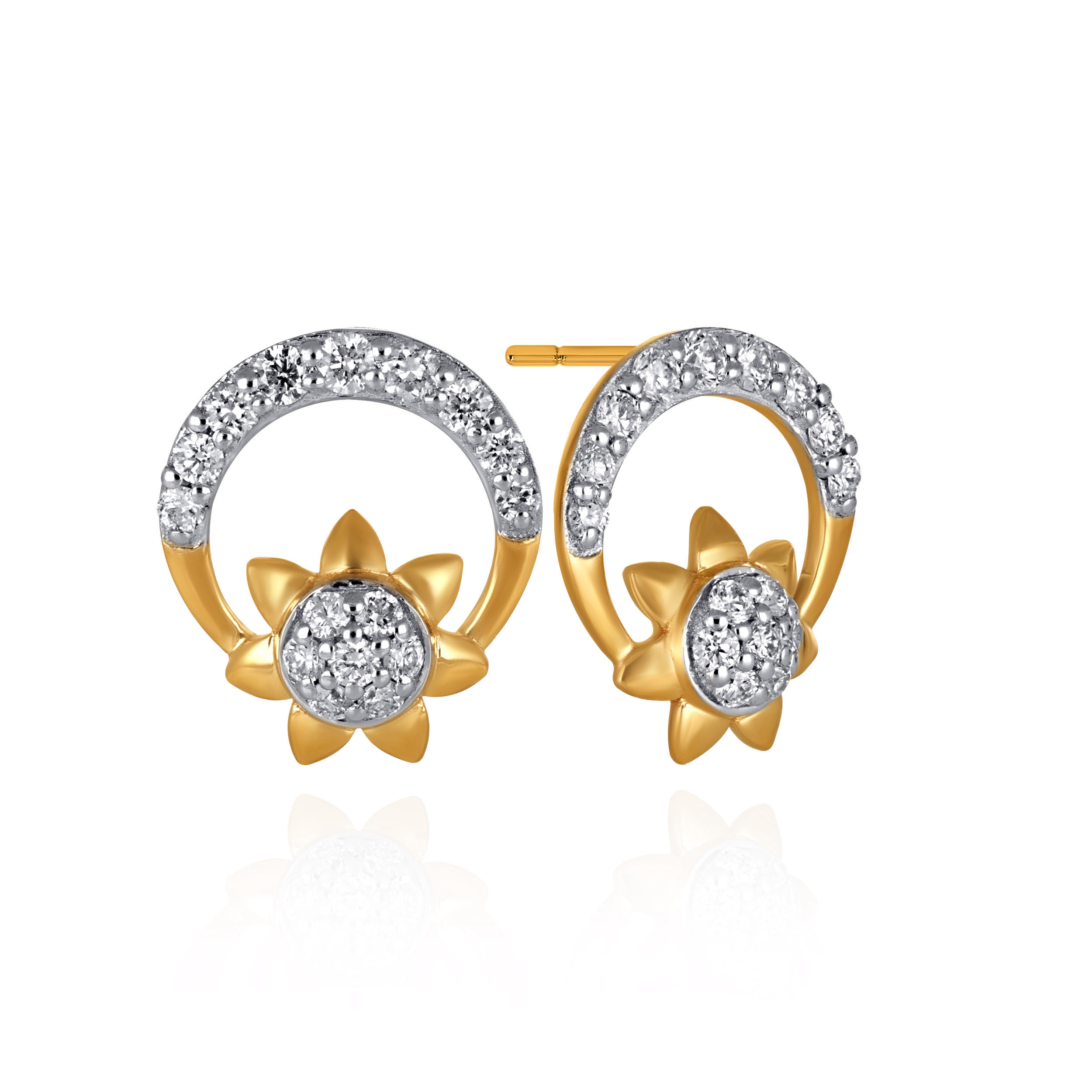 Inspired by the radiance of the sun, these studs showcase a centred diamond cluster framed by a sculpted golden floral halo. A crescent arc of shimmering accents crowns the design, creating a luminous interplay between gold and diamonds. Refined yet expressive, they are a sophisticated pair designed to elevate your evening glow.