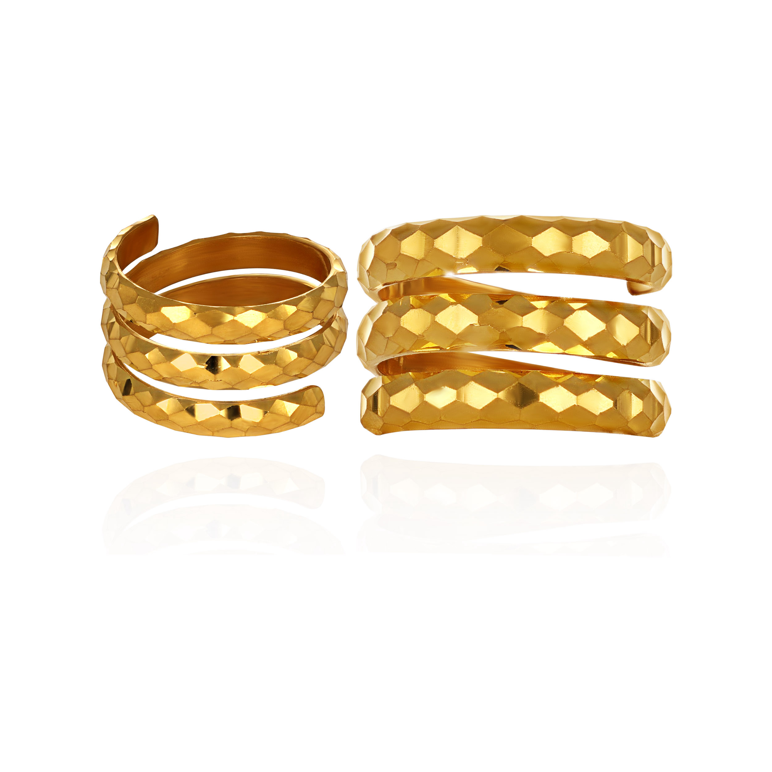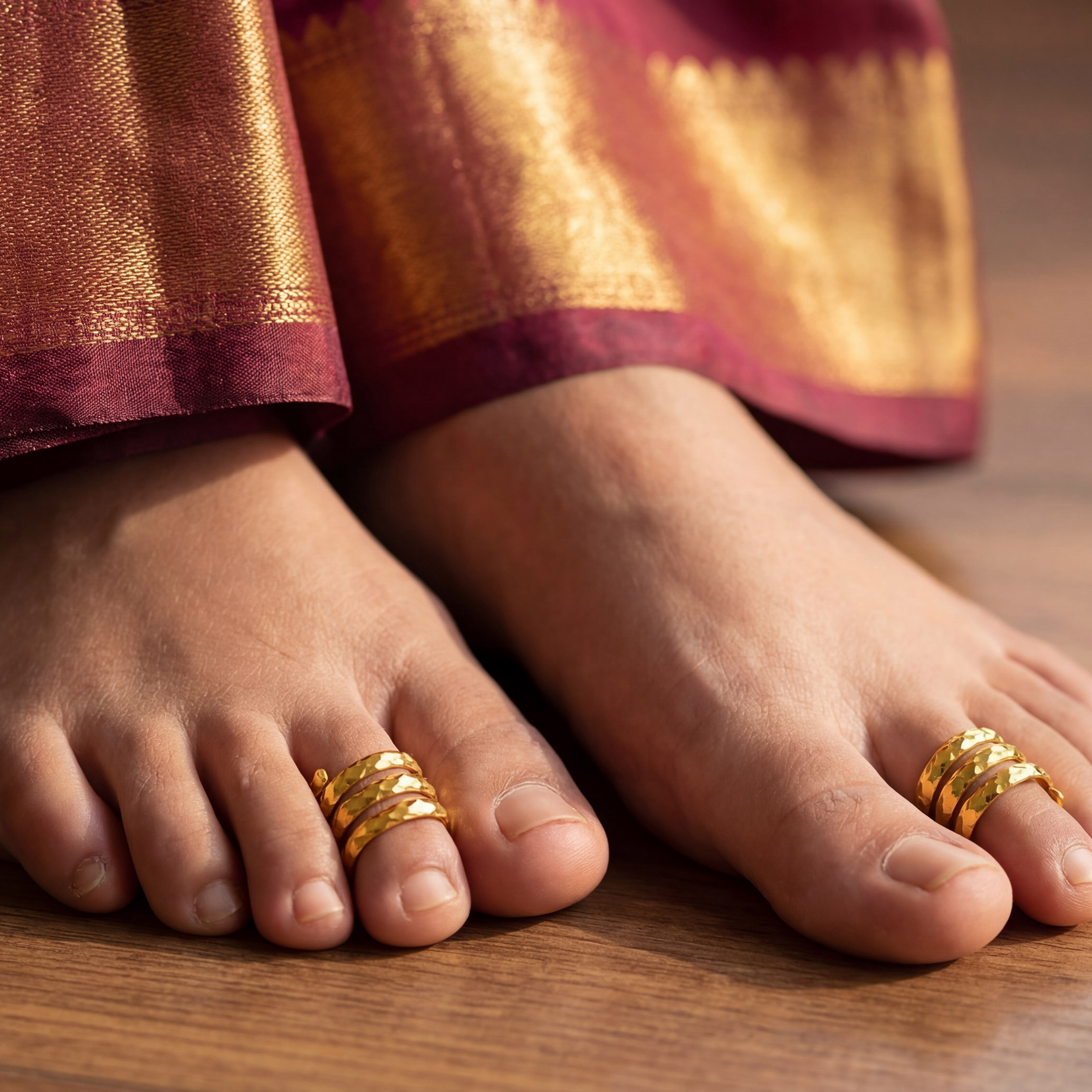 Rooted in traditional aesthetics, this gold toe ring showcases a distinctive multi-band wrap design enriched with intricate faceted detailing. The textured gold surface adds radiance while preserving its classic, ceremonial character. Ideal for weddings, pujas, and festive occasions, it pairs beautifully with ethnic outfits and traditional jewellery.