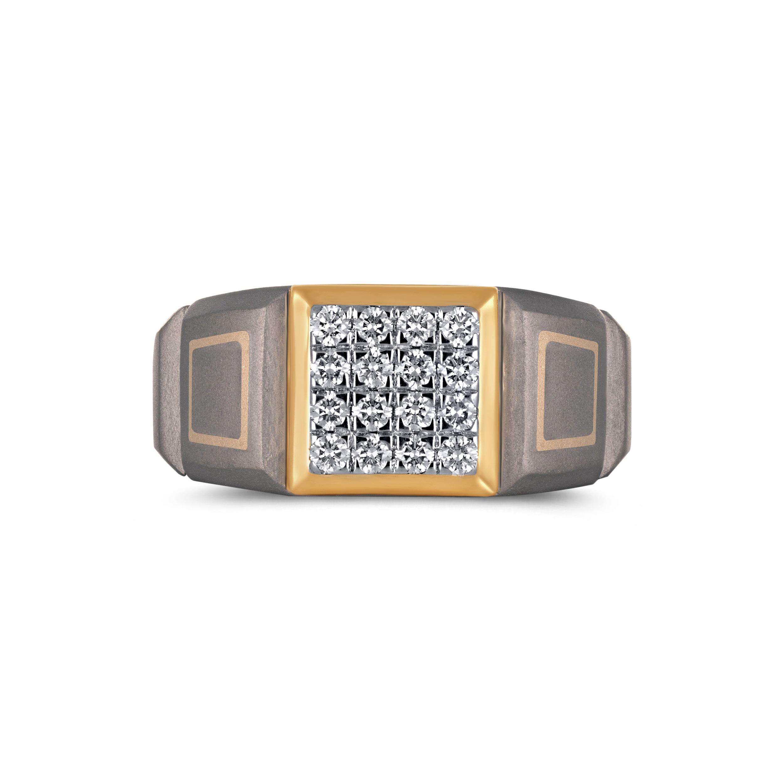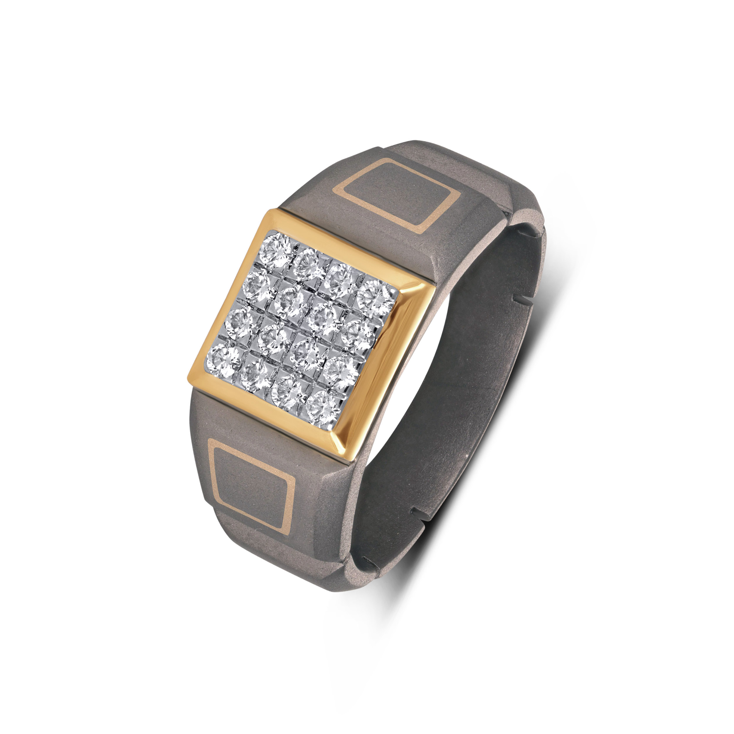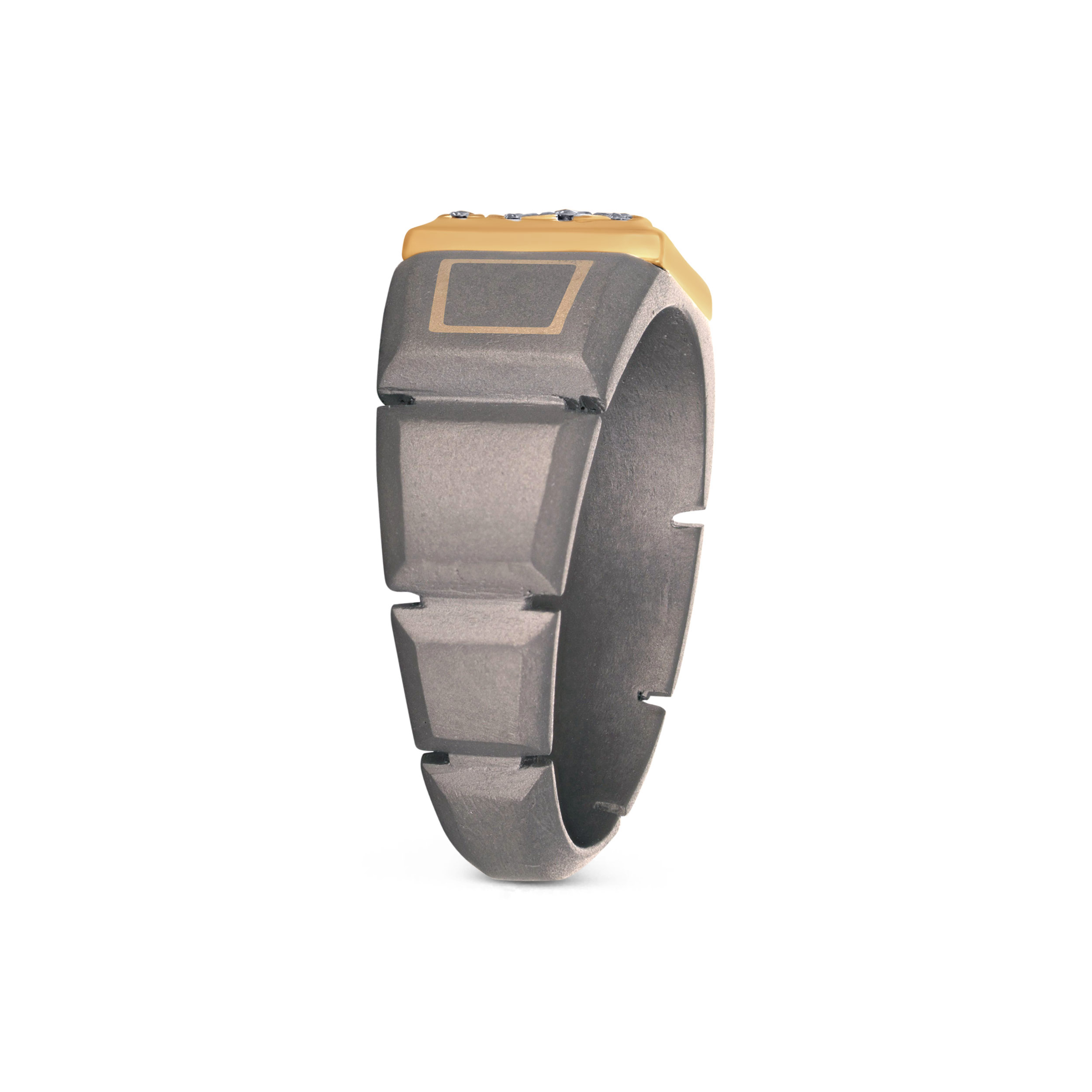 Bold in form yet measured in detail, this ring redefines contemporary masculinity. Crafted in matte-finished titanium, its structured band frames a square grid of diamonds set within a gold bezel, delivering focused brilliance without excess. Clean lines, strong geometry, and a confident silhouette make it a refined statement for men who value precision and presence.