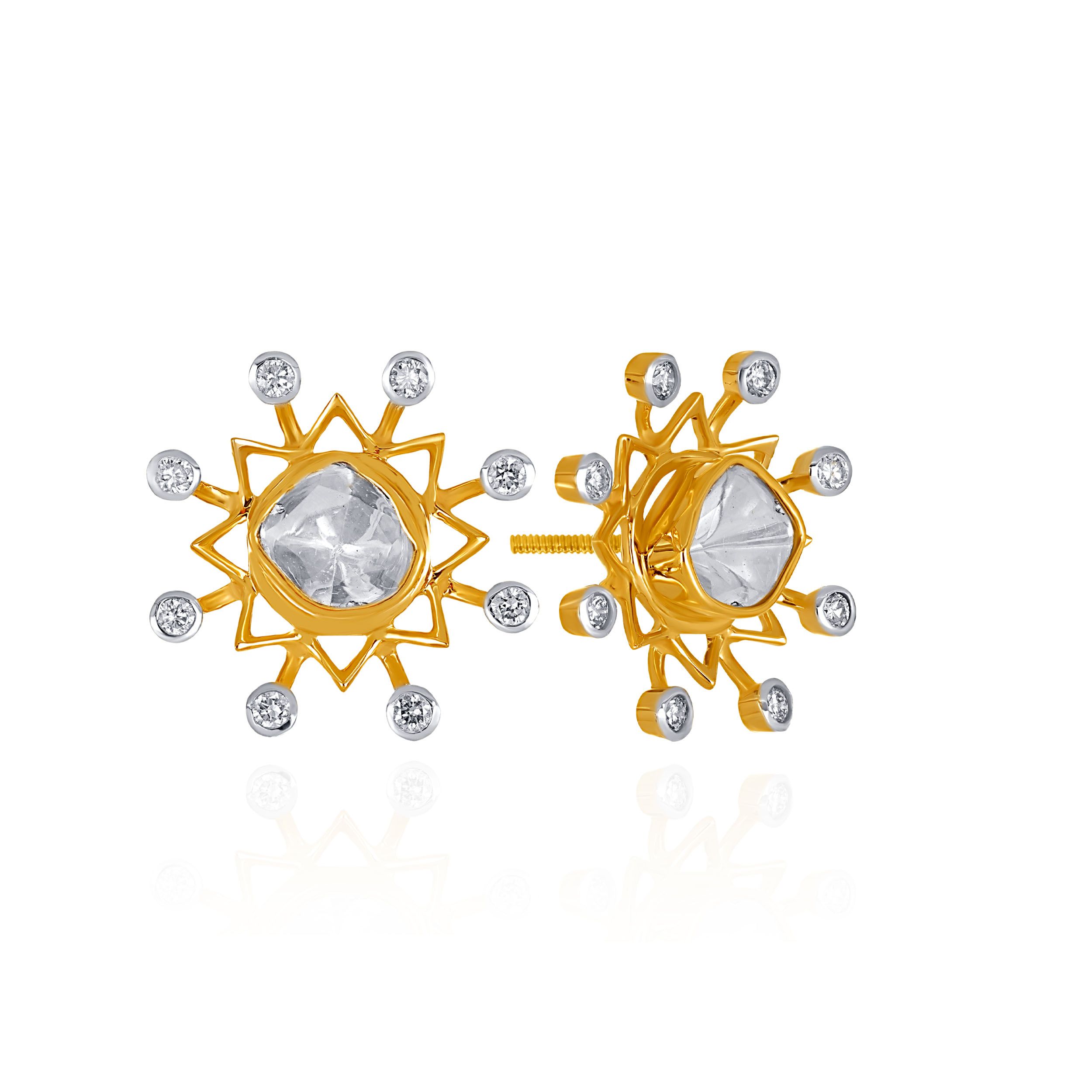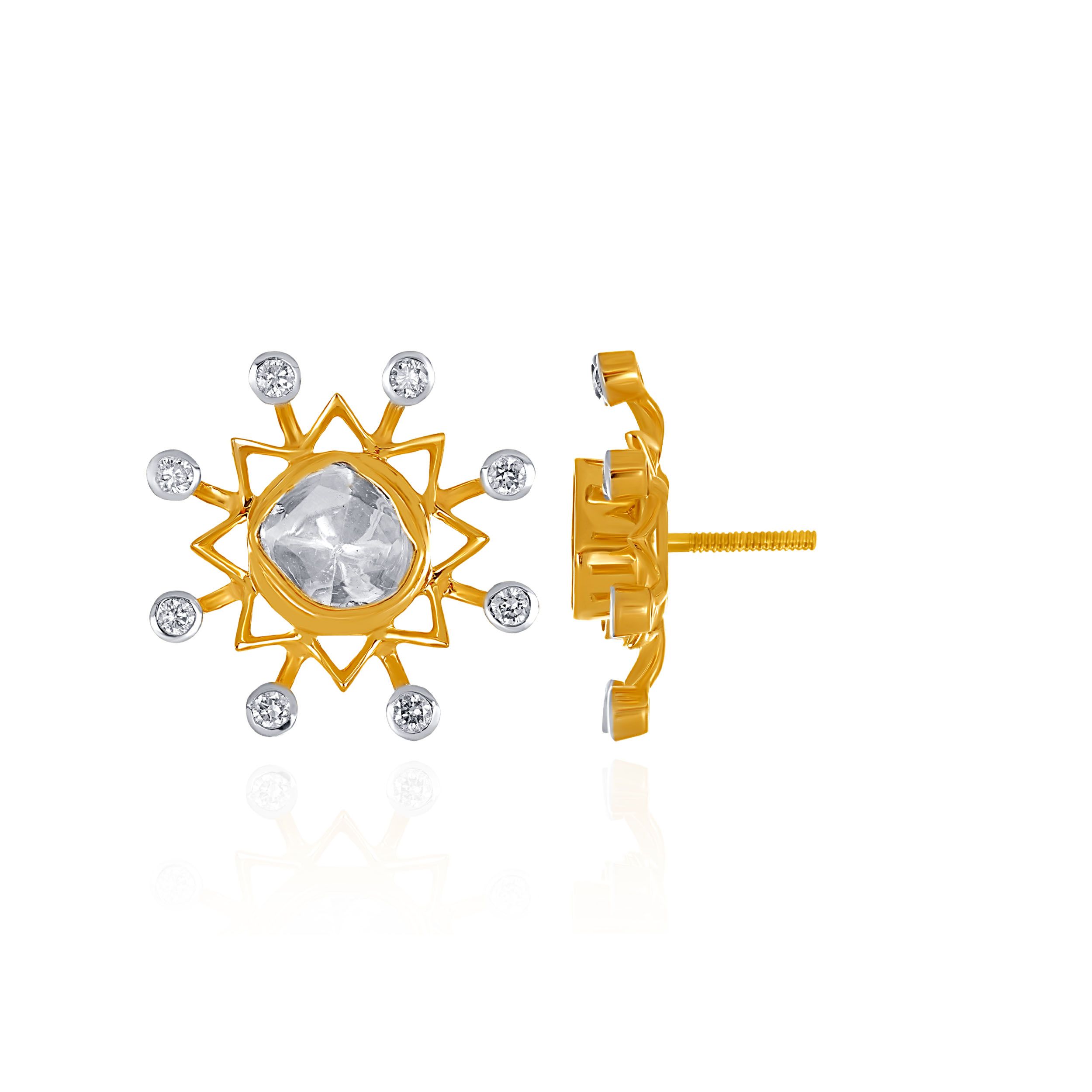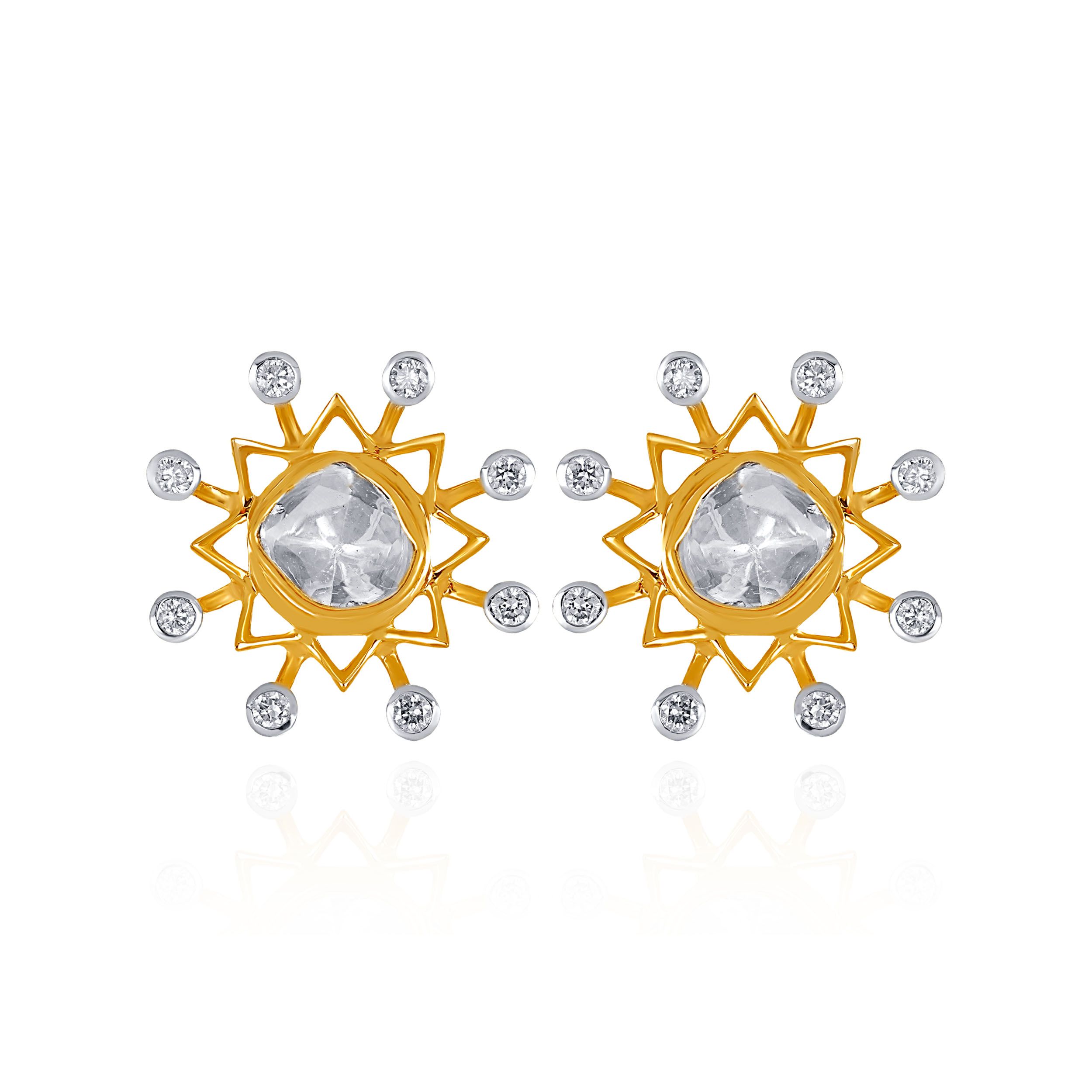 This design features a striking sunburst silhouette. A radiant take on classic Polki, these stud earrings showcase an asymmetrical uncut Polki stone framed by a structured sunburst motif. Accented with delicate diamonds, the design captures light beautifully while maintaining a clean, modern edge. Style them with an ivory or gold-toned saree, or pair with a sleek Western ensemble for a contemporary evening statement.