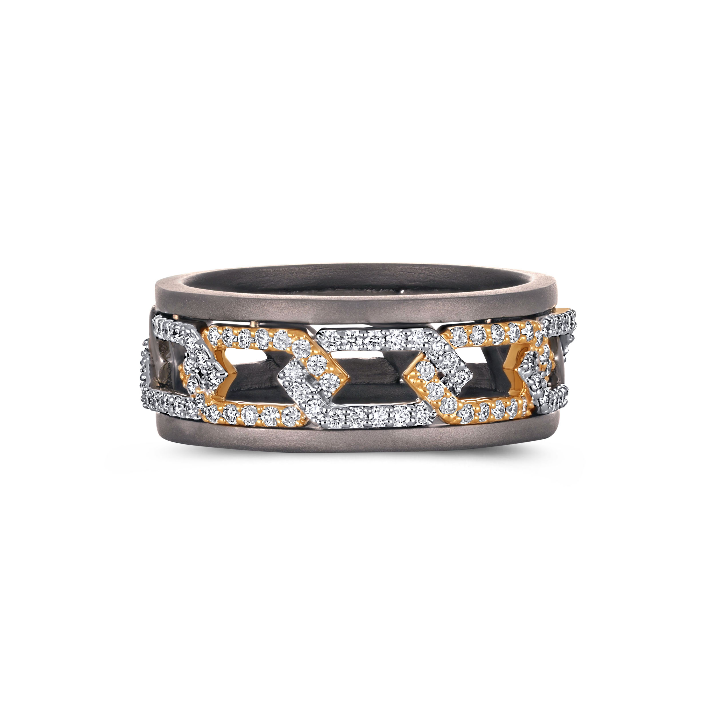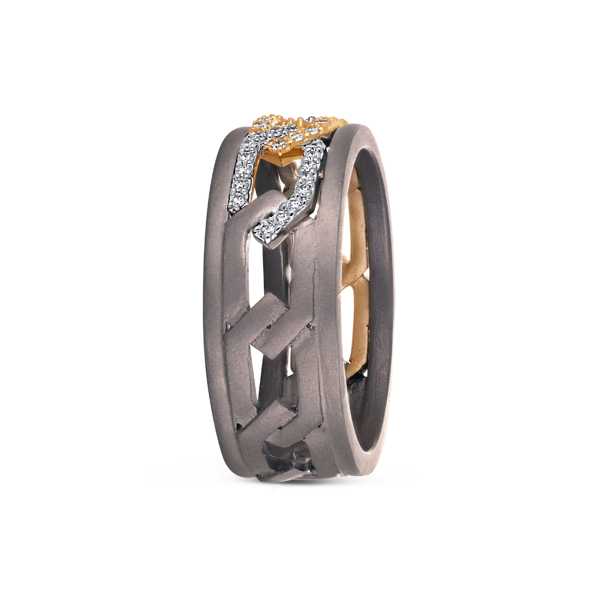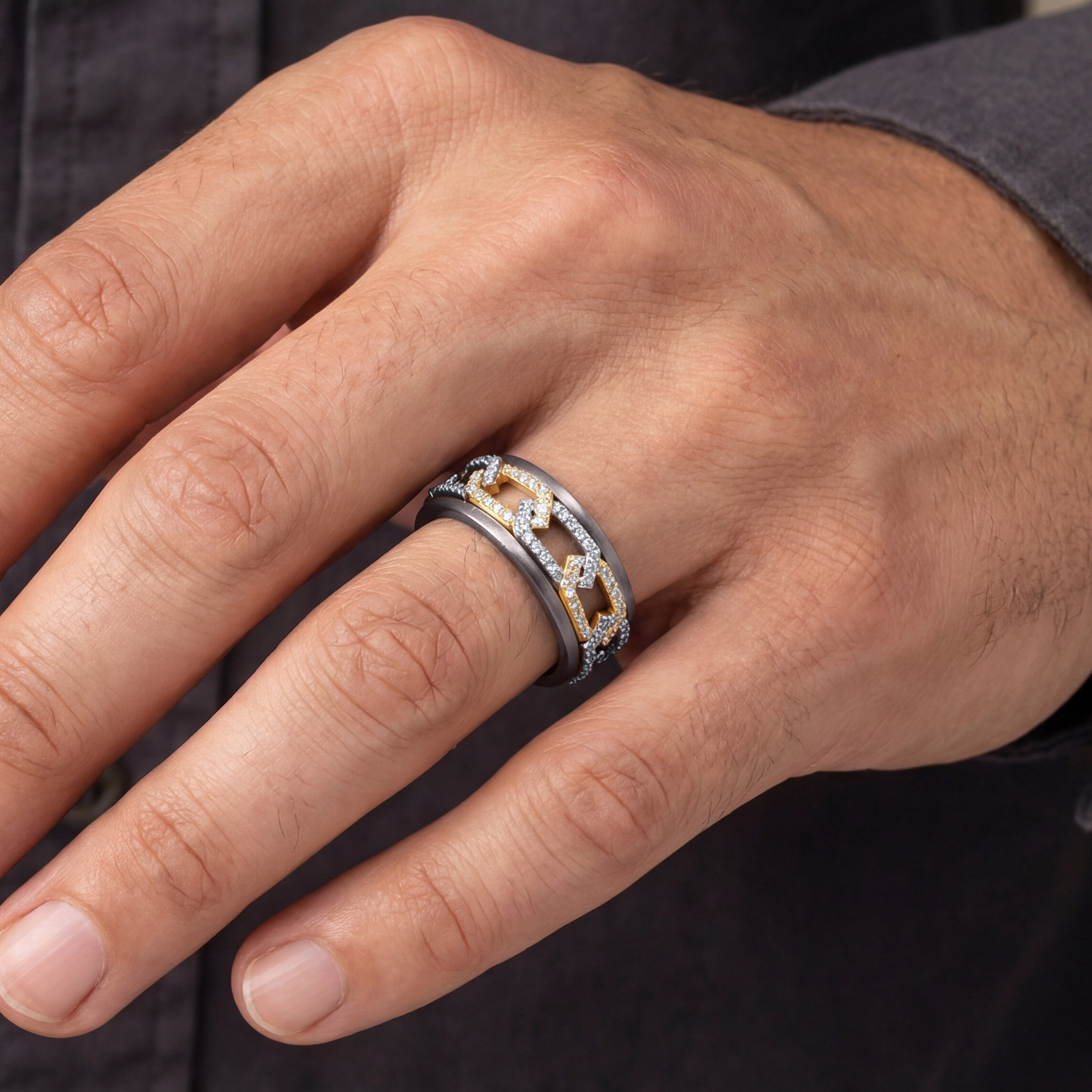 This diamond-encrusted titanium ring channels strength through a bold chain-link design. A matte titanium band anchors the look, while interlocking gold and diamond-accented links add contrast and precision. Rugged yet refined, it’s crafted for men who appreciate resilience, structure, and modern design with intent.