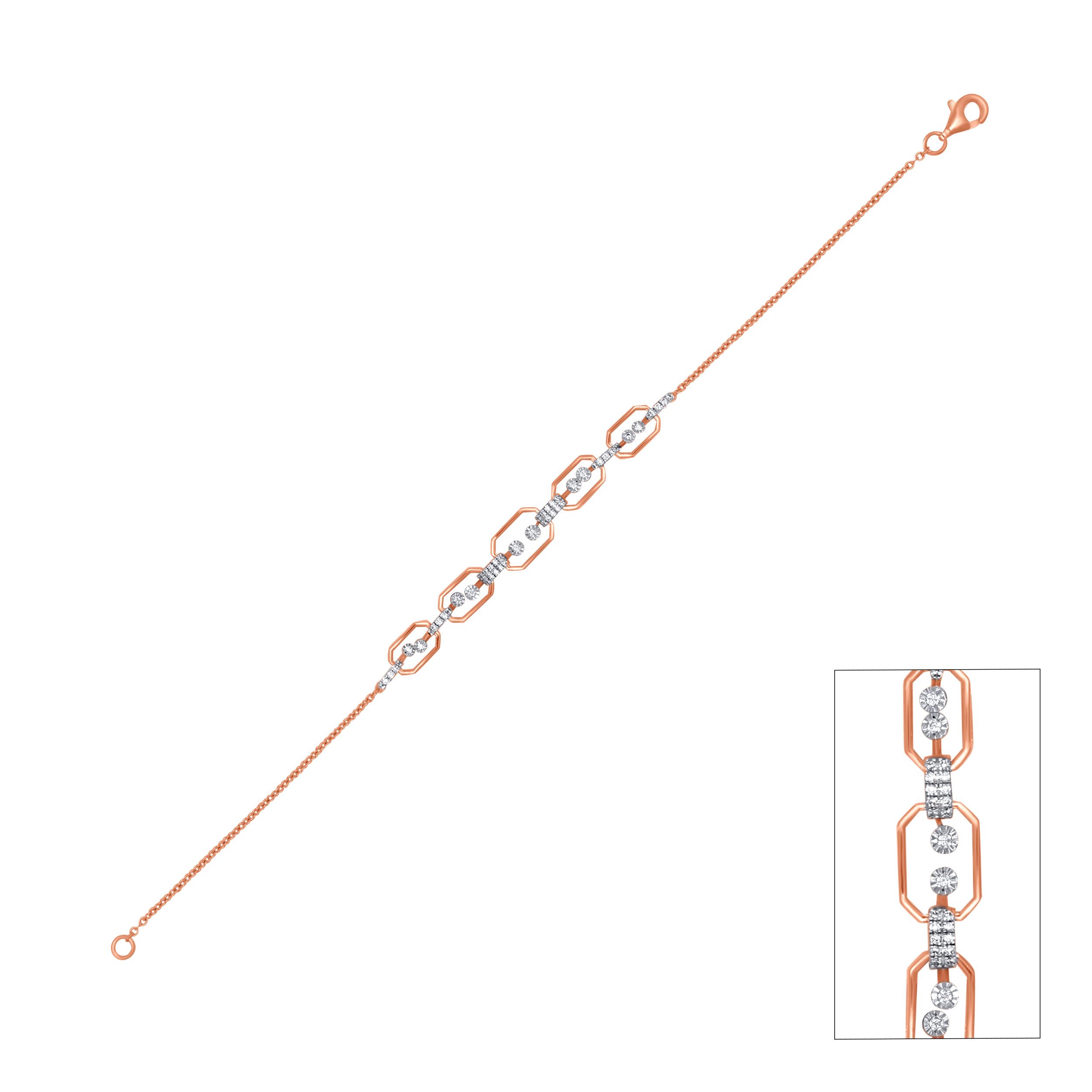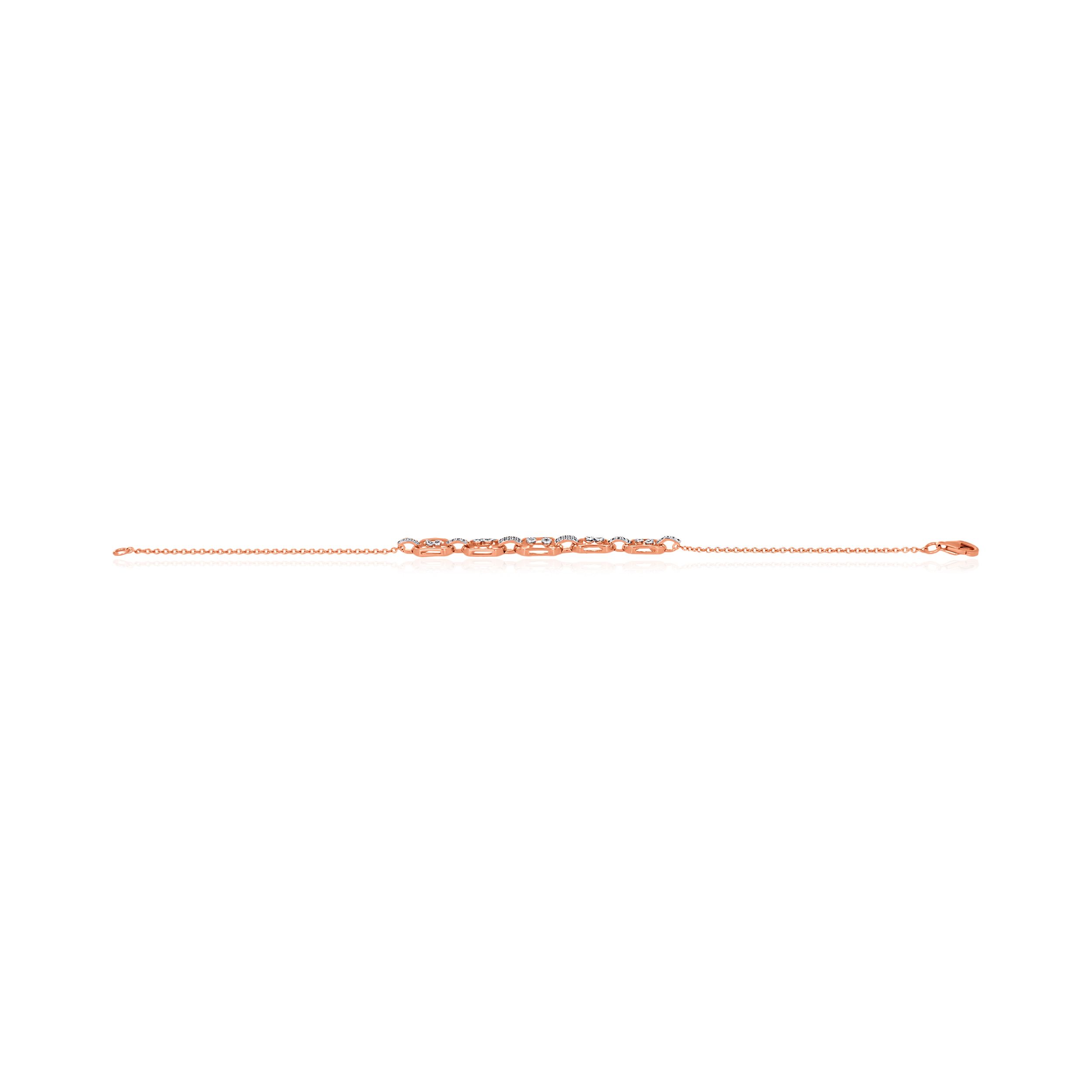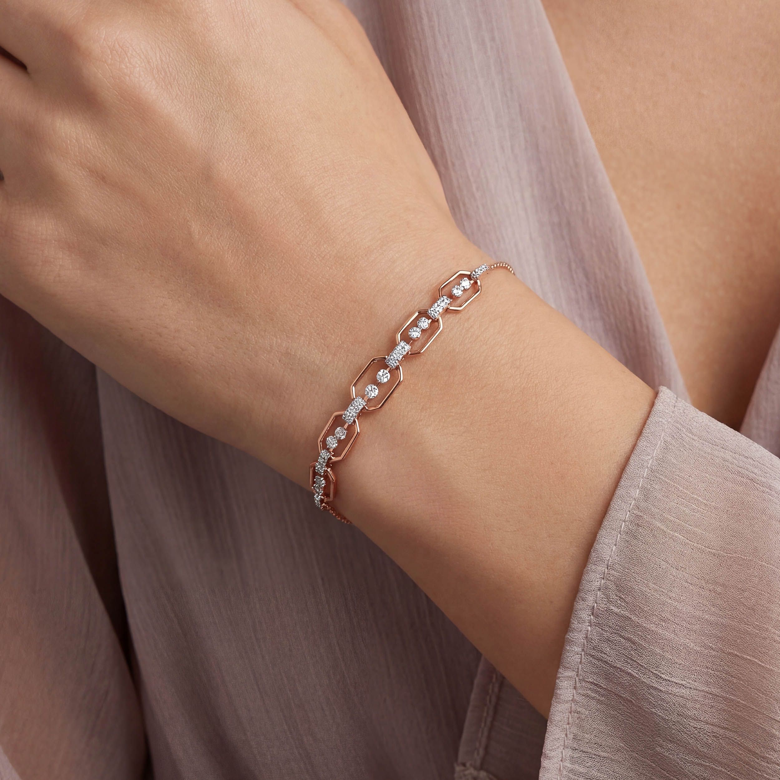 Embrace modern minimalism with this diamond bracelet. It pairs elongated geometric links with precisely set diamonds for a balanced, architectural look. The slim profile and subtle contrast make it an easy essential, perfect for layering or wearing solo with understated confidence. Complement it with a flowing dress to let its quiet elegance take centre stage.