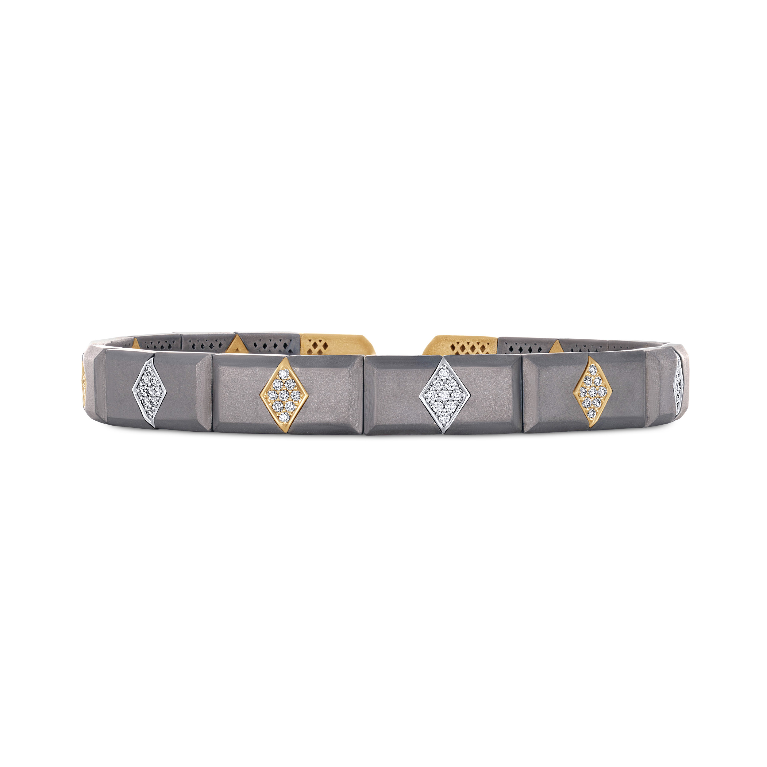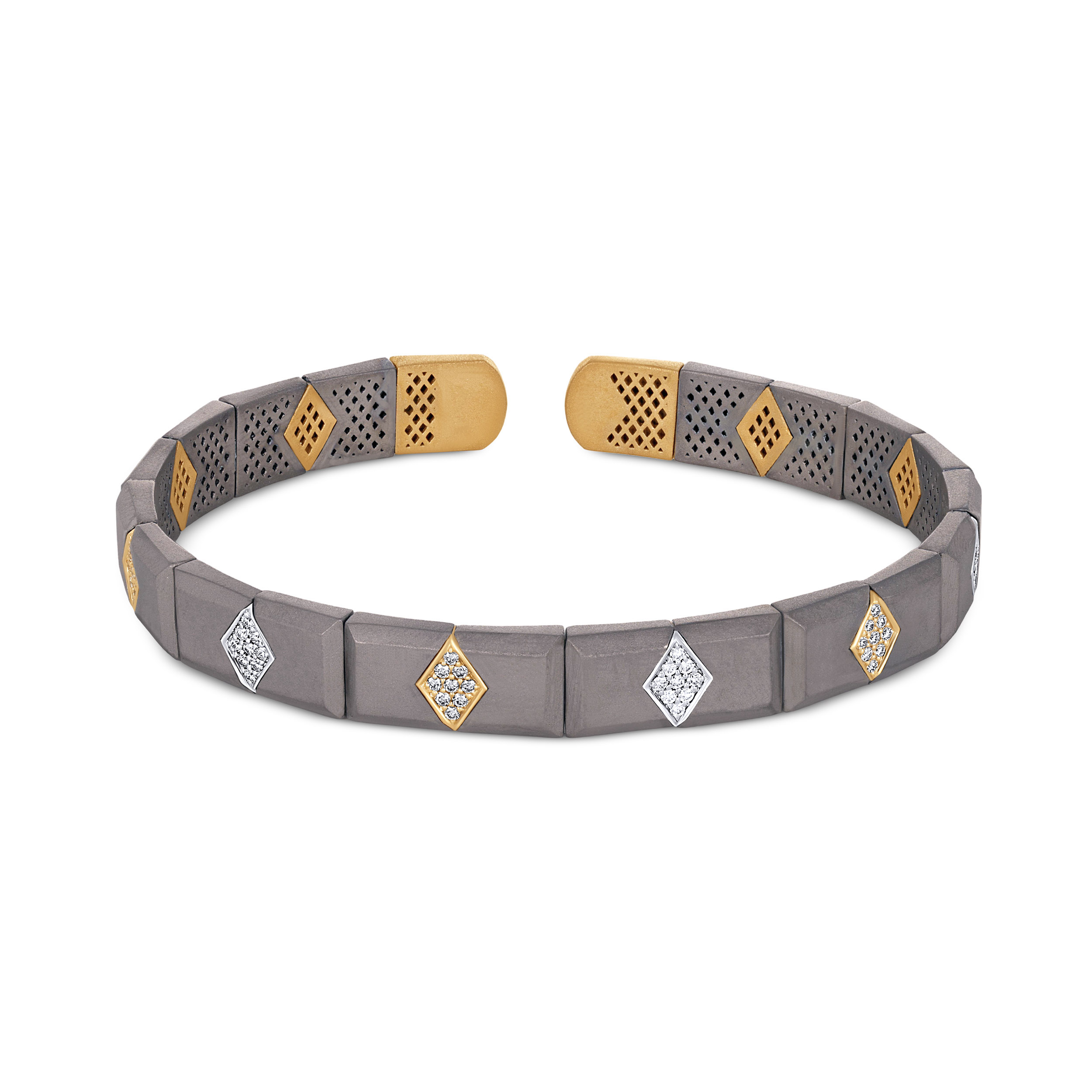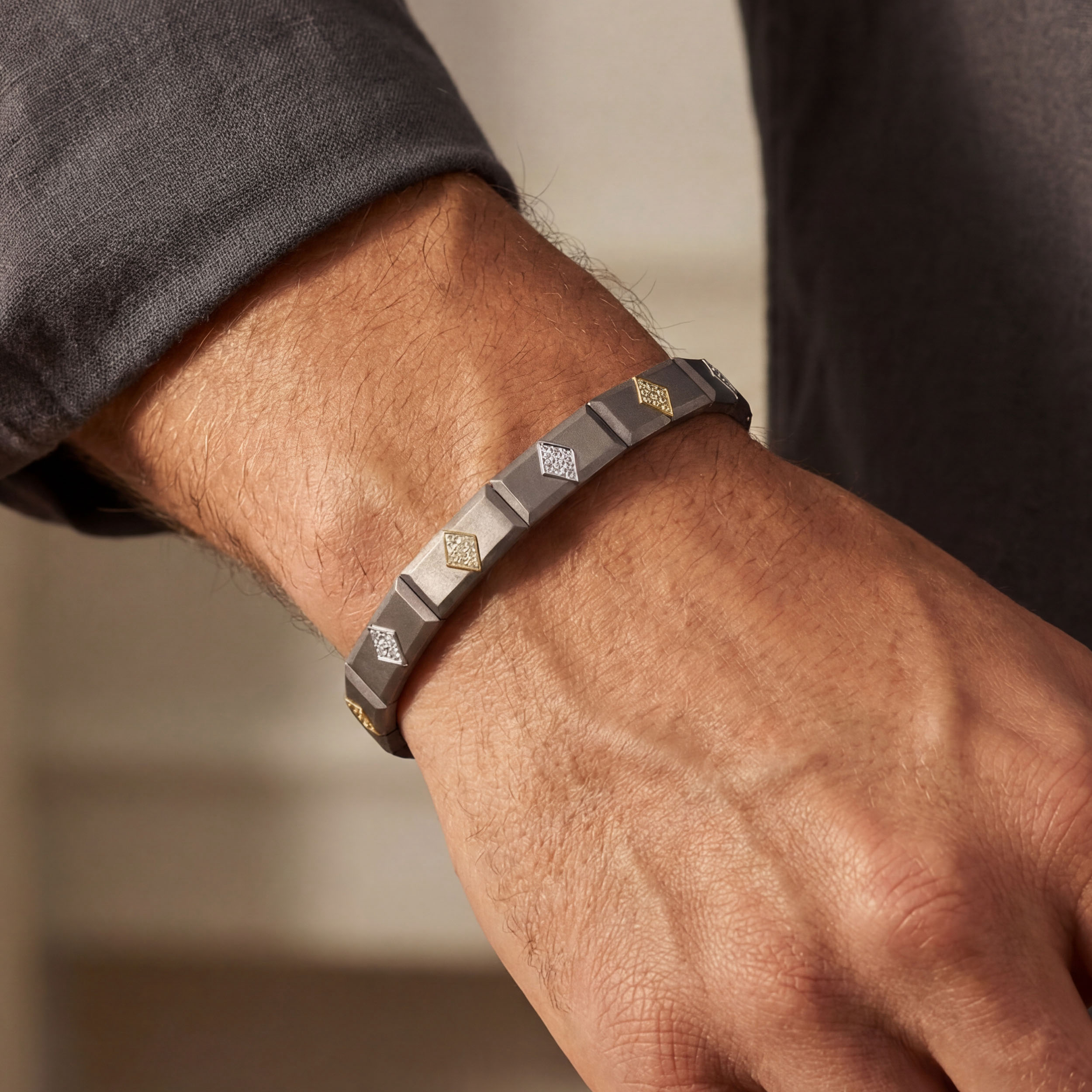 Forged with the discipline of aerospace engineering, this titanium diamond kada channels raw structural power through a precise grid pattern. Matte titanium links create a solid, armour-like base, punctuated by gold-accented diamond motifs that echo controlled brilliance. Lightweight yet uncompromising, it balances industrial geometry with refined detailing. A symbol of order, strength, and authority, built for men who command without noise.