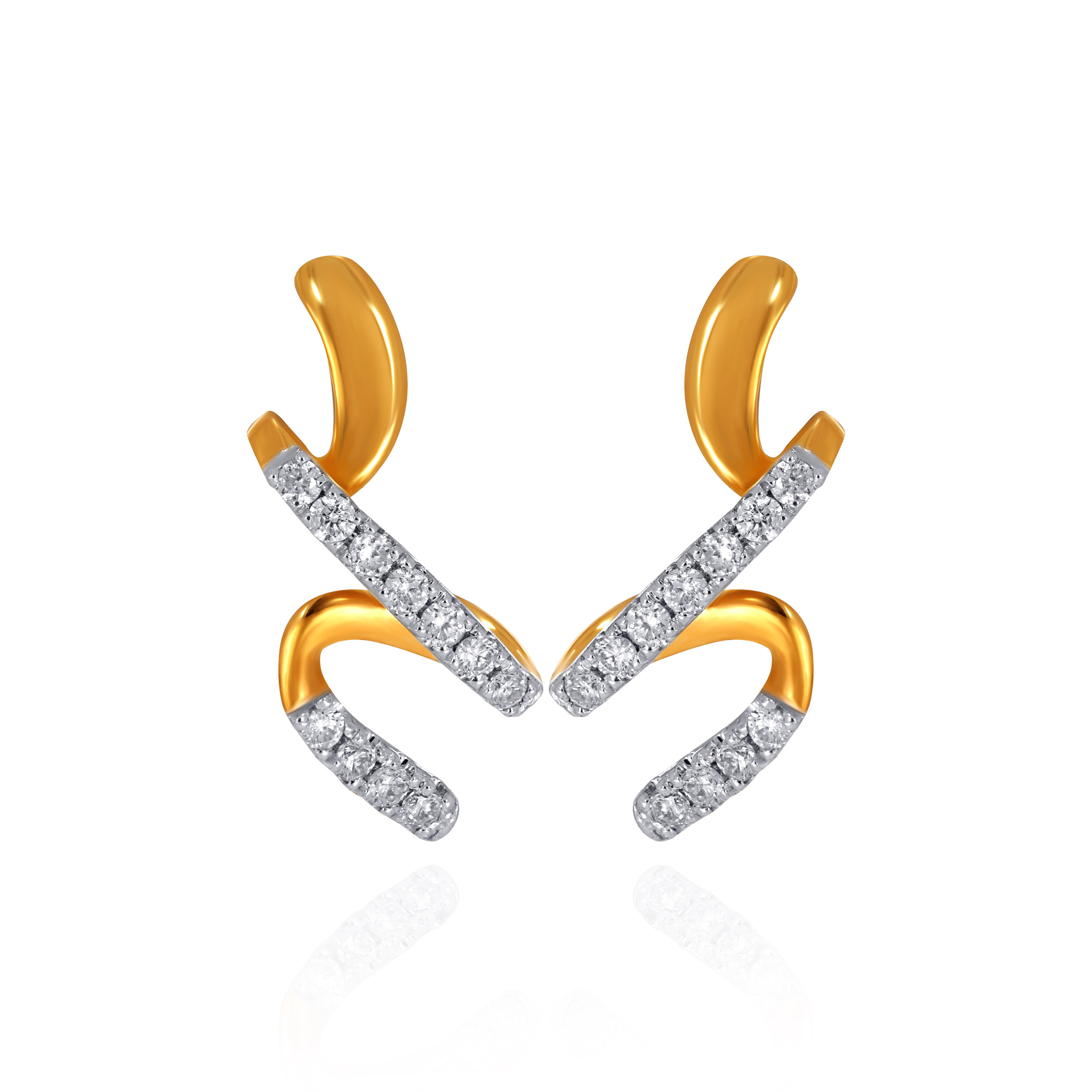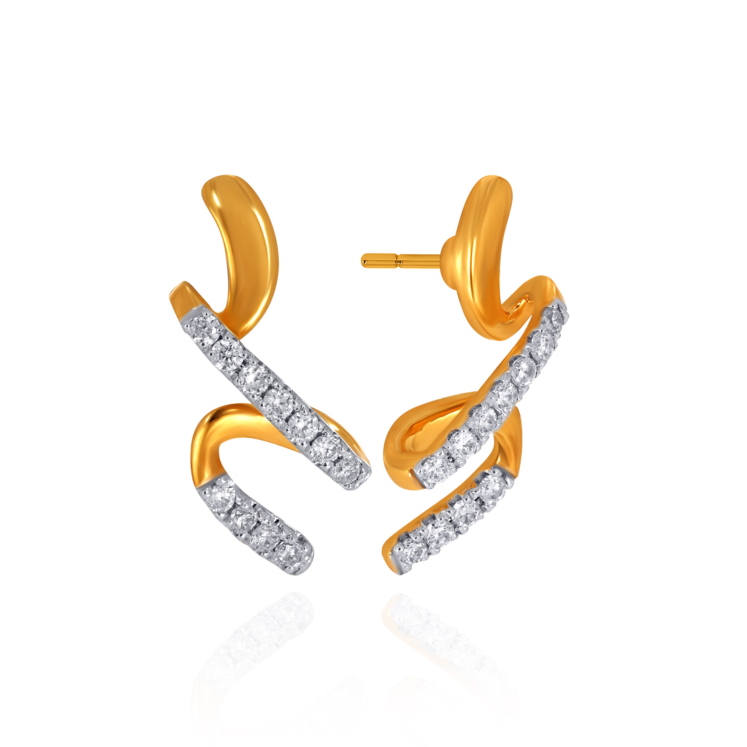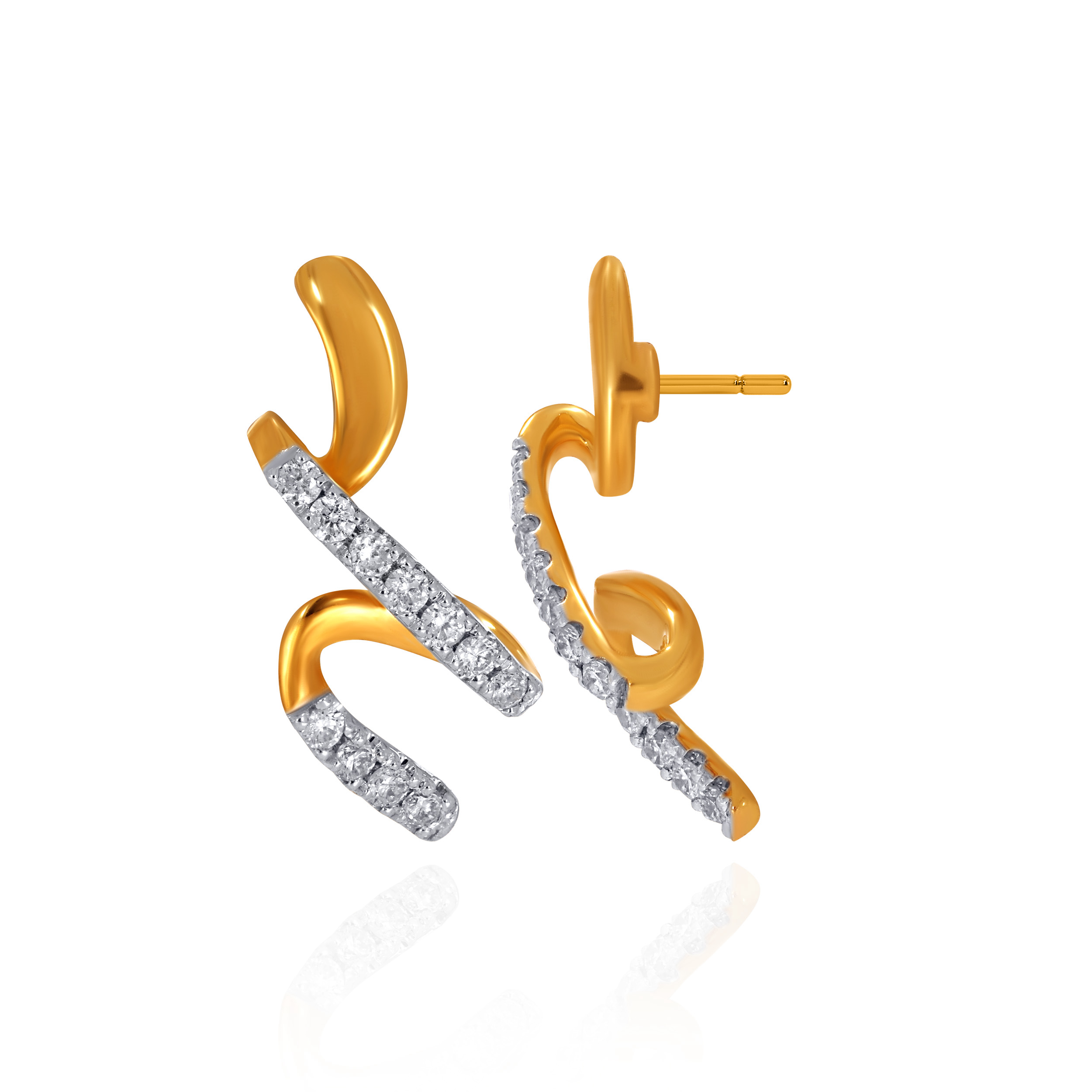 Add a playful yet refined touch to your ensemble with these dynamic diamond studs. Sculpted gold swirls intertwine with sleek, diagonal ribbons of brilliant diamonds, creating a sense of fluid movement and light. Organic and expressive, the design offers a modern twist on classic studs, effortlessly striking from every angle and perfect for elevated everyday wear.
