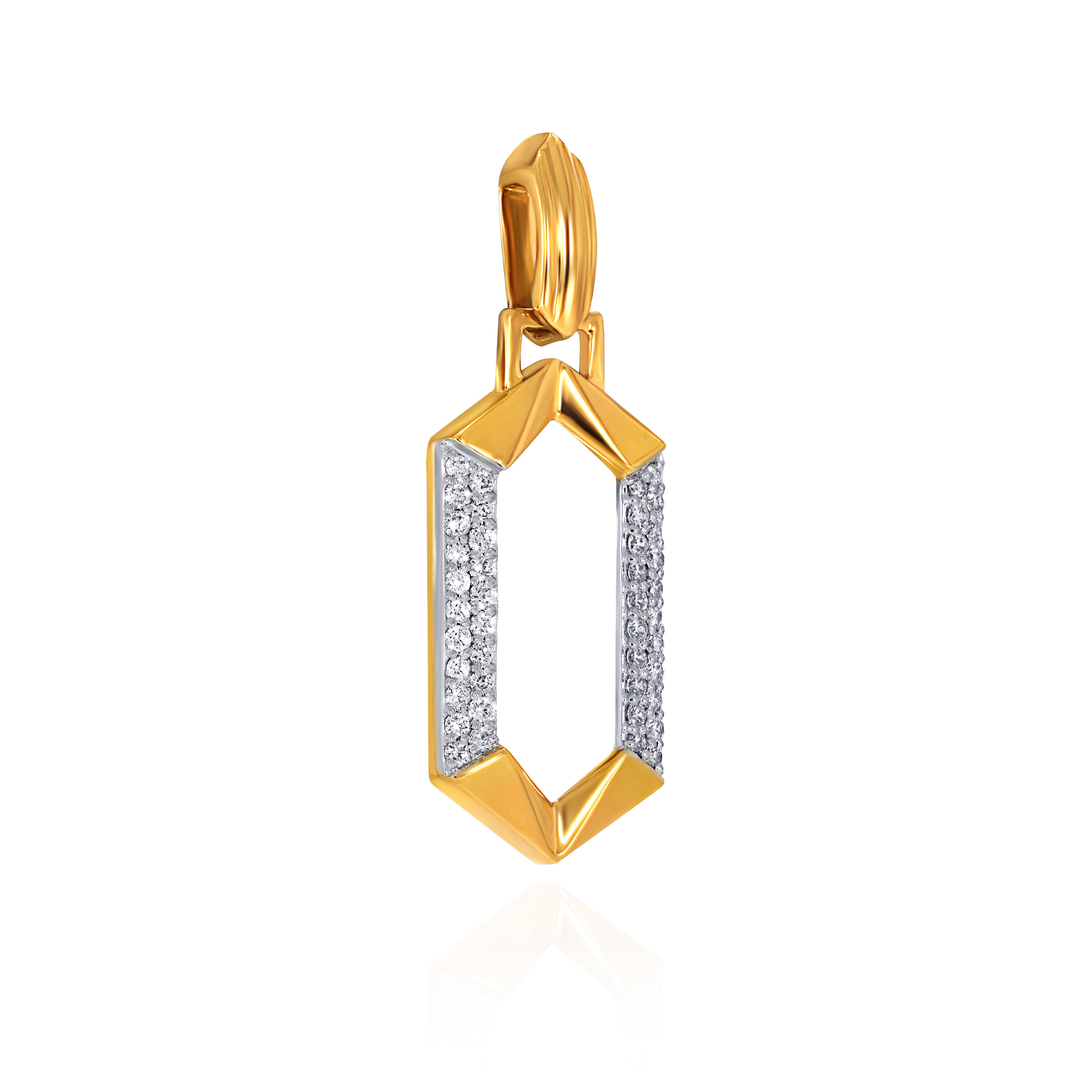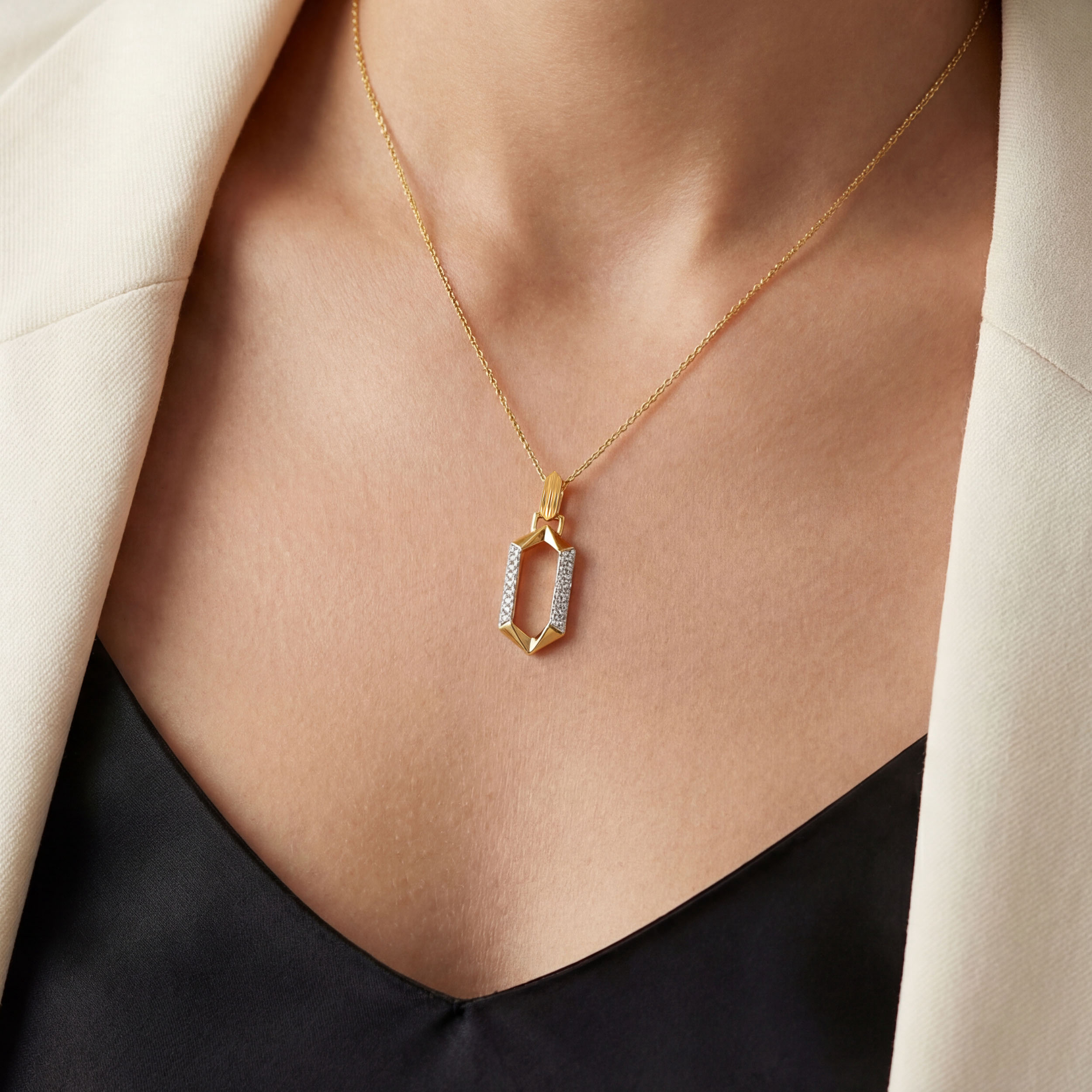 A striking play of symmetry and light. This geometric diamond pendant pairs sculpted gold with radiant diamond accents, creating a modern piece that feels both architectural and effortlessly elegant.