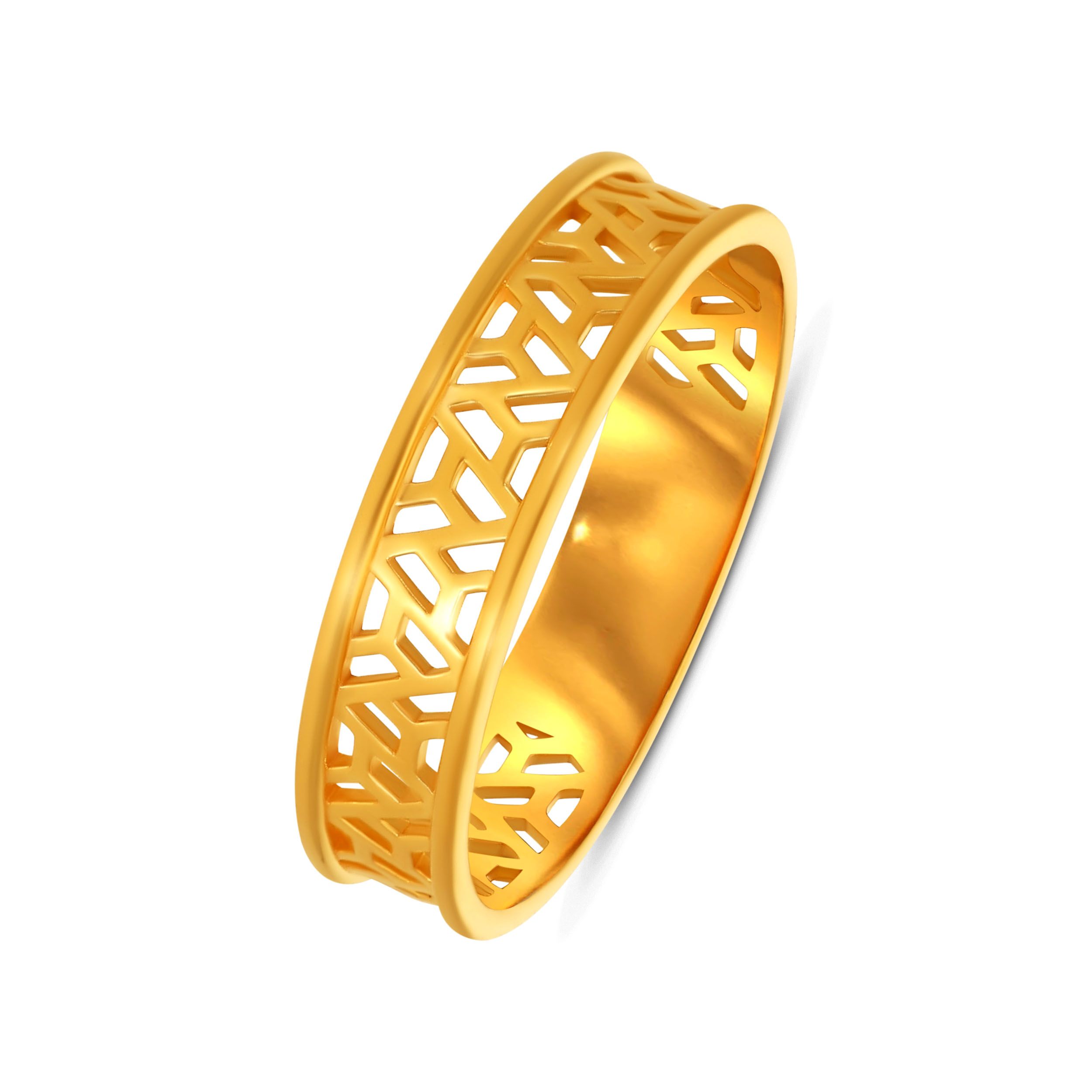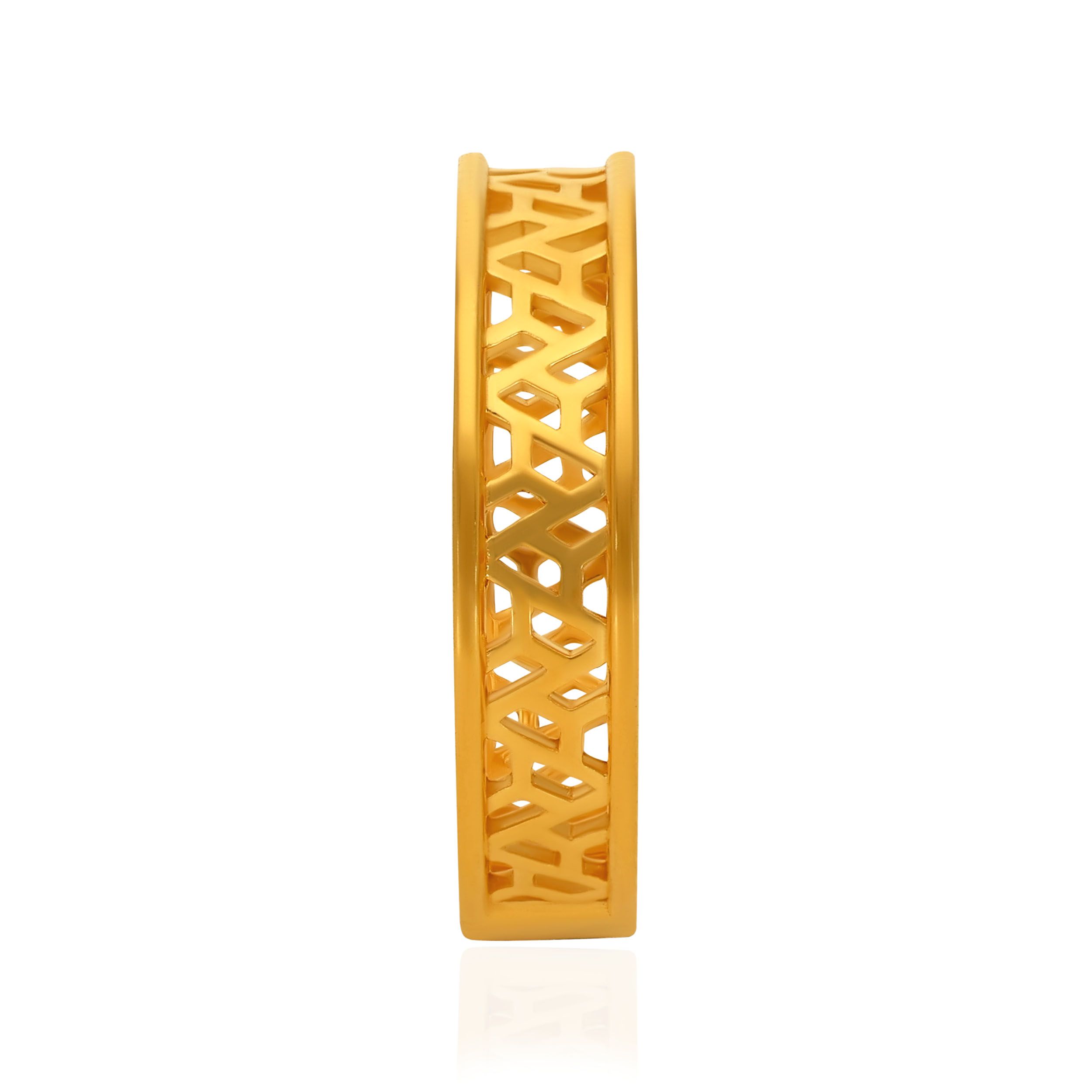 A bold play of structure and shine. This ring features an open lattice pattern carved into a wide gold band, balancing strength with modern design. Light passes through the geometric cutwork, adding a sharp edge. A rugged yet refined ring for everyday distinction.