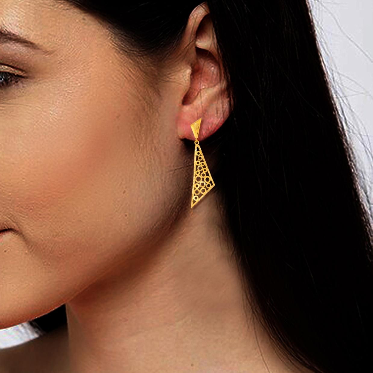 This innovative design of earrings is rare to find. Once you get it seize it to grab the attention of others. The triangular filigree gold earring has all-over filigree work in a circular design. Wear it on special occasions.