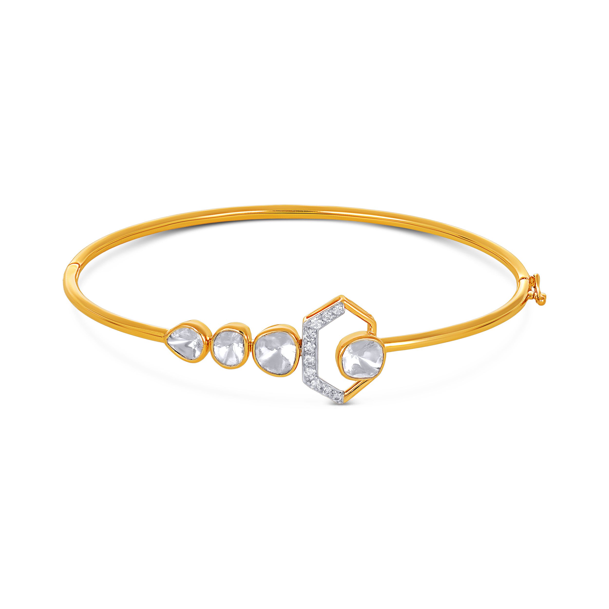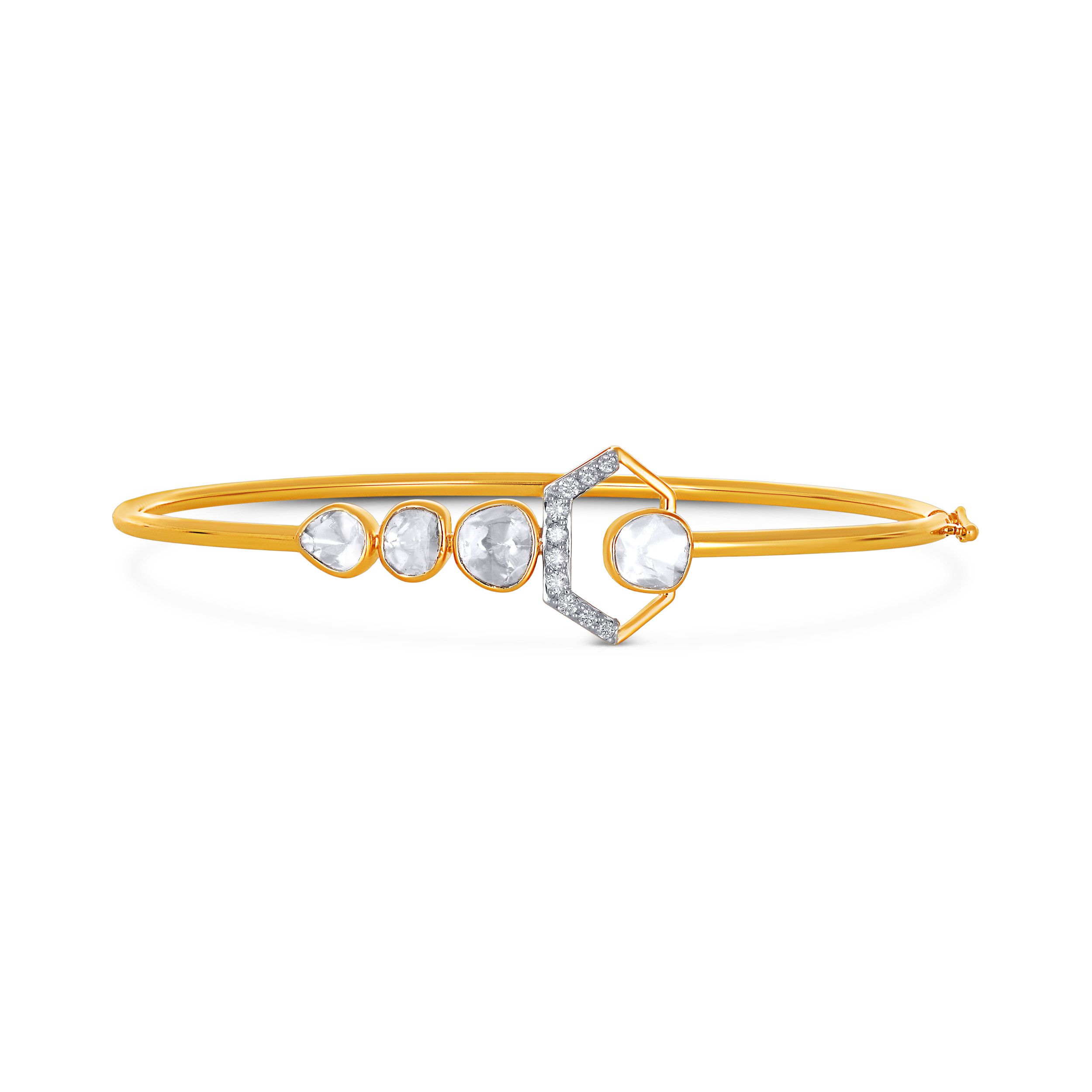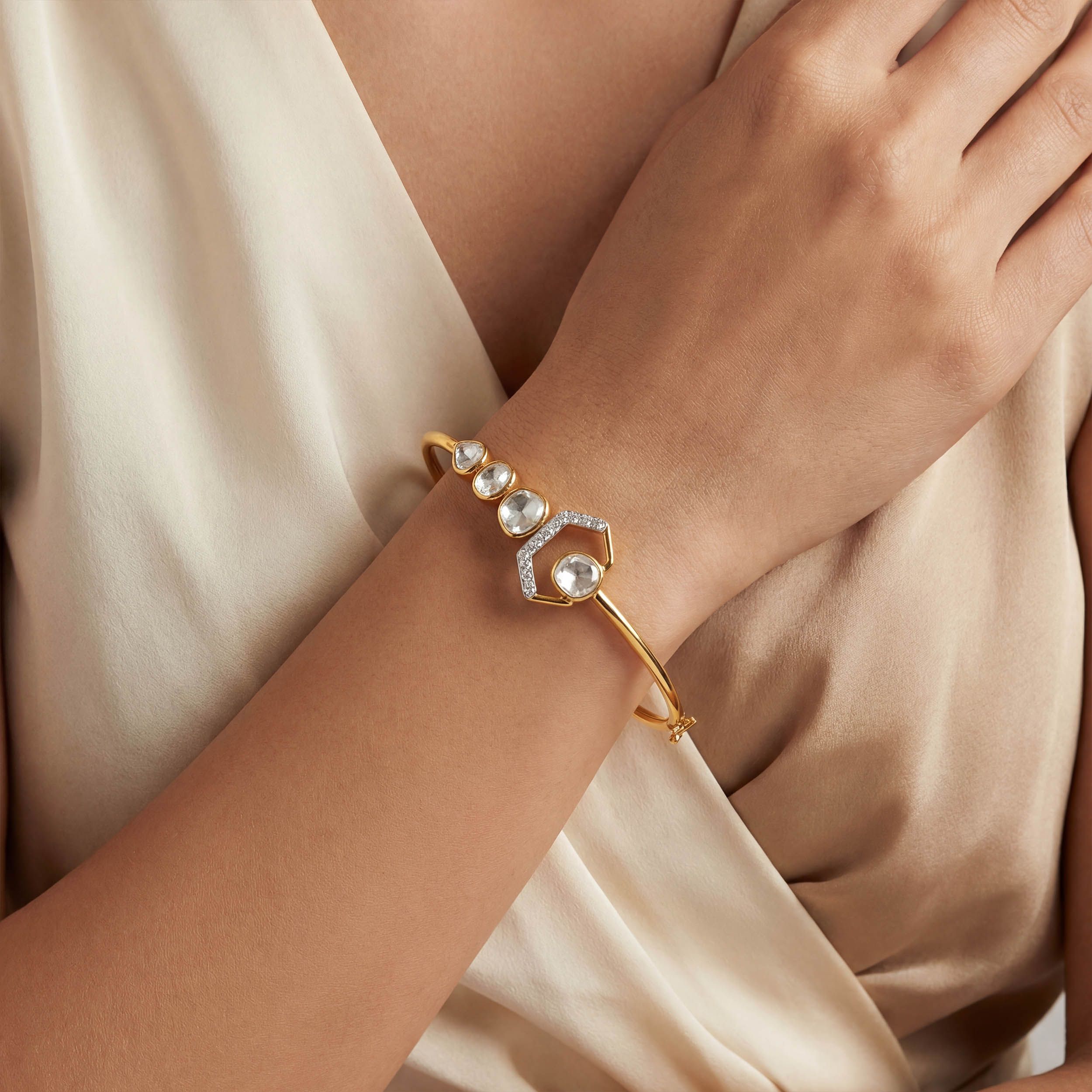Modern geometry meets timeless shimmer in this delicately crafted bracelet, where raw Polki pairs seamlessly with vibrant green gemstones. The interplay of textures and tones feels rich yet understated, while the fine adjustable chain keeps it light and effortless, making it a versatile staple that feels both contemporary and unmistakably refined.