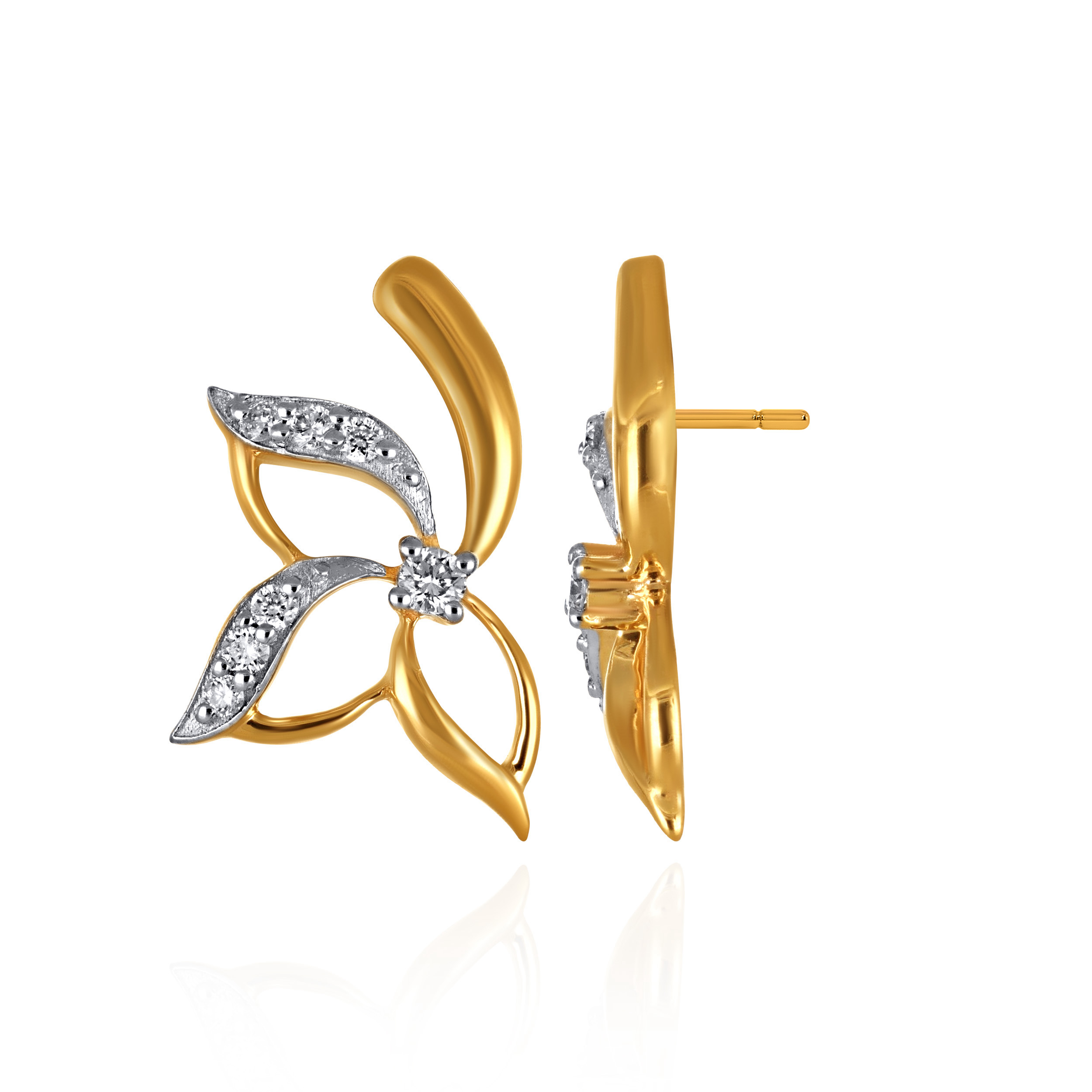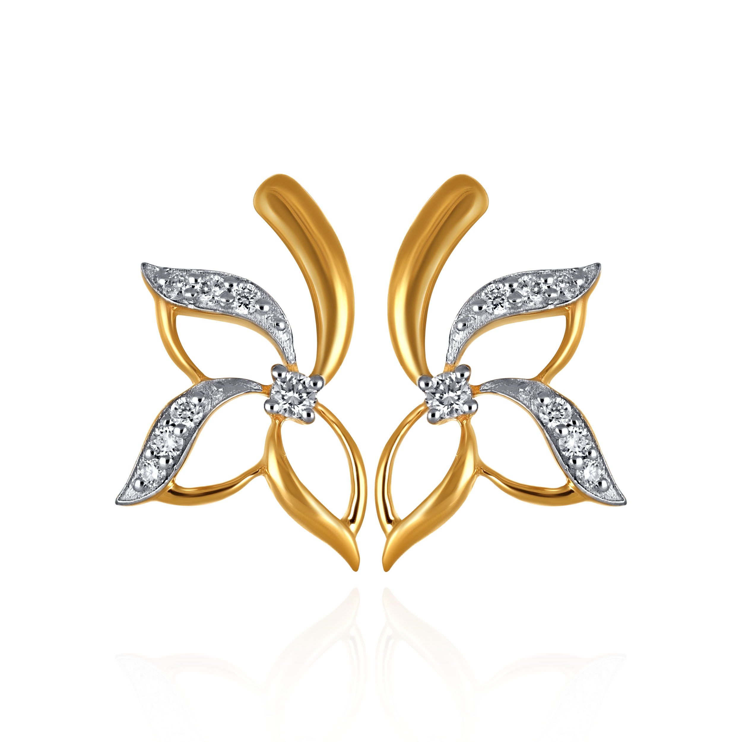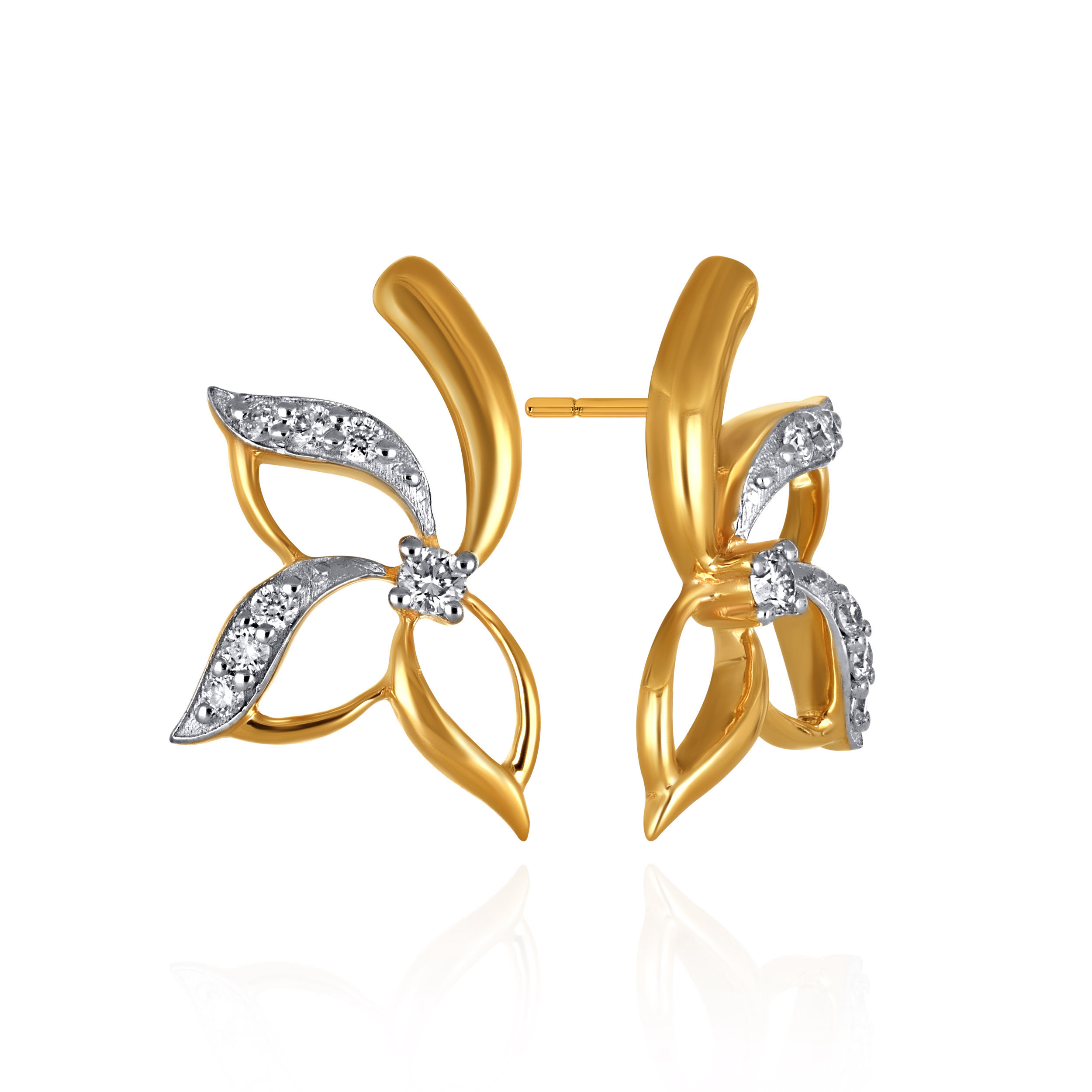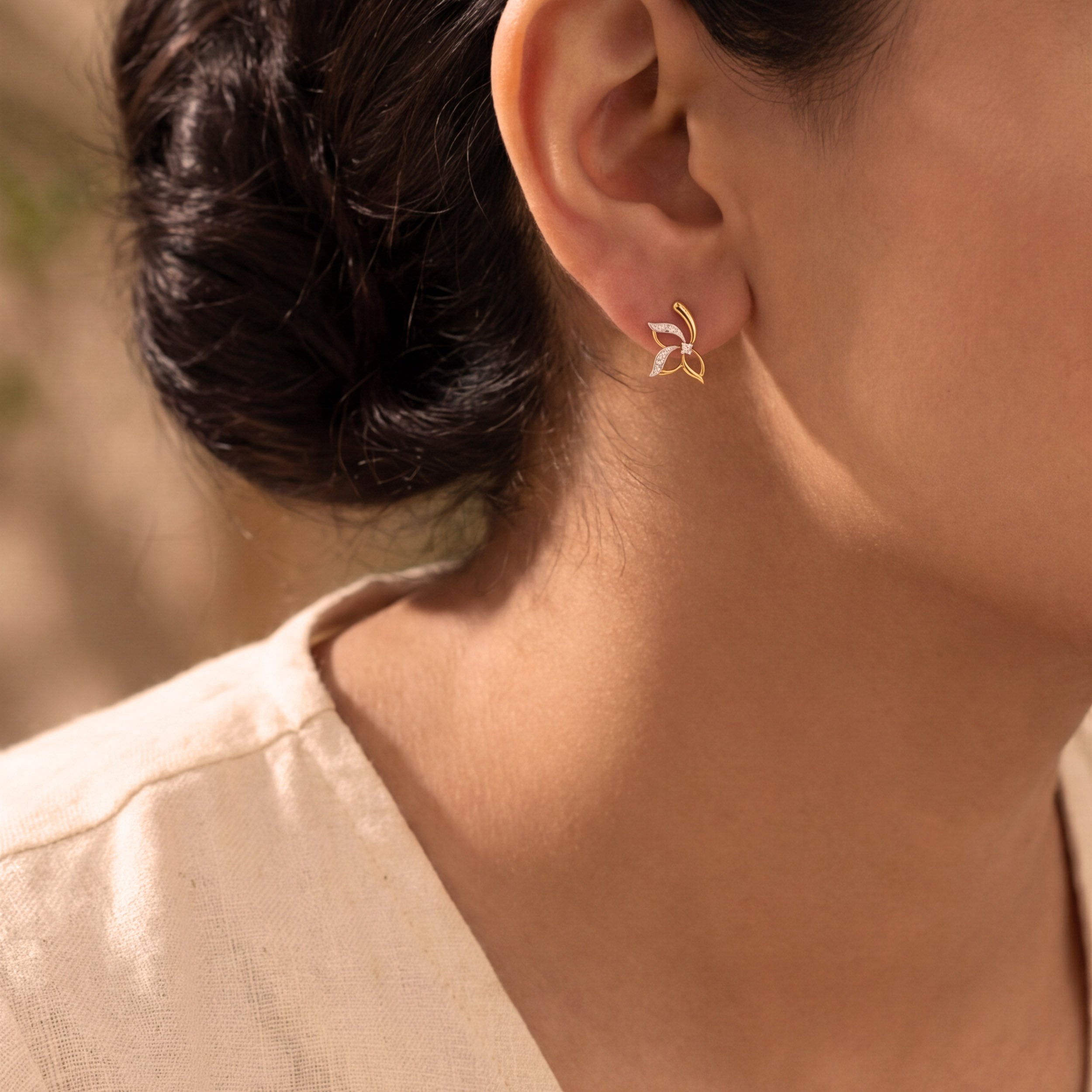 Art meets nature in these captivating diamond studs. A floral-inspired asymmetrical blossom with gracefully curved petals, they radiate fine luxury with subtle brilliance at the centre. Style them with a silk organza saree for an elegant evening affair, or pair with a tailored Indo-Western ensemble to add a refined, feminine accent.