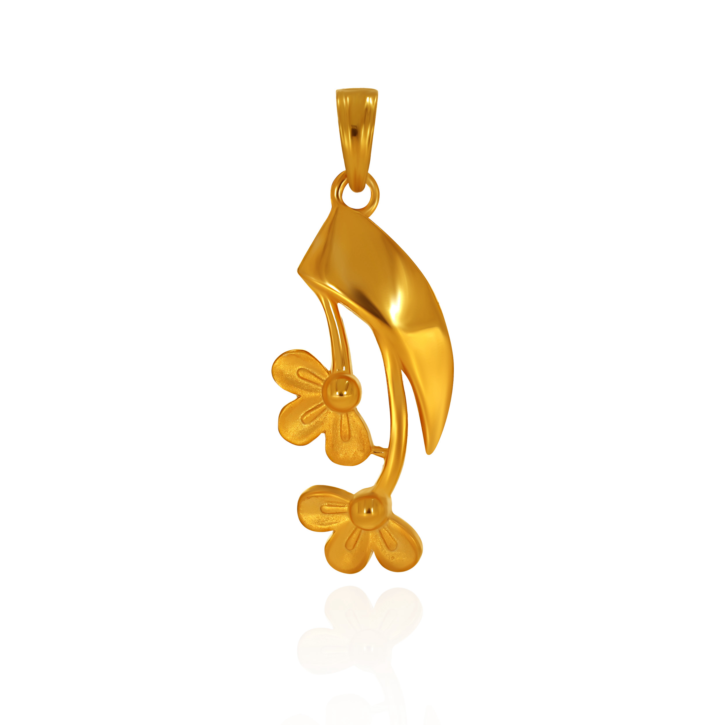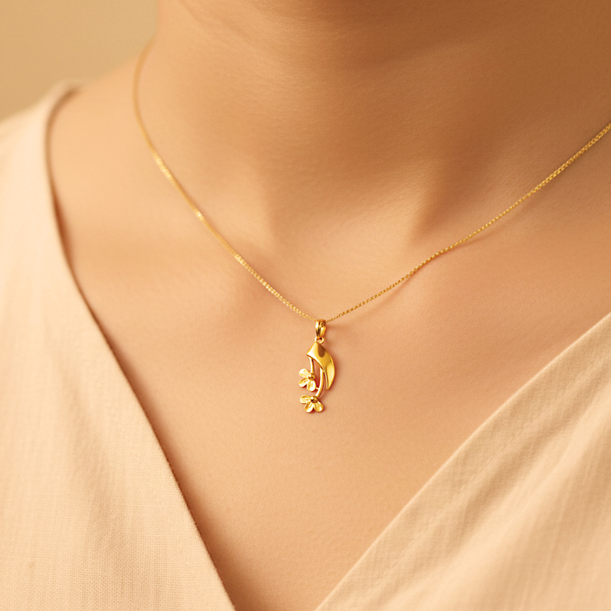 Embrace the beauty of nature with this exquisitely crafted gold pendant, featuring a sleek, contemporary leaf-like silhouette that forms a graceful canopy for delicate blooming accents. Light and refined, it’s a signature piece for women who appreciate jewellery that feels both sophisticated and soulful.