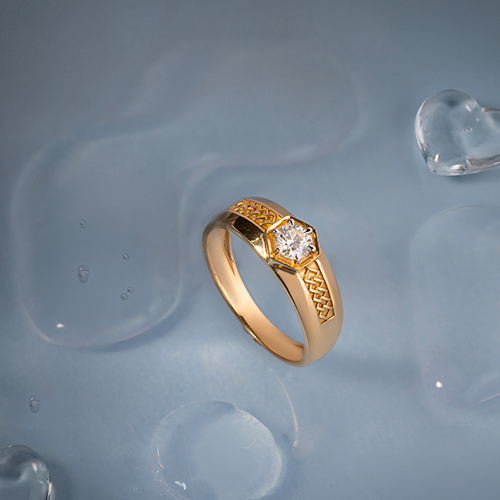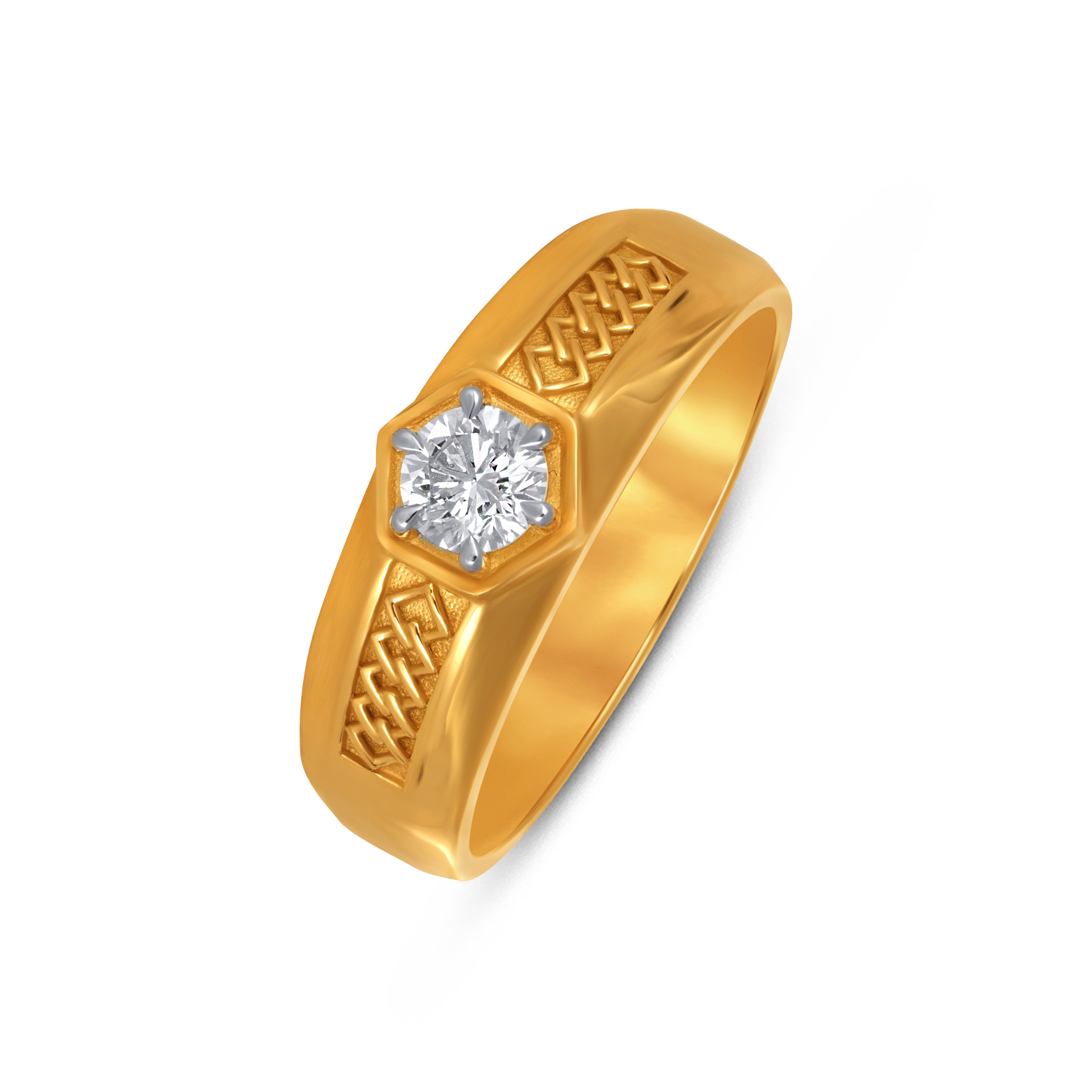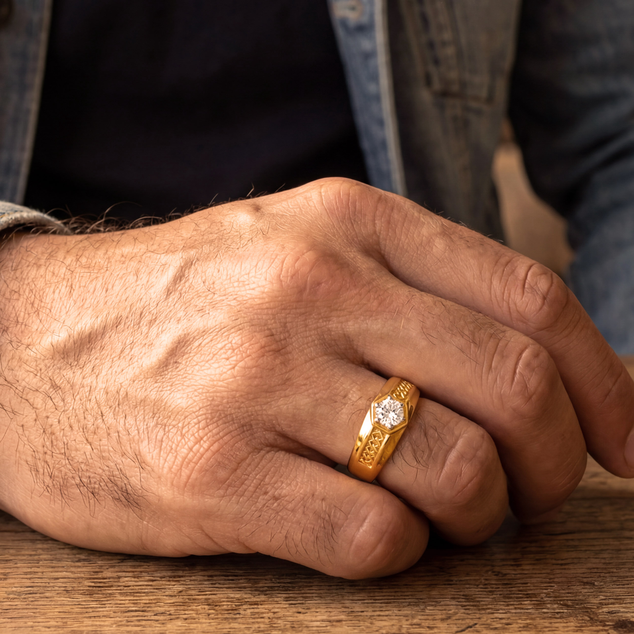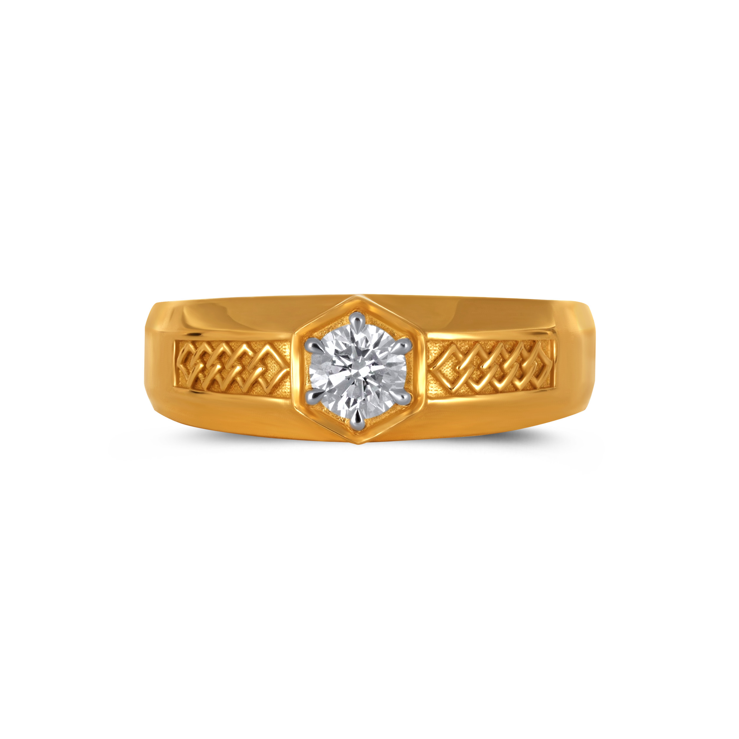 Designed for the man who leads with confidence and style, this diamond ring redefines the classic band with its hexagonal structure and intricate fretwork detailing. The dual-tone finish creates a visual impact that feels both royal and contemporary.